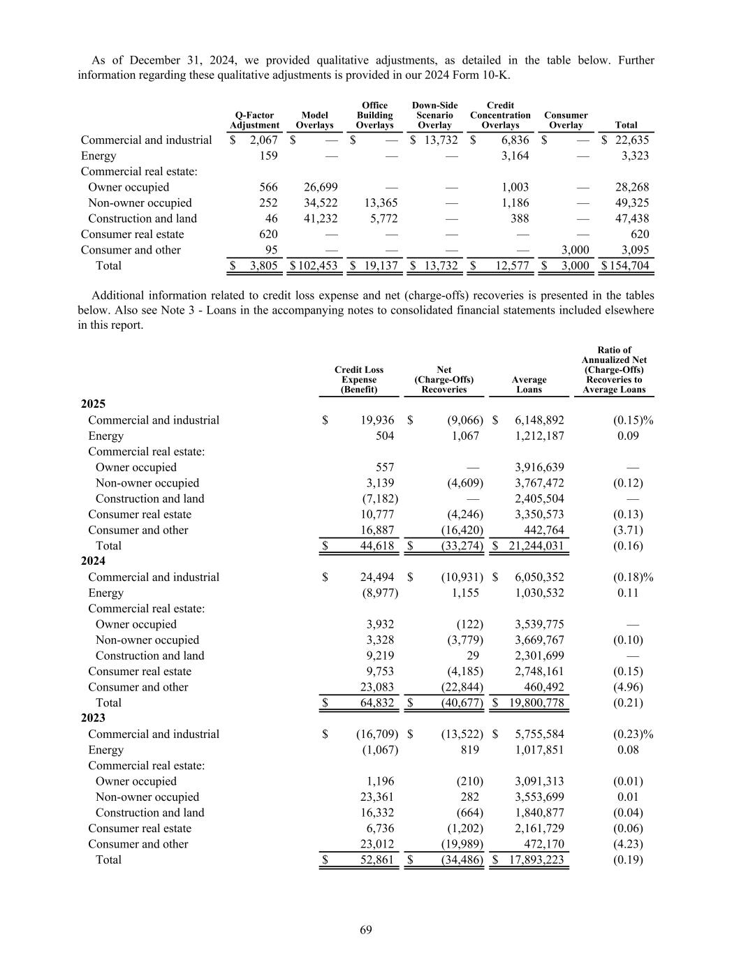 As of December 31, 2024, we provided qualitative adjustments, as detailed in the table below. Further information regarding these qualitative adjustments is provided in our 2024 Form 10-K. Q-Factor Adjustment Model Overlays Office Building Overlays Down-Side Scenario Overlay Credit Concentration Overlays Consumer Overlay Total Commercial and industrial $ 2,067 $ — $ — $ 13,732 $ 6,836 $ — $ 22,635 Energy 159 — — — 3,164 — 3,323 Commercial real estate: Owner occupied 566 26,699 — — 1,003 — 28,268 Non-owner occupied 252 34,522 13,365 — 1,186 — 49,325 Construction and land 46 41,232 5,772 — 388 — 47,438 Consumer real estate 620 — — — — — 620 Consumer and other 95 — — — — 3,000 3,095 Total $ 3,805 $ 102,453 $ 19,137 $ 13,732 $ 12,577 $ 3,000 $ 154,704 Additional information related to credit loss expense and net (charge-offs) recoveries is presented in the tables below. Also see Note 3 - Loans in the accompanying notes to consolidated financial statements included elsewhere in this report. 2025 Commercial and industrial $ 19,936 $ (9,066) $ 6,148,892 (0.15)% Energy 504 1,067 1,212,187 0.09 Commercial real estate: Owner occupied 557 — 3,916,639 — Non-owner occupied 3,139 (4,609) 3,767,472 (0.12) Construction and land (7,182) — 2,405,504 — Consumer real estate 10,777 (4,246) 3,350,573 (0.13) Consumer and other 16,887 (16,420) 442,764 (3.71) Total $ 44,618 $ (33,274) $ 21,244,031 (0.16) 2024 Commercial and industrial $ 24,494 $ (10,931) $ 6,050,352 (0.18)% Energy (8,977) 1,155 1,030,532 0.11 Commercial real estate: Owner occupied 3,932 (122) 3,539,775 — Non-owner occupied 3,328 (3,779) 3,669,767 (0.10) Construction and land 9,219 29 2,301,699 — Consumer real estate 9,753 (4,185) 2,748,161 (0.15) Consumer and other 23,083 (22,844) 460,492 (4.96) Total $ 64,832 $ (40,677) $ 19,800,778 (0.21) 2023 Commercial and industrial $ (16,709) $ (13,522) $ 5,755,584 (0.23)% Energy (1,067) 819 1,017,851 0.08 Commercial real estate: Owner occupied 1,196 (210) 3,091,313 (0.01) Non-owner occupied 23,361 282 3,553,699 0.01 Construction and land 16,332 (664) 1,840,877 (0.04) Consumer real estate 6,736 (1,202) 2,161,729 (0.06) Consumer and other 23,012 (19,989) 472,170 (4.23) Total $ 52,861 $ (34,486) $ 17,893,223 (0.19) Credit Loss Expense (Benefit) Net (Charge-Offs) Recoveries Average Loans Ratio of Annualized Net (Charge-Offs) Recoveries to Average Loans 69