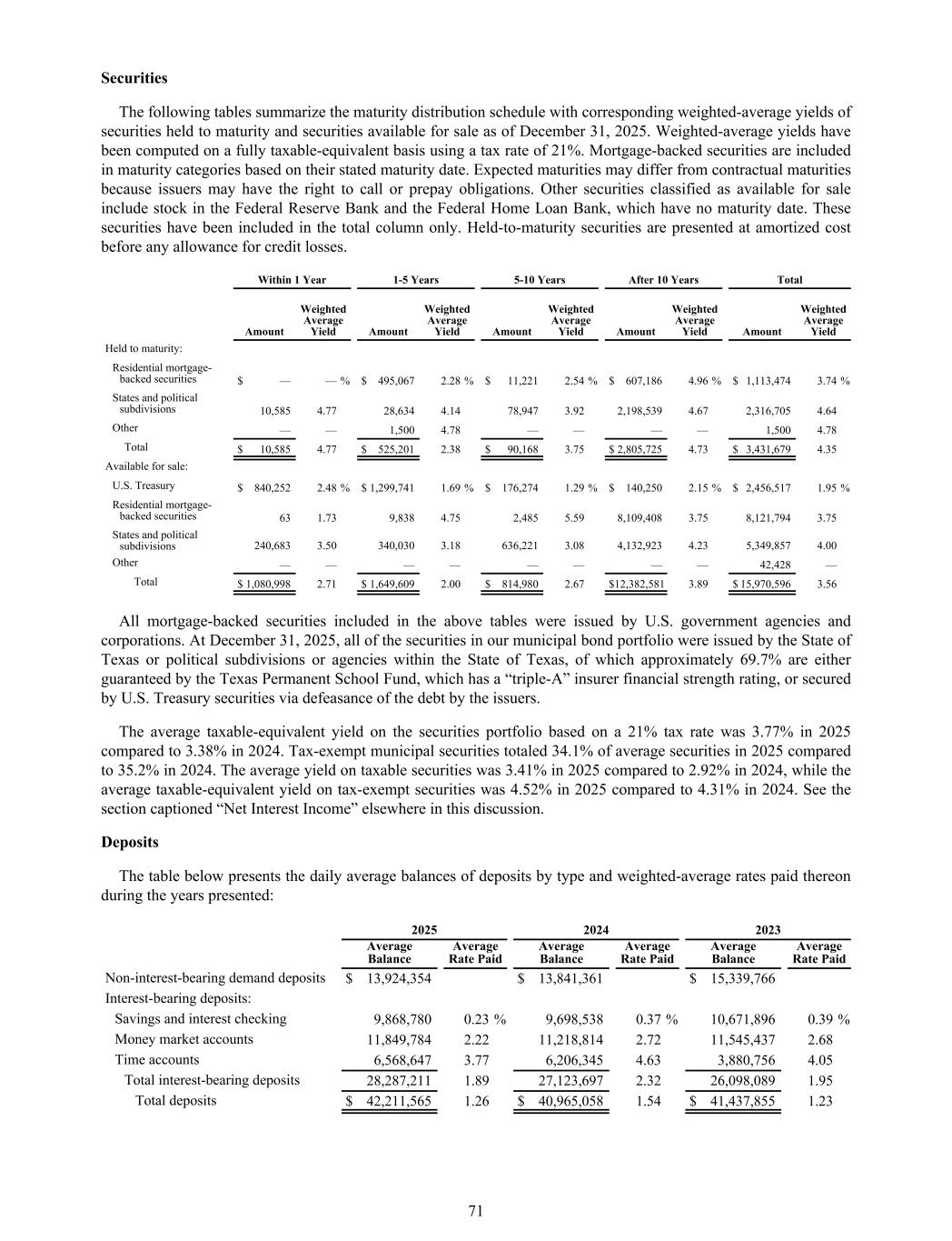 Securities The following tables summarize the maturity distribution schedule with corresponding weighted-average yields of securities held to maturity and securities available for sale as of December 31, 2025. Weighted-average yields have been computed on a fully taxable-equivalent basis using a tax rate of 21%. Mortgage-backed securities are included in maturity categories based on their stated maturity date. Expected maturities may differ from contractual maturities because issuers may have the right to call or prepay obligations. Other securities classified as available for sale include stock in the Federal Reserve Bank and the Federal Home Loan Bank, which have no maturity date. These securities have been included in the total column only. Held-to-maturity securities are presented at amortized cost before any allowance for credit losses. Within 1 Year 1-5 Years 5-10 Years After 10 Years Total Amount Weighted Average Yield Amount Weighted Average Yield Amount Weighted Average Yield Amount Weighted Average Yield Amount Weighted Average Yield Held to maturity: Residential mortgage- backed securities $ — — % $ 495,067 2.28 % $ 11,221 2.54 % $ 607,186 4.96 % $ 1,113,474 3.74 % States and political subdivisions 10,585 4.77 28,634 4.14 78,947 3.92 2,198,539 4.67 2,316,705 4.64 Other — — 1,500 4.78 — — — — 1,500 4.78 Total $ 10,585 4.77 $ 525,201 2.38 $ 90,168 3.75 $ 2,805,725 4.73 $ 3,431,679 4.35 Available for sale: U.S. Treasury $ 840,252 2.48 % $ 1,299,741 1.69 % $ 176,274 1.29 % $ 140,250 2.15 % $ 2,456,517 1.95 % Residential mortgage- backed securities 63 1.73 9,838 4.75 2,485 5.59 8,109,408 3.75 8,121,794 3.75 States and political subdivisions 240,683 3.50 340,030 3.18 636,221 3.08 4,132,923 4.23 5,349,857 4.00 Other — — — — — — — — 42,428 — Total $ 1,080,998 2.71 $ 1,649,609 2.00 $ 814,980 2.67 $12,382,581 3.89 $ 15,970,596 3.56 All mortgage-backed securities included in the above tables were issued by U.S. government agencies and corporations. At December 31, 2025, all of the securities in our municipal bond portfolio were issued by the State of Texas or political subdivisions or agencies within the State of Texas, of which approximately 69.7% are either guaranteed by the Texas Permanent School Fund, which has a “triple-A” insurer financial strength rating, or secured by U.S. Treasury securities via defeasance of the debt by the issuers. The average taxable-equivalent yield on the securities portfolio based on a 21% tax rate was 3.77% in 2025 compared to 3.38% in 2024. Tax-exempt municipal securities totaled 34.1% of average securities in 2025 compared to 35.2% in 2024. The average yield on taxable securities was 3.41% in 2025 compared to 2.92% in 2024, while the average taxable-equivalent yield on tax-exempt securities was 4.52% in 2025 compared to 4.31% in 2024. See the section captioned “Net Interest Income” elsewhere in this discussion. Deposits The table below presents the daily average balances of deposits by type and weighted-average rates paid thereon during the years presented: 2025 2024 2023 Average Balance Average Rate Paid Average Balance Average Rate Paid Average Balance Average Rate Paid Non-interest-bearing demand deposits $ 13,924,354 $ 13,841,361 $ 15,339,766 Interest-bearing deposits: Savings and interest checking 9,868,780 0.23 % 9,698,538 0.37 % 10,671,896 0.39 % Money market accounts 11,849,784 2.22 11,218,814 2.72 11,545,437 2.68 Time accounts 6,568,647 3.77 6,206,345 4.63 3,880,756 4.05 Total interest-bearing deposits 28,287,211 1.89 27,123,697 2.32 26,098,089 1.95 Total deposits $ 42,211,565 1.26 $ 40,965,058 1.54 $ 41,437,855 1.23 71
