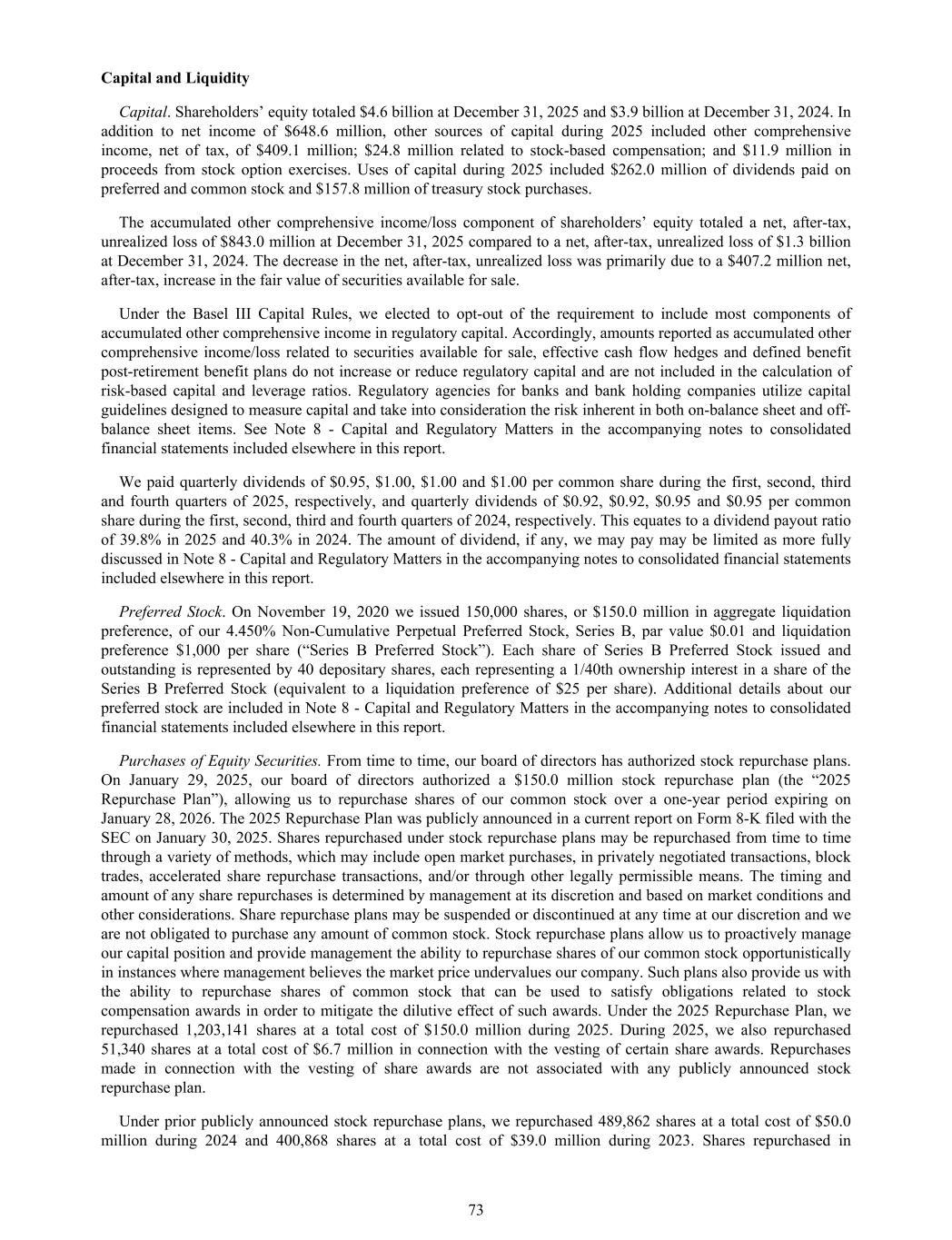 Capital and Liquidity Capital. Shareholders’ equity totaled $4.6 billion at December 31, 2025 and $3.9 billion at December 31, 2024. In addition to net income of $648.6 million, other sources of capital during 2025 included other comprehensive income, net of tax, of $409.1 million; $24.8 million related to stock-based compensation; and $11.9 million in proceeds from stock option exercises. Uses of capital during 2025 included $262.0 million of dividends paid on preferred and common stock and $157.8 million of treasury stock purchases. The accumulated other comprehensive income/loss component of shareholders’ equity totaled a net, after-tax, unrealized loss of $843.0 million at December 31, 2025 compared to a net, after-tax, unrealized loss of $1.3 billion at December 31, 2024. The decrease in the net, after-tax, unrealized loss was primarily due to a $407.2 million net, after-tax, increase in the fair value of securities available for sale. Under the Basel III Capital Rules, we elected to opt-out of the requirement to include most components of accumulated other comprehensive income in regulatory capital. Accordingly, amounts reported as accumulated other comprehensive income/loss related to securities available for sale, effective cash flow hedges and defined benefit post-retirement benefit plans do not increase or reduce regulatory capital and are not included in the calculation of risk-based capital and leverage ratios. Regulatory agencies for banks and bank holding companies utilize capital guidelines designed to measure capital and take into consideration the risk inherent in both on-balance sheet and off- balance sheet items. See Note 8 - Capital and Regulatory Matters in the accompanying notes to consolidated financial statements included elsewhere in this report. We paid quarterly dividends of $0.95, $1.00, $1.00 and $1.00 per common share during the first, second, third and fourth quarters of 2025, respectively, and quarterly dividends of $0.92, $0.92, $0.95 and $0.95 per common share during the first, second, third and fourth quarters of 2024, respectively. This equates to a dividend payout ratio of 39.8% in 2025 and 40.3% in 2024. The amount of dividend, if any, we may pay may be limited as more fully discussed in Note 8 - Capital and Regulatory Matters in the accompanying notes to consolidated financial statements included elsewhere in this report. Preferred Stock. On November 19, 2020 we issued 150,000 shares, or $150.0 million in aggregate liquidation preference, of our 4.450% Non-Cumulative Perpetual Preferred Stock, Series B, par value $0.01 and liquidation preference $1,000 per share (“Series B Preferred Stock”). Each share of Series B Preferred Stock issued and outstanding is represented by 40 depositary shares, each representing a 1/40th ownership interest in a share of the Series B Preferred Stock (equivalent to a liquidation preference of $25 per share). Additional details about our preferred stock are included in Note 8 - Capital and Regulatory Matters in the accompanying notes to consolidated financial statements included elsewhere in this report. Purchases of Equity Securities. From time to time, our board of directors has authorized stock repurchase plans. On January 29, 2025, our board of directors authorized a $150.0 million stock repurchase plan (the “2025 Repurchase Plan”), allowing us to repurchase shares of our common stock over a one-year period expiring on January 28, 2026. The 2025 Repurchase Plan was publicly announced in a current report on Form 8-K filed with the SEC on January 30, 2025. Shares repurchased under stock repurchase plans may be repurchased from time to time through a variety of methods, which may include open market purchases, in privately negotiated transactions, block trades, accelerated share repurchase transactions, and/or through other legally permissible means. The timing and amount of any share repurchases is determined by management at its discretion and based on market conditions and other considerations. Share repurchase plans may be suspended or discontinued at any time at our discretion and we are not obligated to purchase any amount of common stock. Stock repurchase plans allow us to proactively manage our capital position and provide management the ability to repurchase shares of our common stock opportunistically in instances where management believes the market price undervalues our company. Such plans also provide us with the ability to repurchase shares of common stock that can be used to satisfy obligations related to stock compensation awards in order to mitigate the dilutive effect of such awards. Under the 2025 Repurchase Plan, we repurchased 1,203,141 shares at a total cost of $150.0 million during 2025. During 2025, we also repurchased 51,340 shares at a total cost of $6.7 million in connection with the vesting of certain share awards. Repurchases made in connection with the vesting of share awards are not associated with any publicly announced stock repurchase plan. Under prior publicly announced stock repurchase plans, we repurchased 489,862 shares at a total cost of $50.0 million during 2024 and 400,868 shares at a total cost of $39.0 million during 2023. Shares repurchased in 73