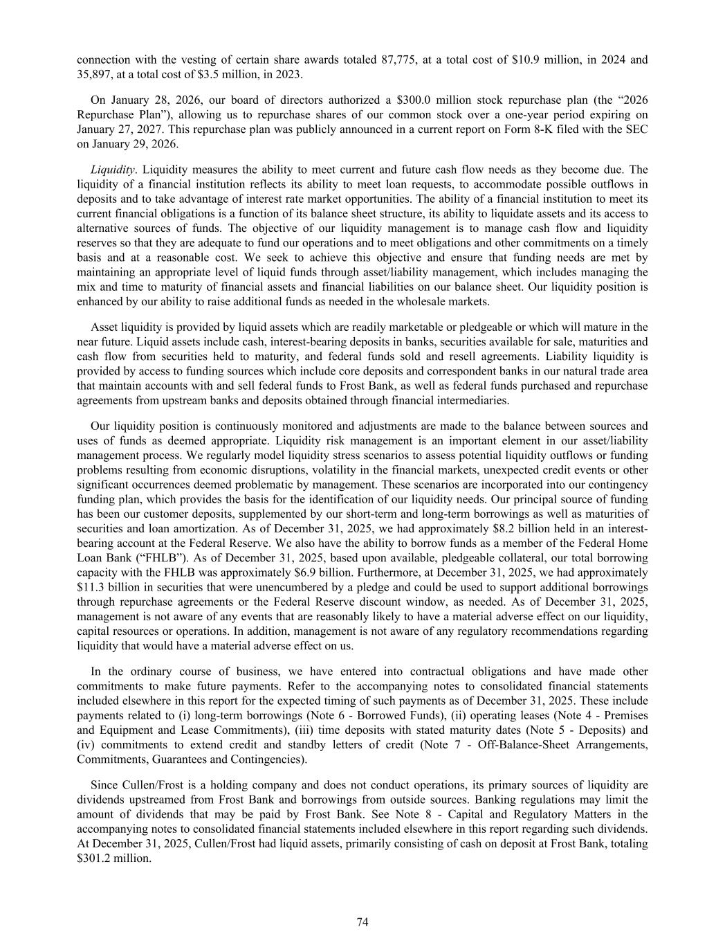 connection with the vesting of certain share awards totaled 87,775, at a total cost of $10.9 million, in 2024 and 35,897, at a total cost of $3.5 million, in 2023. On January 28, 2026, our board of directors authorized a $300.0 million stock repurchase plan (the “2026 Repurchase Plan”), allowing us to repurchase shares of our common stock over a one-year period expiring on January 27, 2027. This repurchase plan was publicly announced in a current report on Form 8-K filed with the SEC on January 29, 2026. Liquidity. Liquidity measures the ability to meet current and future cash flow needs as they become due. The liquidity of a financial institution reflects its ability to meet loan requests, to accommodate possible outflows in deposits and to take advantage of interest rate market opportunities. The ability of a financial institution to meet its current financial obligations is a function of its balance sheet structure, its ability to liquidate assets and its access to alternative sources of funds. The objective of our liquidity management is to manage cash flow and liquidity reserves so that they are adequate to fund our operations and to meet obligations and other commitments on a timely basis and at a reasonable cost. We seek to achieve this objective and ensure that funding needs are met by maintaining an appropriate level of liquid funds through asset/liability management, which includes managing the mix and time to maturity of financial assets and financial liabilities on our balance sheet. Our liquidity position is enhanced by our ability to raise additional funds as needed in the wholesale markets. Asset liquidity is provided by liquid assets which are readily marketable or pledgeable or which will mature in the near future. Liquid assets include cash, interest-bearing deposits in banks, securities available for sale, maturities and cash flow from securities held to maturity, and federal funds sold and resell agreements. Liability liquidity is provided by access to funding sources which include core deposits and correspondent banks in our natural trade area that maintain accounts with and sell federal funds to Frost Bank, as well as federal funds purchased and repurchase agreements from upstream banks and deposits obtained through financial intermediaries. Our liquidity position is continuously monitored and adjustments are made to the balance between sources and uses of funds as deemed appropriate. Liquidity risk management is an important element in our asset/liability management process. We regularly model liquidity stress scenarios to assess potential liquidity outflows or funding problems resulting from economic disruptions, volatility in the financial markets, unexpected credit events or other significant occurrences deemed problematic by management. These scenarios are incorporated into our contingency funding plan, which provides the basis for the identification of our liquidity needs. Our principal source of funding has been our customer deposits, supplemented by our short-term and long-term borrowings as well as maturities of securities and loan amortization. As of December 31, 2025, we had approximately $8.2 billion held in an interest- bearing account at the Federal Reserve. We also have the ability to borrow funds as a member of the Federal Home Loan Bank (“FHLB”). As of December 31, 2025, based upon available, pledgeable collateral, our total borrowing capacity with the FHLB was approximately $6.9 billion. Furthermore, at December 31, 2025, we had approximately $11.3 billion in securities that were unencumbered by a pledge and could be used to support additional borrowings through repurchase agreements or the Federal Reserve discount window, as needed. As of December 31, 2025, management is not aware of any events that are reasonably likely to have a material adverse effect on our liquidity, capital resources or operations. In addition, management is not aware of any regulatory recommendations regarding liquidity that would have a material adverse effect on us. In the ordinary course of business, we have entered into contractual obligations and have made other commitments to make future payments. Refer to the accompanying notes to consolidated financial statements included elsewhere in this report for the expected timing of such payments as of December 31, 2025. These include payments related to (i) long-term borrowings (Note 6 - Borrowed Funds), (ii) operating leases (Note 4 - Premises and Equipment and Lease Commitments), (iii) time deposits with stated maturity dates (Note 5 - Deposits) and (iv) commitments to extend credit and standby letters of credit (Note 7 - Off-Balance-Sheet Arrangements, Commitments, Guarantees and Contingencies). Since Cullen/Frost is a holding company and does not conduct operations, its primary sources of liquidity are dividends upstreamed from Frost Bank and borrowings from outside sources. Banking regulations may limit the amount of dividends that may be paid by Frost Bank. See Note 8 - Capital and Regulatory Matters in the accompanying notes to consolidated financial statements included elsewhere in this report regarding such dividends. At December 31, 2025, Cullen/Frost had liquid assets, primarily consisting of cash on deposit at Frost Bank, totaling $301.2 million. 74