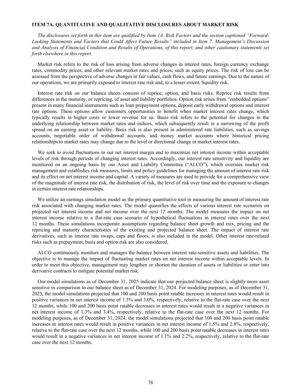 ITEM 7A. QUANTITATIVE AND QUALITATIVE DISCLOSURES ABOUT MARKET RISK The disclosures set forth in this item are qualified by Item 1A. Risk Factors and the section captioned “Forward- Looking Statements and Factors that Could Affect Future Results” included in Item 7. Management’s Discussion and Analysis of Financial Condition and Results of Operations, of this report, and other cautionary statements set forth elsewhere in this report. Market risk refers to the risk of loss arising from adverse changes in interest rates, foreign currency exchange rates, commodity prices, and other relevant market rates and prices, such as equity prices. The risk of loss can be assessed from the perspective of adverse changes in fair values, cash flows, and future earnings. Due to the nature of our operations, we are primarily exposed to interest rate risk and, to a lesser extent, liquidity risk. Interest rate risk on our balance sheets consists of reprice, option, and basis risks. Reprice risk results from differences in the maturity, or repricing, of asset and liability portfolios. Option risk arises from “embedded options” present in many financial instruments such as loan prepayment options, deposit early withdrawal options and interest rate options. These options allow customers opportunities to benefit when market interest rates change, which typically results in higher costs or lower revenue for us. Basis risk refers to the potential for changes in the underlying relationship between market rates and indices, which subsequently result in a narrowing of the profit spread on an earning asset or liability. Basis risk is also present in administered rate liabilities, such as savings accounts, negotiable order of withdrawal accounts, and money market accounts where historical pricing relationships to market rates may change due to the level or directional change in market interest rates. We seek to avoid fluctuations in our net interest margin and to maximize net interest income within acceptable levels of risk through periods of changing interest rates. Accordingly, our interest rate sensitivity and liquidity are monitored on an ongoing basis by our Asset and Liability Committee (“ALCO”), which oversees market risk management and establishes risk measures, limits and policy guidelines for managing the amount of interest rate risk and its effect on net interest income and capital. A variety of measures are used to provide for a comprehensive view of the magnitude of interest rate risk, the distribution of risk, the level of risk over time and the exposure to changes in certain interest rate relationships. We utilize an earnings simulation model as the primary quantitative tool in measuring the amount of interest rate risk associated with changing market rates. The model quantifies the effects of various interest rate scenarios on projected net interest income and net income over the next 12 months. The model measures the impact on net interest income relative to a flat-rate case scenario of hypothetical fluctuations in interest rates over the next 12 months. These simulations incorporate assumptions regarding balance sheet growth and mix, pricing and the repricing and maturity characteristics of the existing and projected balance sheet. The impact of interest rate derivatives, such as interest rate swaps, caps and floors, is also included in the model. Other interest rate-related risks such as prepayment, basis and option risk are also considered. ALCO continuously monitors and manages the balance between interest rate-sensitive assets and liabilities. The objective is to manage the impact of fluctuating market rates on net interest income within acceptable levels. In order to meet this objective, management may lengthen or shorten the duration of assets or liabilities or enter into derivative contracts to mitigate potential market risk. Our model simulations as of December 31, 2025 indicate that our projected balance sheet is slightly more asset sensitive in comparison to our balance sheet as of December 31, 2024. For modeling purposes, as of December 31, 2025, the model simulations projected that 100 and 200 basis point ratable increases in interest rates would result in positive variances in net interest income of 1.5% and 3.0%, respectively, relative to the flat-rate case over the next 12 months, while 100 and 200 basis point ratable decreases in interest rates would result in a negative variances in net interest income of 1.3% and 3.4%, respectively, relative to the flat-rate case over the next 12 months. For modeling purposes, as of December 31, 2024, the model simulations projected that 100 and 200 basis point ratable increases in interest rates would result in positive variances in net interest income of 1.5% and 2.8%, respectively, relative to the flat-rate case over the next 12 months, while 100 and 200 basis point ratable decreases in interest rates would result in a negative variances in net interest income of 1.1% and 2.2%, respectively, relative to the flat-rate case over the next 12 months. 76