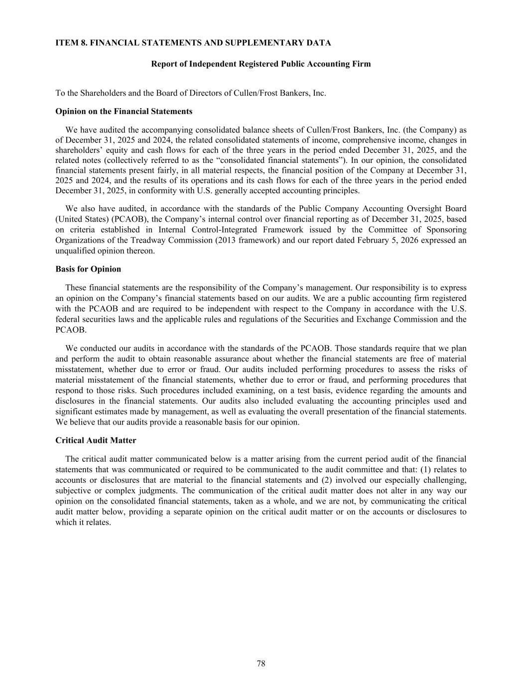 ITEM 8. FINANCIAL STATEMENTS AND SUPPLEMENTARY DATA Report of Independent Registered Public Accounting Firm To the Shareholders and the Board of Directors of Cullen/Frost Bankers, Inc. Opinion on the Financial Statements We have audited the accompanying consolidated balance sheets of Cullen/Frost Bankers, Inc. (the Company) as of December 31, 2025 and 2024, the related consolidated statements of income, comprehensive income, changes in shareholders’ equity and cash flows for each of the three years in the period ended December 31, 2025, and the related notes (collectively referred to as the “consolidated financial statements”). In our opinion, the consolidated financial statements present fairly, in all material respects, the financial position of the Company at December 31, 2025 and 2024, and the results of its operations and its cash flows for each of the three years in the period ended December 31, 2025, in conformity with U.S. generally accepted accounting principles. We also have audited, in accordance with the standards of the Public Company Accounting Oversight Board (United States) (PCAOB), the Company’s internal control over financial reporting as of December 31, 2025, based on criteria established in Internal Control-Integrated Framework issued by the Committee of Sponsoring Organizations of the Treadway Commission (2013 framework) and our report dated February 5, 2026 expressed an unqualified opinion thereon. Basis for Opinion These financial statements are the responsibility of the Company’s management. Our responsibility is to express an opinion on the Company’s financial statements based on our audits. We are a public accounting firm registered with the PCAOB and are required to be independent with respect to the Company in accordance with the U.S. federal securities laws and the applicable rules and regulations of the Securities and Exchange Commission and the PCAOB. We conducted our audits in accordance with the standards of the PCAOB. Those standards require that we plan and perform the audit to obtain reasonable assurance about whether the financial statements are free of material misstatement, whether due to error or fraud. Our audits included performing procedures to assess the risks of material misstatement of the financial statements, whether due to error or fraud, and performing procedures that respond to those risks. Such procedures included examining, on a test basis, evidence regarding the amounts and disclosures in the financial statements. Our audits also included evaluating the accounting principles used and significant estimates made by management, as well as evaluating the overall presentation of the financial statements. We believe that our audits provide a reasonable basis for our opinion. Critical Audit Matter The critical audit matter communicated below is a matter arising from the current period audit of the financial statements that was communicated or required to be communicated to the audit committee and that: (1) relates to accounts or disclosures that are material to the financial statements and (2) involved our especially challenging, subjective or complex judgments. The communication of the critical audit matter does not alter in any way our opinion on the consolidated financial statements, taken as a whole, and we are not, by communicating the critical audit matter below, providing a separate opinion on the critical audit matter or on the accounts or disclosures to which it relates. 78