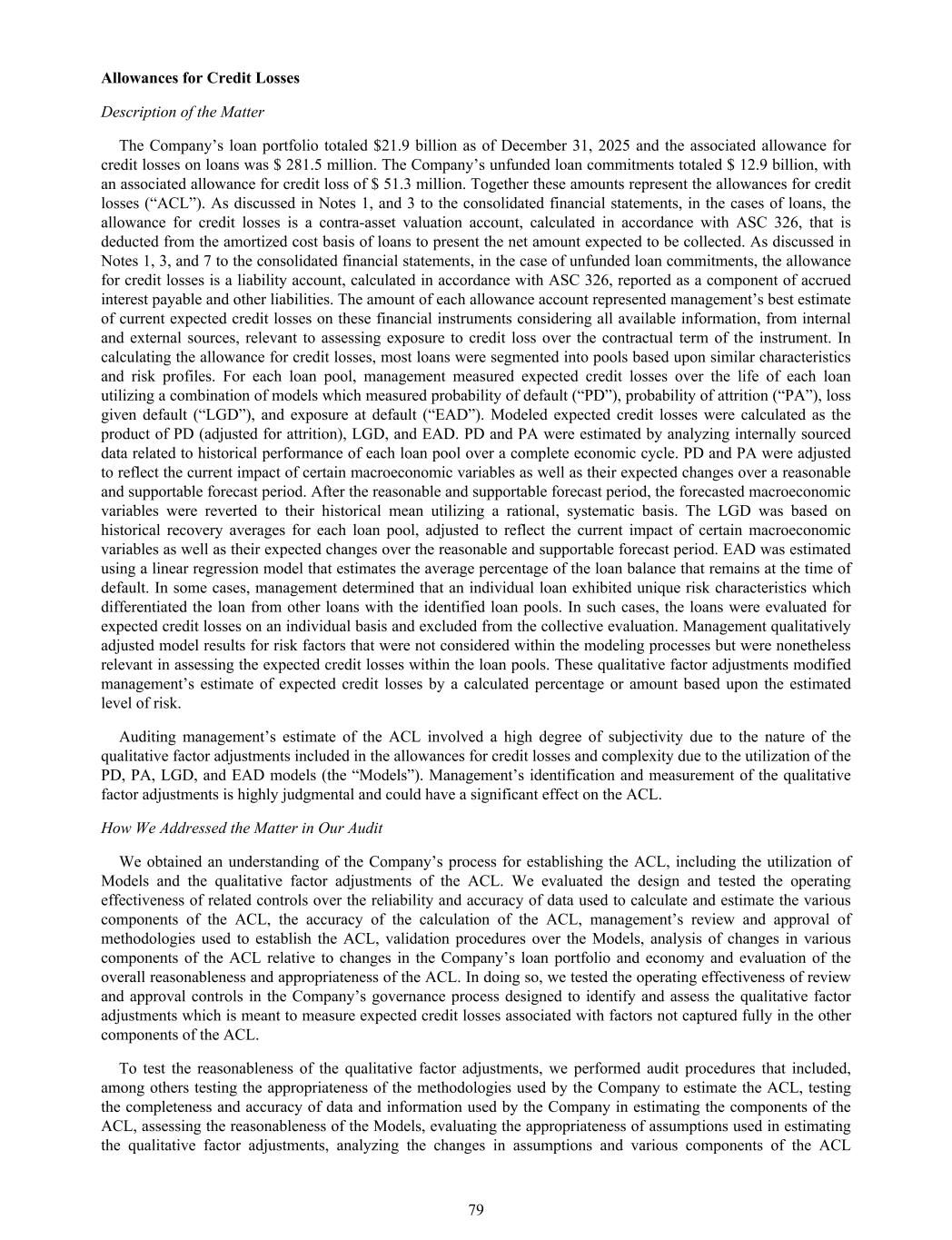 Allowances for Credit Losses Description of the Matter The Company’s loan portfolio totaled $21.9 billion as of December 31, 2025 and the associated allowance for credit losses on loans was $ 281.5 million. The Company’s unfunded loan commitments totaled $ 12.9 billion, with an associated allowance for credit loss of $ 51.3 million. Together these amounts represent the allowances for credit losses (“ACL”). As discussed in Notes 1, and 3 to the consolidated financial statements, in the cases of loans, the allowance for credit losses is a contra-asset valuation account, calculated in accordance with ASC 326, that is deducted from the amortized cost basis of loans to present the net amount expected to be collected. As discussed in Notes 1, 3, and 7 to the consolidated financial statements, in the case of unfunded loan commitments, the allowance for credit losses is a liability account, calculated in accordance with ASC 326, reported as a component of accrued interest payable and other liabilities. The amount of each allowance account represented management’s best estimate of current expected credit losses on these financial instruments considering all available information, from internal and external sources, relevant to assessing exposure to credit loss over the contractual term of the instrument. In calculating the allowance for credit losses, most loans were segmented into pools based upon similar characteristics and risk profiles. For each loan pool, management measured expected credit losses over the life of each loan utilizing a combination of models which measured probability of default (“PD”), probability of attrition (“PA”), loss given default (“LGD”), and exposure at default (“EAD”). Modeled expected credit losses were calculated as the product of PD (adjusted for attrition), LGD, and EAD. PD and PA were estimated by analyzing internally sourced data related to historical performance of each loan pool over a complete economic cycle. PD and PA were adjusted to reflect the current impact of certain macroeconomic variables as well as their expected changes over a reasonable and supportable forecast period. After the reasonable and supportable forecast period, the forecasted macroeconomic variables were reverted to their historical mean utilizing a rational, systematic basis. The LGD was based on historical recovery averages for each loan pool, adjusted to reflect the current impact of certain macroeconomic variables as well as their expected changes over the reasonable and supportable forecast period. EAD was estimated using a linear regression model that estimates the average percentage of the loan balance that remains at the time of default. In some cases, management determined that an individual loan exhibited unique risk characteristics which differentiated the loan from other loans with the identified loan pools. In such cases, the loans were evaluated for expected credit losses on an individual basis and excluded from the collective evaluation. Management qualitatively adjusted model results for risk factors that were not considered within the modeling processes but were nonetheless relevant in assessing the expected credit losses within the loan pools. These qualitative factor adjustments modified management’s estimate of expected credit losses by a calculated percentage or amount based upon the estimated level of risk. Auditing management’s estimate of the ACL involved a high degree of subjectivity due to the nature of the qualitative factor adjustments included in the allowances for credit losses and complexity due to the utilization of the PD, PA, LGD, and EAD models (the “Models”). Management’s identification and measurement of the qualitative factor adjustments is highly judgmental and could have a significant effect on the ACL. How We Addressed the Matter in Our Audit We obtained an understanding of the Company’s process for establishing the ACL, including the utilization of Models and the qualitative factor adjustments of the ACL. We evaluated the design and tested the operating effectiveness of related controls over the reliability and accuracy of data used to calculate and estimate the various components of the ACL, the accuracy of the calculation of the ACL, management’s review and approval of methodologies used to establish the ACL, validation procedures over the Models, analysis of changes in various components of the ACL relative to changes in the Company’s loan portfolio and economy and evaluation of the overall reasonableness and appropriateness of the ACL. In doing so, we tested the operating effectiveness of review and approval controls in the Company’s governance process designed to identify and assess the qualitative factor adjustments which is meant to measure expected credit losses associated with factors not captured fully in the other components of the ACL. To test the reasonableness of the qualitative factor adjustments, we performed audit procedures that included, among others testing the appropriateness of the methodologies used by the Company to estimate the ACL, testing the completeness and accuracy of data and information used by the Company in estimating the components of the ACL, assessing the reasonableness of the Models, evaluating the appropriateness of assumptions used in estimating the qualitative factor adjustments, analyzing the changes in assumptions and various components of the ACL 79