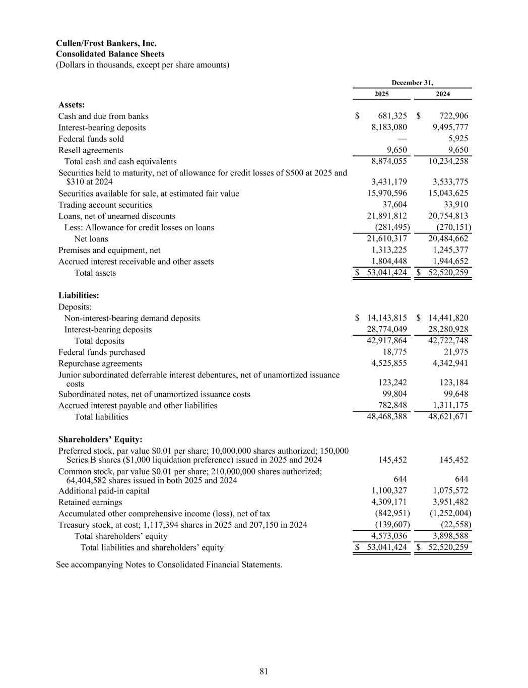 Cullen/Frost Bankers, Inc. Consolidated Balance Sheets (Dollars in thousands, except per share amounts) December 31, 2025 2024 Assets: Cash and due from banks $ 681,325 $ 722,906 Interest-bearing deposits 8,183,080 9,495,777 Federal funds sold — 5,925 Resell agreements 9,650 9,650 Total cash and cash equivalents 8,874,055 10,234,258 Securities held to maturity, net of allowance for credit losses of $500 at 2025 and $310 at 2024 3,431,179 3,533,775 Securities available for sale, at estimated fair value 15,970,596 15,043,625 Trading account securities 37,604 33,910 Loans, net of unearned discounts 21,891,812 20,754,813 Less: Allowance for credit losses on loans (281,495) (270,151) Net loans 21,610,317 20,484,662 Premises and equipment, net 1,313,225 1,245,377 Accrued interest receivable and other assets 1,804,448 1,944,652 Total assets $ 53,041,424 $ 52,520,259 Liabilities: Deposits: Non-interest-bearing demand deposits $ 14,143,815 $ 14,441,820 Interest-bearing deposits 28,774,049 28,280,928 Total deposits 42,917,864 42,722,748 Federal funds purchased 18,775 21,975 Repurchase agreements 4,525,855 4,342,941 Junior subordinated deferrable interest debentures, net of unamortized issuance costs 123,242 123,184 Subordinated notes, net of unamortized issuance costs 99,804 99,648 Accrued interest payable and other liabilities 782,848 1,311,175 Total liabilities 48,468,388 48,621,671 Shareholders’ Equity: Preferred stock, par value $0.01 per share; 10,000,000 shares authorized; 150,000 Series B shares ($1,000 liquidation preference) issued in 2025 and 2024 145,452 145,452 Common stock, par value $0.01 per share; 210,000,000 shares authorized; 64,404,582 shares issued in both 2025 and 2024 644 644 Additional paid-in capital 1,100,327 1,075,572 Retained earnings 4,309,171 3,951,482 Accumulated other comprehensive income (loss), net of tax (842,951) (1,252,004) Treasury stock, at cost; 1,117,394 shares in 2025 and 207,150 in 2024 (139,607) (22,558) Total shareholders’ equity 4,573,036 3,898,588 Total liabilities and shareholders’ equity $ 53,041,424 $ 52,520,259 See accompanying Notes to Consolidated Financial Statements. 81