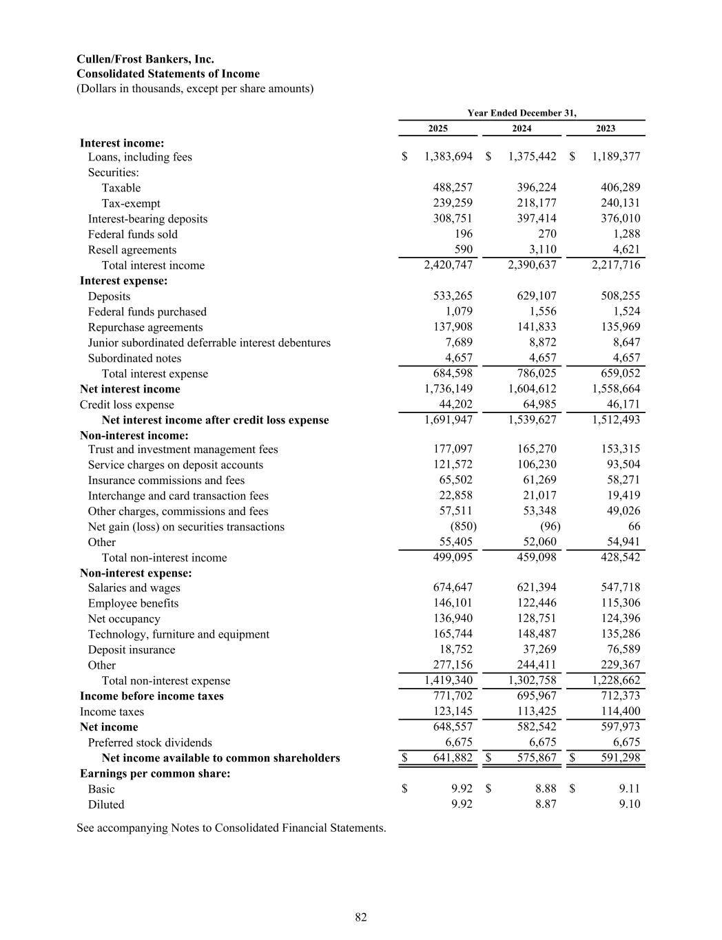 Cullen/Frost Bankers, Inc. Consolidated Statements of Income (Dollars in thousands, except per share amounts) Year Ended December 31, 2025 2024 2023 Interest income: Loans, including fees $ 1,383,694 $ 1,375,442 $ 1,189,377 Securities: Taxable 488,257 396,224 406,289 Tax-exempt 239,259 218,177 240,131 Interest-bearing deposits 308,751 397,414 376,010 Federal funds sold 196 270 1,288 Resell agreements 590 3,110 4,621 Total interest income 2,420,747 2,390,637 2,217,716 Interest expense: Deposits 533,265 629,107 508,255 Federal funds purchased 1,079 1,556 1,524 Repurchase agreements 137,908 141,833 135,969 Junior subordinated deferrable interest debentures 7,689 8,872 8,647 Subordinated notes 4,657 4,657 4,657 Total interest expense 684,598 786,025 659,052 Net interest income 1,736,149 1,604,612 1,558,664 Credit loss expense 44,202 64,985 46,171 Net interest income after credit loss expense 1,691,947 1,539,627 1,512,493 Non-interest income: Trust and investment management fees 177,097 165,270 153,315 Service charges on deposit accounts 121,572 106,230 93,504 Insurance commissions and fees 65,502 61,269 58,271 Interchange and card transaction fees 22,858 21,017 19,419 Other charges, commissions and fees 57,511 53,348 49,026 Net gain (loss) on securities transactions (850) (96) 66 Other 55,405 52,060 54,941 Total non-interest income 499,095 459,098 428,542 Non-interest expense: Salaries and wages 674,647 621,394 547,718 Employee benefits 146,101 122,446 115,306 Net occupancy 136,940 128,751 124,396 Technology, furniture and equipment 165,744 148,487 135,286 Deposit insurance 18,752 37,269 76,589 Other 277,156 244,411 229,367 Total non-interest expense 1,419,340 1,302,758 1,228,662 Income before income taxes 771,702 695,967 712,373 Income taxes 123,145 113,425 114,400 Net income 648,557 582,542 597,973 Preferred stock dividends 6,675 6,675 6,675 Net income available to common shareholders $ 641,882 $ 575,867 $ 591,298 Earnings per common share: Basic $ 9.92 $ 8.88 $ 9.11 Diluted 9.92 8.87 9.10 See accompanying Notes to Consolidated Financial Statements. 82