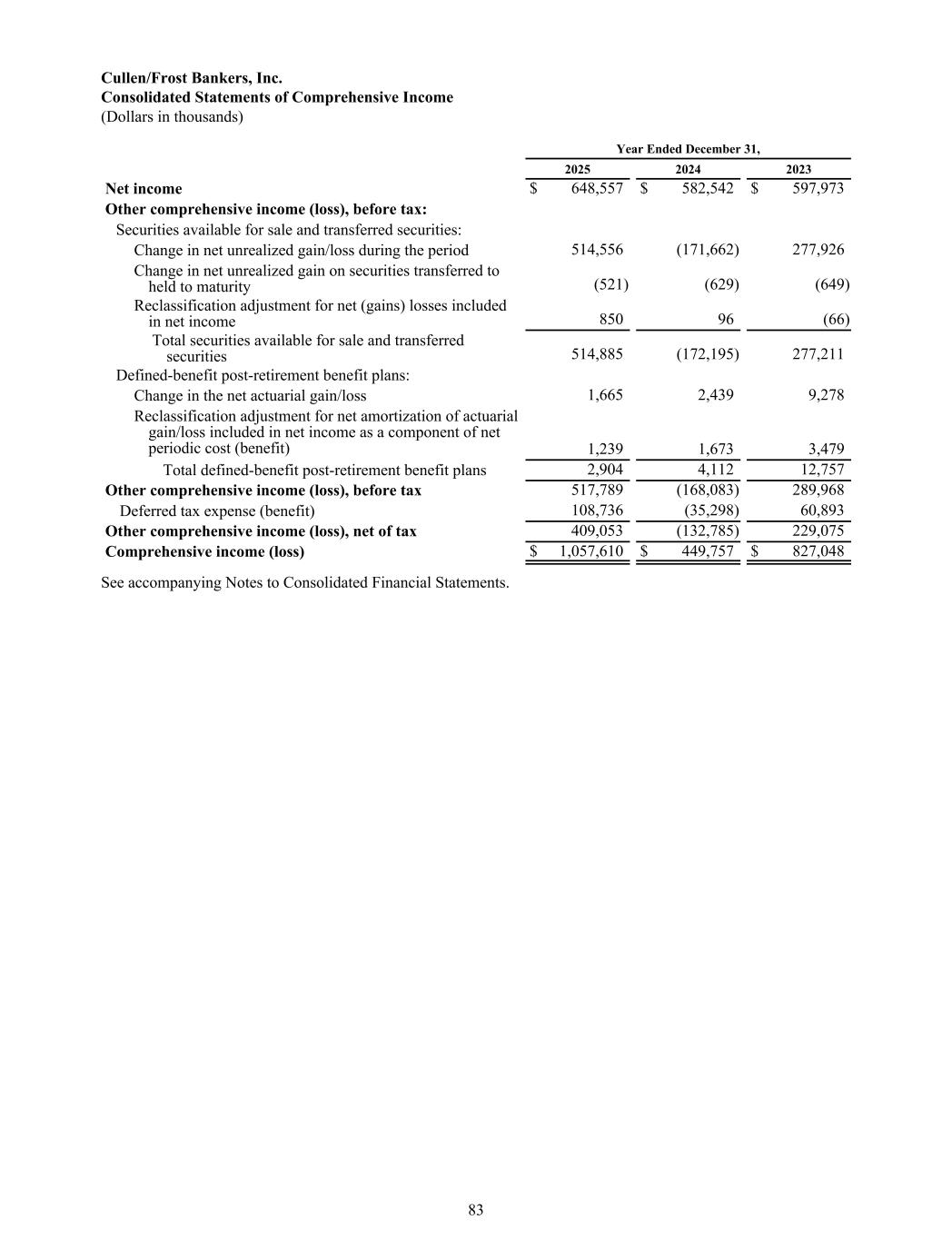 Cullen/Frost Bankers, Inc. Consolidated Statements of Comprehensive Income (Dollars in thousands) Year Ended December 31, 2025 2024 2023 Net income $ 648,557 $ 582,542 $ 597,973 Other comprehensive income (loss), before tax: Securities available for sale and transferred securities: Change in net unrealized gain/loss during the period 514,556 (171,662) 277,926 Change in net unrealized gain on securities transferred to held to maturity (521) (629) (649) Reclassification adjustment for net (gains) losses included in net income 850 96 (66) Total securities available for sale and transferred securities 514,885 (172,195) 277,211 Defined-benefit post-retirement benefit plans: Change in the net actuarial gain/loss 1,665 2,439 9,278 Reclassification adjustment for net amortization of actuarial gain/loss included in net income as a component of net periodic cost (benefit) 1,239 1,673 3,479 Total defined-benefit post-retirement benefit plans 2,904 4,112 12,757 Other comprehensive income (loss), before tax 517,789 (168,083) 289,968 Deferred tax expense (benefit) 108,736 (35,298) 60,893 Other comprehensive income (loss), net of tax 409,053 (132,785) 229,075 Comprehensive income (loss) $ 1,057,610 $ 449,757 $ 827,048 See accompanying Notes to Consolidated Financial Statements. 83