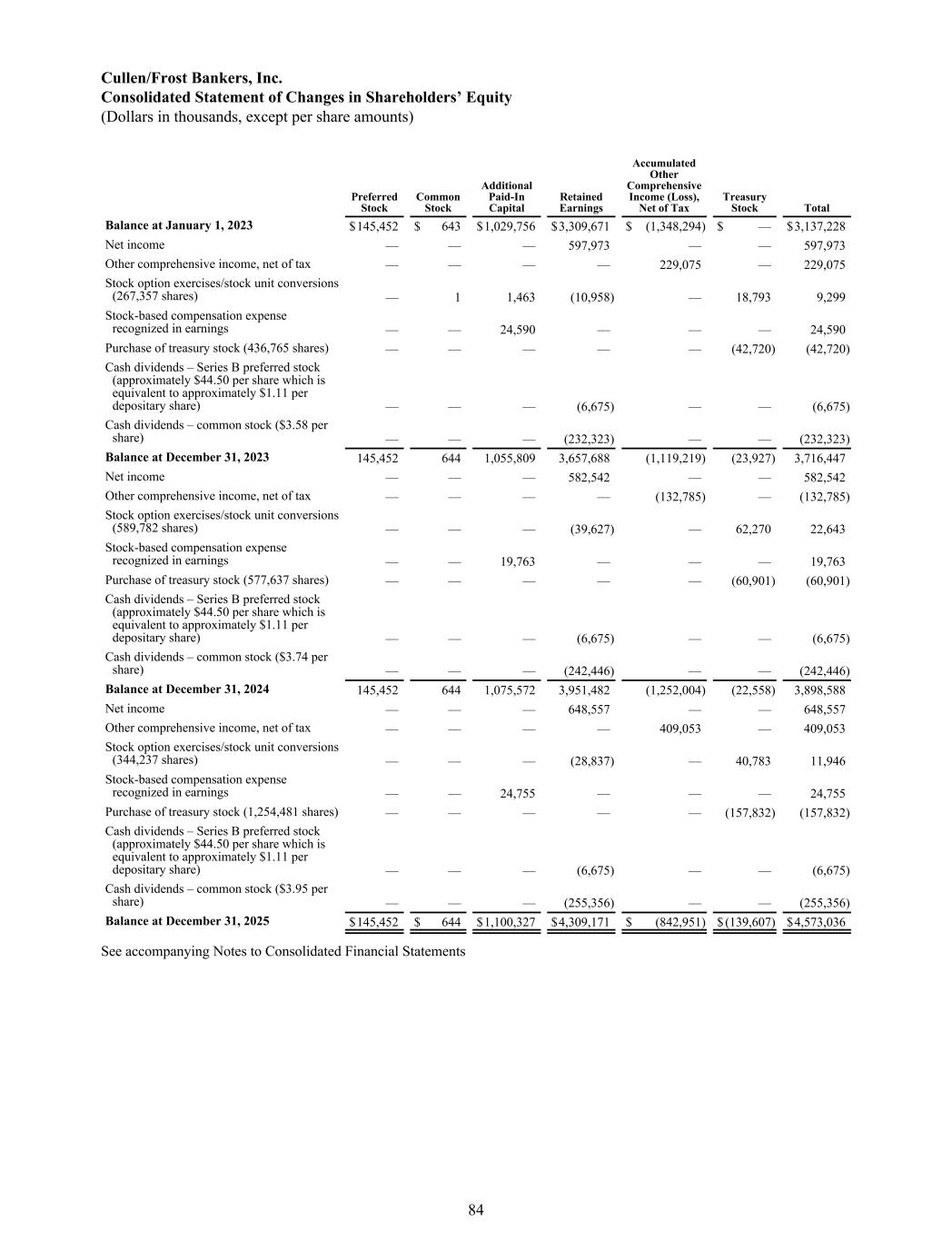 Cullen/Frost Bankers, Inc. Consolidated Statement of Changes in Shareholders’ Equity (Dollars in thousands, except per share amounts) Preferred Stock Common Stock Additional Paid-In Capital Retained Earnings Accumulated Other Comprehensive Income (Loss), Net of Tax Treasury Stock Total Balance at January 1, 2023 $145,452 $ 643 $1,029,756 $3,309,671 $ (1,348,294) $ — $3,137,228 Net income — — — 597,973 — — 597,973 Other comprehensive income, net of tax — — — — 229,075 — 229,075 Stock option exercises/stock unit conversions (267,357 shares) — 1 1,463 (10,958) — 18,793 9,299 Stock-based compensation expense recognized in earnings — — 24,590 — — — 24,590 Purchase of treasury stock (436,765 shares) — — — — — (42,720) (42,720) Cash dividends – Series B preferred stock (approximately $44.50 per share which is equivalent to approximately $1.11 per depositary share) — — — (6,675) — — (6,675) Cash dividends – common stock ($3.58 per share) — — — (232,323) — — (232,323) Balance at December 31, 2023 145,452 644 1,055,809 3,657,688 (1,119,219) (23,927) 3,716,447 Net income — — — 582,542 — — 582,542 Other comprehensive income, net of tax — — — — (132,785) — (132,785) Stock option exercises/stock unit conversions (589,782 shares) — — — (39,627) — 62,270 22,643 Stock-based compensation expense recognized in earnings — — 19,763 — — — 19,763 Purchase of treasury stock (577,637 shares) — — — — — (60,901) (60,901) Cash dividends – Series B preferred stock (approximately $44.50 per share which is equivalent to approximately $1.11 per depositary share) — — — (6,675) — — (6,675) Cash dividends – common stock ($3.74 per share) — — — (242,446) — — (242,446) Balance at December 31, 2024 145,452 644 1,075,572 3,951,482 (1,252,004) (22,558) 3,898,588 Net income — — — 648,557 — — 648,557 Other comprehensive income, net of tax — — — — 409,053 — 409,053 Stock option exercises/stock unit conversions (344,237 shares) — — — (28,837) — 40,783 11,946 Stock-based compensation expense recognized in earnings — — 24,755 — — — 24,755 Purchase of treasury stock (1,254,481 shares) — — — — — (157,832) (157,832) Cash dividends – Series B preferred stock (approximately $44.50 per share which is equivalent to approximately $1.11 per depositary share) — — — (6,675) — — (6,675) Cash dividends – common stock ($3.95 per share) — — — (255,356) — — (255,356) Balance at December 31, 2025 $145,452 $ 644 $1,100,327 $4,309,171 $ (842,951) $ (139,607) $4,573,036 See accompanying Notes to Consolidated Financial Statements 84