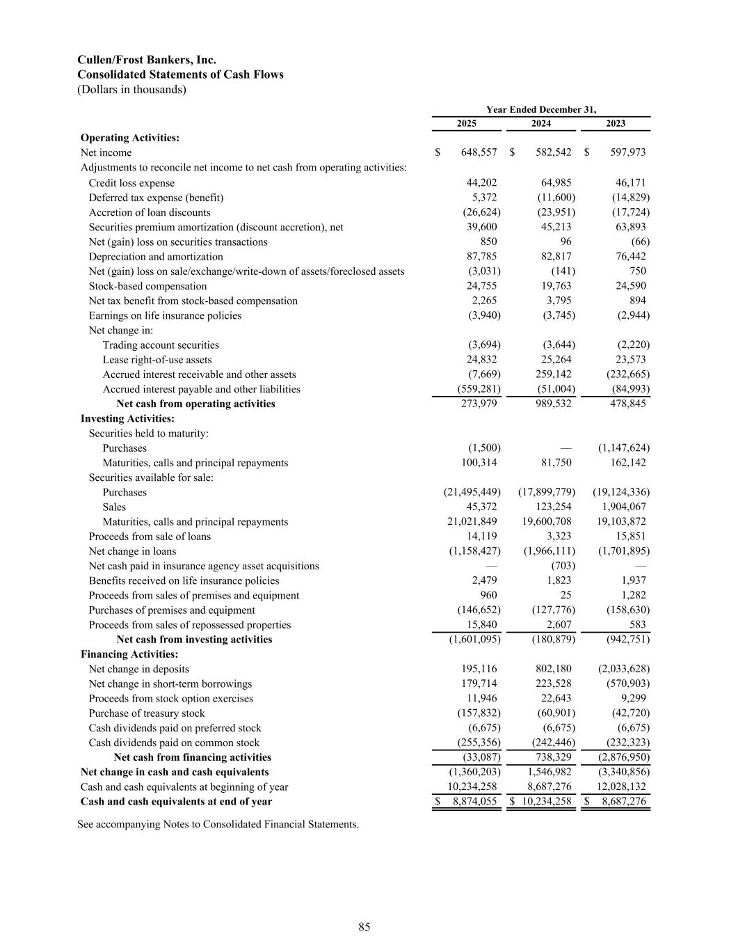 Cullen/Frost Bankers, Inc. Consolidated Statements of Cash Flows (Dollars in thousands) Year Ended December 31, 2025 2024 2023 Operating Activities: Net income $ 648,557 $ 582,542 $ 597,973 Adjustments to reconcile net income to net cash from operating activities: Credit loss expense 44,202 64,985 46,171 Deferred tax expense (benefit) 5,372 (11,600) (14,829) Accretion of loan discounts (26,624) (23,951) (17,724) Securities premium amortization (discount accretion), net 39,600 45,213 63,893 Net (gain) loss on securities transactions 850 96 (66) Depreciation and amortization 87,785 82,817 76,442 Net (gain) loss on sale/exchange/write-down of assets/foreclosed assets (3,031) (141) 750 Stock-based compensation 24,755 19,763 24,590 Net tax benefit from stock-based compensation 2,265 3,795 894 Earnings on life insurance policies (3,940) (3,745) (2,944) Net change in: Trading account securities (3,694) (3,644) (2,220) Lease right-of-use assets 24,832 25,264 23,573 Accrued interest receivable and other assets (7,669) 259,142 (232,665) Accrued interest payable and other liabilities (559,281) (51,004) (84,993) Net cash from operating activities 273,979 989,532 478,845 Investing Activities: Securities held to maturity: Purchases (1,500) — (1,147,624) Maturities, calls and principal repayments 100,314 81,750 162,142 Securities available for sale: Purchases (21,495,449) (17,899,779) (19,124,336) Sales 45,372 123,254 1,904,067 Maturities, calls and principal repayments 21,021,849 19,600,708 19,103,872 Proceeds from sale of loans 14,119 3,323 15,851 Net change in loans (1,158,427) (1,966,111) (1,701,895) Net cash paid in insurance agency asset acquisitions — (703) — Benefits received on life insurance policies 2,479 1,823 1,937 Proceeds from sales of premises and equipment 960 25 1,282 Purchases of premises and equipment (146,652) (127,776) (158,630) Proceeds from sales of repossessed properties 15,840 2,607 583 Net cash from investing activities (1,601,095) (180,879) (942,751) Financing Activities: Net change in deposits 195,116 802,180 (2,033,628) Net change in short-term borrowings 179,714 223,528 (570,903) Proceeds from stock option exercises 11,946 22,643 9,299 Purchase of treasury stock (157,832) (60,901) (42,720) Cash dividends paid on preferred stock (6,675) (6,675) (6,675) Cash dividends paid on common stock (255,356) (242,446) (232,323) Net cash from financing activities (33,087) 738,329 (2,876,950) Net change in cash and cash equivalents (1,360,203) 1,546,982 (3,340,856) Cash and cash equivalents at beginning of year 10,234,258 8,687,276 12,028,132 Cash and cash equivalents at end of year $ 8,874,055 $ 10,234,258 $ 8,687,276 See accompanying Notes to Consolidated Financial Statements. 85