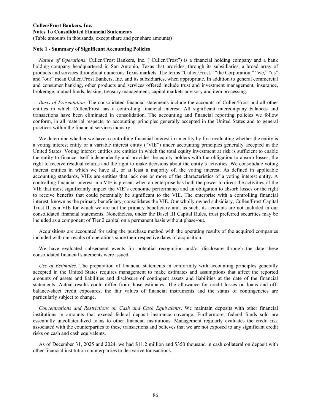 Cullen/Frost Bankers, Inc. Notes To Consolidated Financial Statements (Table amounts in thousands, except share and per share amounts) Note 1 - Summary of Significant Accounting Policies Nature of Operations. Cullen/Frost Bankers, Inc. (“Cullen/Frost”) is a financial holding company and a bank holding company headquartered in San Antonio, Texas that provides, through its subsidiaries, a broad array of products and services throughout numerous Texas markets. The terms “Cullen/Frost,” “the Corporation,” “we,” “us” and “our” mean Cullen/Frost Bankers, Inc. and its subsidiaries, when appropriate. In addition to general commercial and consumer banking, other products and services offered include trust and investment management, insurance, brokerage, mutual funds, leasing, treasury management, capital markets advisory and item processing. Basis of Presentation. The consolidated financial statements include the accounts of Cullen/Frost and all other entities in which Cullen/Frost has a controlling financial interest. All significant intercompany balances and transactions have been eliminated in consolidation. The accounting and financial reporting policies we follow conform, in all material respects, to accounting principles generally accepted in the United States and to general practices within the financial services industry. We determine whether we have a controlling financial interest in an entity by first evaluating whether the entity is a voting interest entity or a variable interest entity (“VIE”) under accounting principles generally accepted in the United States. Voting interest entities are entities in which the total equity investment at risk is sufficient to enable the entity to finance itself independently and provides the equity holders with the obligation to absorb losses, the right to receive residual returns and the right to make decisions about the entity’s activities. We consolidate voting interest entities in which we have all, or at least a majority of, the voting interest. As defined in applicable accounting standards, VIEs are entities that lack one or more of the characteristics of a voting interest entity. A controlling financial interest in a VIE is present when an enterprise has both the power to direct the activities of the VIE that most significantly impact the VIE’s economic performance and an obligation to absorb losses or the right to receive benefits that could potentially be significant to the VIE. The enterprise with a controlling financial interest, known as the primary beneficiary, consolidates the VIE. Our wholly owned subsidiary, Cullen/Frost Capital Trust II, is a VIE for which we are not the primary beneficiary and, as such, its accounts are not included in our consolidated financial statements. Nonetheless, under the Basel III Capital Rules, trust preferred securities may be included as a component of Tier 2 capital on a permanent basis without phase-out. Acquisitions are accounted for using the purchase method with the operating results of the acquired companies included with our results of operations since their respective dates of acquisition. We have evaluated subsequent events for potential recognition and/or disclosure through the date these consolidated financial statements were issued. Use of Estimates. The preparation of financial statements in conformity with accounting principles generally accepted in the United States requires management to make estimates and assumptions that affect the reported amounts of assets and liabilities and disclosure of contingent assets and liabilities at the date of the financial statements. Actual results could differ from those estimates. The allowance for credit losses on loans and off- balance-sheet credit exposures, the fair values of financial instruments and the status of contingencies are particularly subject to change. Concentrations and Restrictions on Cash and Cash Equivalents. We maintain deposits with other financial institutions in amounts that exceed federal deposit insurance coverage. Furthermore, federal funds sold are essentially uncollateralized loans to other financial institutions. Management regularly evaluates the credit risk associated with the counterparties to these transactions and believes that we are not exposed to any significant credit risks on cash and cash equivalents. As of December 31, 2025 and 2024, we had $11.2 million and $350 thousand in cash collateral on deposit with other financial institution counterparties to derivative transactions. 86