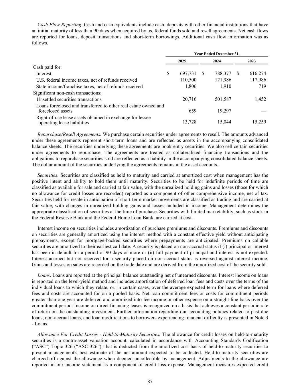 Cash Flow Reporting. Cash and cash equivalents include cash, deposits with other financial institutions that have an initial maturity of less than 90 days when acquired by us, federal funds sold and resell agreements. Net cash flows are reported for loans, deposit transactions and short-term borrowings. Additional cash flow information was as follows. Year Ended December 31, 2025 2024 2023 Cash paid for: Interest $ 697,731 $ 788,377 $ 616,274 U.S. federal income taxes, net of refunds received 110,500 121,986 117,986 State income/franchise taxes, net of refunds received 1,806 1,910 719 Significant non-cash transactions: Unsettled securities transactions 20,716 501,587 1,452 Loans foreclosed and transferred to other real estate owned and foreclosed assets 659 19,297 — Right-of-use lease assets obtained in exchange for lessee operating lease liabilities 13,728 15,044 15,259 Repurchase/Resell Agreements. We purchase certain securities under agreements to resell. The amounts advanced under these agreements represent short-term loans and are reflected as assets in the accompanying consolidated balance sheets. The securities underlying these agreements are book-entry securities. We also sell certain securities under agreements to repurchase. The agreements are treated as collateralized financing transactions and the obligations to repurchase securities sold are reflected as a liability in the accompanying consolidated balance sheets. The dollar amount of the securities underlying the agreements remains in the asset accounts. Securities. Securities are classified as held to maturity and carried at amortized cost when management has the positive intent and ability to hold them until maturity. Securities to be held for indefinite periods of time are classified as available for sale and carried at fair value, with the unrealized holding gains and losses (those for which no allowance for credit losses are recorded) reported as a component of other comprehensive income, net of tax. Securities held for resale in anticipation of short-term market movements are classified as trading and are carried at fair value, with changes in unrealized holding gains and losses included in income. Management determines the appropriate classification of securities at the time of purchase. Securities with limited marketability, such as stock in the Federal Reserve Bank and the Federal Home Loan Bank, are carried at cost. Interest income on securities includes amortization of purchase premiums and discounts. Premiums and discounts on securities are generally amortized using the interest method with a constant effective yield without anticipating prepayments, except for mortgage-backed securities where prepayments are anticipated. Premiums on callable securities are amortized to their earliest call date. A security is placed on non-accrual status if (i) principal or interest has been in default for a period of 90 days or more or (ii) full payment of principal and interest is not expected. Interest accrued but not received for a security placed on non-accrual status is reversed against interest income. Gains and losses on sales are recorded on the trade date and are derived from the amortized cost of the security sold. Loans. Loans are reported at the principal balance outstanding net of unearned discounts. Interest income on loans is reported on the level-yield method and includes amortization of deferred loan fees and costs over the terms of the individual loans to which they relate, or, in certain cases, over the average expected term for loans where deferred fees and costs are accounted for on a pooled basis. Net loan commitment fees or costs for commitment periods greater than one year are deferred and amortized into fee income or other expense on a straight-line basis over the commitment period. Income on direct financing leases is recognized on a basis that achieves a constant periodic rate of return on the outstanding investment. Further information regarding our accounting policies related to past due loans, non-accrual loans, and loan modifications to borrowers experiencing financial difficulty is presented in Note 3 - Loans. Allowance For Credit Losses - Held-to-Maturity Securities. The allowance for credit losses on held-to-maturity securities is a contra-asset valuation account, calculated in accordance with Accounting Standards Codification (“ASC”) Topic 326 (“ASC 326”), that is deducted from the amortized cost basis of held-to-maturity securities to present management's best estimate of the net amount expected to be collected. Held-to-maturity securities are charged-off against the allowance when deemed uncollectible by management. Adjustments to the allowance are reported in our income statement as a component of credit loss expense. Management measures expected credit 87