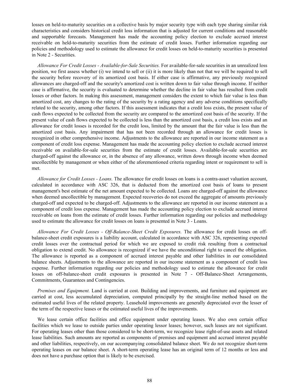 losses on held-to-maturity securities on a collective basis by major security type with each type sharing similar risk characteristics and considers historical credit loss information that is adjusted for current conditions and reasonable and supportable forecasts. Management has made the accounting policy election to exclude accrued interest receivable on held-to-maturity securities from the estimate of credit losses. Further information regarding our policies and methodology used to estimate the allowance for credit losses on held-to-maturity securities is presented in Note 2 - Securities. Allowance For Credit Losses - Available-for-Sale Securities. For available-for-sale securities in an unrealized loss position, we first assess whether (i) we intend to sell or (ii) it is more likely than not that we will be required to sell the security before recovery of its amortized cost basis. If either case is affirmative, any previously recognized allowances are charged-off and the security's amortized cost is written down to fair value through income. If neither case is affirmative, the security is evaluated to determine whether the decline in fair value has resulted from credit losses or other factors. In making this assessment, management considers the extent to which fair value is less than amortized cost, any changes to the rating of the security by a rating agency and any adverse conditions specifically related to the security, among other factors. If this assessment indicates that a credit loss exists, the present value of cash flows expected to be collected from the security are compared to the amortized cost basis of the security. If the present value of cash flows expected to be collected is less than the amortized cost basis, a credit loss exists and an allowance for credit losses is recorded for the credit loss, limited by the amount that the fair value is less than the amortized cost basis. Any impairment that has not been recorded through an allowance for credit losses is recognized in other comprehensive income. Adjustments to the allowance are reported in our income statement as a component of credit loss expense. Management has made the accounting policy election to exclude accrued interest receivable on available-for-sale securities from the estimate of credit losses. Available-for-sale securities are charged-off against the allowance or, in the absence of any allowance, written down through income when deemed uncollectible by management or when either of the aforementioned criteria regarding intent or requirement to sell is met. Allowance for Credit Losses - Loans. The allowance for credit losses on loans is a contra-asset valuation account, calculated in accordance with ASC 326, that is deducted from the amortized cost basis of loans to present management's best estimate of the net amount expected to be collected. Loans are charged-off against the allowance when deemed uncollectible by management. Expected recoveries do not exceed the aggregate of amounts previously charged-off and expected to be charged-off. Adjustments to the allowance are reported in our income statement as a component of credit loss expense. Management has made the accounting policy election to exclude accrued interest receivable on loans from the estimate of credit losses. Further information regarding our policies and methodology used to estimate the allowance for credit losses on loans is presented in Note 3 - Loans. Allowance For Credit Losses - Off-Balance-Sheet Credit Exposures. The allowance for credit losses on off- balance-sheet credit exposures is a liability account, calculated in accordance with ASC 326, representing expected credit losses over the contractual period for which we are exposed to credit risk resulting from a contractual obligation to extend credit. No allowance is recognized if we have the unconditional right to cancel the obligation. The allowance is reported as a component of accrued interest payable and other liabilities in our consolidated balance sheets. Adjustments to the allowance are reported in our income statement as a component of credit loss expense. Further information regarding our policies and methodology used to estimate the allowance for credit losses on off-balance-sheet credit exposures is presented in Note 7 - Off-Balance-Sheet Arrangements, Commitments, Guarantees and Contingencies. Premises and Equipment. Land is carried at cost. Building and improvements, and furniture and equipment are carried at cost, less accumulated depreciation, computed principally by the straight-line method based on the estimated useful lives of the related property. Leasehold improvements are generally depreciated over the lesser of the term of the respective leases or the estimated useful lives of the improvements. We lease certain office facilities and office equipment under operating leases. We also own certain office facilities which we lease to outside parties under operating lessor leases; however, such leases are not significant. For operating leases other than those considered to be short-term, we recognize lease right-of-use assets and related lease liabilities. Such amounts are reported as components of premises and equipment and accrued interest payable and other liabilities, respectively, on our accompanying consolidated balance sheet. We do not recognize short-term operating leases on our balance sheet. A short-term operating lease has an original term of 12 months or less and does not have a purchase option that is likely to be exercised. 88