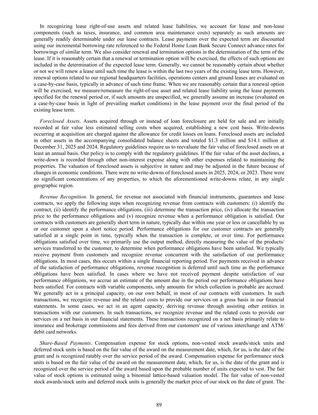 In recognizing lease right-of-use assets and related lease liabilities, we account for lease and non-lease components (such as taxes, insurance, and common area maintenance costs) separately as such amounts are generally readily determinable under our lease contracts. Lease payments over the expected term are discounted using our incremental borrowing rate referenced to the Federal Home Loan Bank Secure Connect advance rates for borrowings of similar term. We also consider renewal and termination options in the determination of the term of the lease. If it is reasonably certain that a renewal or termination option will be exercised, the effects of such options are included in the determination of the expected lease term. Generally, we cannot be reasonably certain about whether or not we will renew a lease until such time the lease is within the last two years of the existing lease term. However, renewal options related to our regional headquarters facilities, operations centers and ground leases are evaluated on a case-by-case basis, typically in advance of such time frame. When we are reasonably certain that a renewal option will be exercised, we measure/remeasure the right-of-use asset and related lease liability using the lease payments specified for the renewal period or, if such amounts are unspecified, we generally assume an increase (evaluated on a case-by-case basis in light of prevailing market conditions) in the lease payment over the final period of the existing lease term. Foreclosed Assets. Assets acquired through or instead of loan foreclosure are held for sale and are initially recorded at fair value less estimated selling costs when acquired, establishing a new cost basis. Write-downs occurring at acquisition are charged against the allowance for credit losses on loans. Foreclosed assets are included in other assets in the accompanying consolidated balance sheets and totaled $1.3 million and $14.1 million at December 31, 2025 and 2024. Regulatory guidelines require us to reevaluate the fair value of foreclosed assets on at least an annual basis. Our policy is to comply with the regulatory guidelines. If the fair value of the asset declines, a write-down is recorded through other non-interest expense along with other expenses related to maintaining the properties. The valuation of foreclosed assets is subjective in nature and may be adjusted in the future because of changes in economic conditions. There were no write-downs of foreclosed assets in 2025, 2024, or 2023. There were no significant concentrations of any properties, to which the aforementioned write-downs relate, in any single geographic region. Revenue Recognition. In general, for revenue not associated with financial instruments, guarantees and lease contracts, we apply the following steps when recognizing revenue from contracts with customers: (i) identify the contract, (ii) identify the performance obligations, (iii) determine the transaction price, (iv) allocate the transaction price to the performance obligations and (v) recognize revenue when a performance obligation is satisfied. Our contracts with customers are generally short term in nature, typically due within one year or less or cancellable by us or our customer upon a short notice period. Performance obligations for our customer contracts are generally satisfied at a single point in time, typically when the transaction is complete, or over time. For performance obligations satisfied over time, we primarily use the output method, directly measuring the value of the products/ services transferred to the customer, to determine when performance obligations have been satisfied. We typically receive payment from customers and recognize revenue concurrent with the satisfaction of our performance obligations. In most cases, this occurs within a single financial reporting period. For payments received in advance of the satisfaction of performance obligations, revenue recognition is deferred until such time as the performance obligations have been satisfied. In cases where we have not received payment despite satisfaction of our performance obligations, we accrue an estimate of the amount due in the period our performance obligations have been satisfied. For contracts with variable components, only amounts for which collection is probable are accrued. We generally act in a principal capacity, on our own behalf, in most of our contracts with customers. In such transactions, we recognize revenue and the related costs to provide our services on a gross basis in our financial statements. In some cases, we act in an agent capacity, deriving revenue through assisting other entities in transactions with our customers. In such transactions, we recognize revenue and the related costs to provide our services on a net basis in our financial statements. These transactions recognized on a net basis primarily relate to insurance and brokerage commissions and fees derived from our customers' use of various interchange and ATM/ debit card networks. Share-Based Payments. Compensation expense for stock options, non-vested stock awards/stock units and deferred stock units is based on the fair value of the award on the measurement date, which, for us, is the date of the grant and is recognized ratably over the service period of the award. Compensation expense for performance stock units is based on the fair value of the award on the measurement date, which, for us, is the date of the grant and is recognized over the service period of the award based upon the probable number of units expected to vest. The fair value of stock options is estimated using a binomial lattice-based valuation model. The fair value of non-vested stock awards/stock units and deferred stock units is generally the market price of our stock on the date of grant. The 89