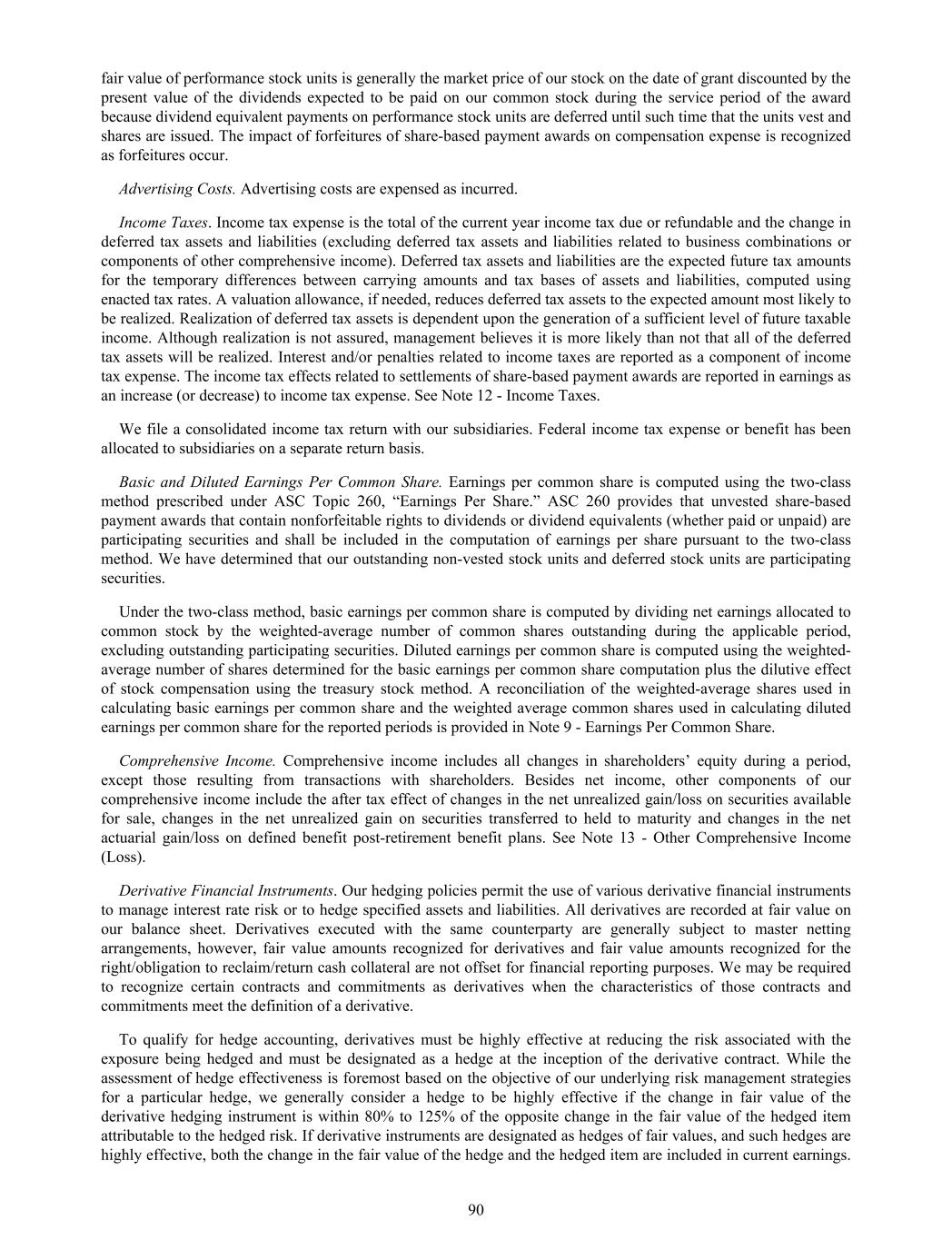 fair value of performance stock units is generally the market price of our stock on the date of grant discounted by the present value of the dividends expected to be paid on our common stock during the service period of the award because dividend equivalent payments on performance stock units are deferred until such time that the units vest and shares are issued. The impact of forfeitures of share-based payment awards on compensation expense is recognized as forfeitures occur. Advertising Costs. Advertising costs are expensed as incurred. Income Taxes. Income tax expense is the total of the current year income tax due or refundable and the change in deferred tax assets and liabilities (excluding deferred tax assets and liabilities related to business combinations or components of other comprehensive income). Deferred tax assets and liabilities are the expected future tax amounts for the temporary differences between carrying amounts and tax bases of assets and liabilities, computed using enacted tax rates. A valuation allowance, if needed, reduces deferred tax assets to the expected amount most likely to be realized. Realization of deferred tax assets is dependent upon the generation of a sufficient level of future taxable income. Although realization is not assured, management believes it is more likely than not that all of the deferred tax assets will be realized. Interest and/or penalties related to income taxes are reported as a component of income tax expense. The income tax effects related to settlements of share-based payment awards are reported in earnings as an increase (or decrease) to income tax expense. See Note 12 - Income Taxes. We file a consolidated income tax return with our subsidiaries. Federal income tax expense or benefit has been allocated to subsidiaries on a separate return basis. Basic and Diluted Earnings Per Common Share. Earnings per common share is computed using the two-class method prescribed under ASC Topic 260, “Earnings Per Share.” ASC 260 provides that unvested share-based payment awards that contain nonforfeitable rights to dividends or dividend equivalents (whether paid or unpaid) are participating securities and shall be included in the computation of earnings per share pursuant to the two-class method. We have determined that our outstanding non-vested stock units and deferred stock units are participating securities. Under the two-class method, basic earnings per common share is computed by dividing net earnings allocated to common stock by the weighted-average number of common shares outstanding during the applicable period, excluding outstanding participating securities. Diluted earnings per common share is computed using the weighted- average number of shares determined for the basic earnings per common share computation plus the dilutive effect of stock compensation using the treasury stock method. A reconciliation of the weighted-average shares used in calculating basic earnings per common share and the weighted average common shares used in calculating diluted earnings per common share for the reported periods is provided in Note 9 - Earnings Per Common Share. Comprehensive Income. Comprehensive income includes all changes in shareholders’ equity during a period, except those resulting from transactions with shareholders. Besides net income, other components of our comprehensive income include the after tax effect of changes in the net unrealized gain/loss on securities available for sale, changes in the net unrealized gain on securities transferred to held to maturity and changes in the net actuarial gain/loss on defined benefit post-retirement benefit plans. See Note 13 - Other Comprehensive Income (Loss). Derivative Financial Instruments. Our hedging policies permit the use of various derivative financial instruments to manage interest rate risk or to hedge specified assets and liabilities. All derivatives are recorded at fair value on our balance sheet. Derivatives executed with the same counterparty are generally subject to master netting arrangements, however, fair value amounts recognized for derivatives and fair value amounts recognized for the right/obligation to reclaim/return cash collateral are not offset for financial reporting purposes. We may be required to recognize certain contracts and commitments as derivatives when the characteristics of those contracts and commitments meet the definition of a derivative. To qualify for hedge accounting, derivatives must be highly effective at reducing the risk associated with the exposure being hedged and must be designated as a hedge at the inception of the derivative contract. While the assessment of hedge effectiveness is foremost based on the objective of our underlying risk management strategies for a particular hedge, we generally consider a hedge to be highly effective if the change in fair value of the derivative hedging instrument is within 80% to 125% of the opposite change in the fair value of the hedged item attributable to the hedged risk. If derivative instruments are designated as hedges of fair values, and such hedges are highly effective, both the change in the fair value of the hedge and the hedged item are included in current earnings. 90