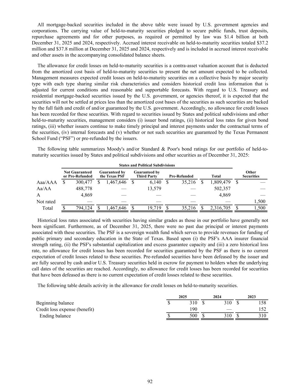 All mortgage-backed securities included in the above table were issued by U.S. government agencies and corporations. The carrying value of held-to-maturity securities pledged to secure public funds, trust deposits, repurchase agreements and for other purposes, as required or permitted by law was $1.4 billion at both December 31, 2025 and 2024, respectively. Accrued interest receivable on held-to-maturity securities totaled $37.2 million and $37.8 million at December 31, 2025 and 2024, respectively and is included in accrued interest receivable and other assets in the accompanying consolidated balance sheets. The allowance for credit losses on held-to-maturity securities is a contra-asset valuation account that is deducted from the amortized cost basis of held-to-maturity securities to present the net amount expected to be collected. Management measures expected credit losses on held-to-maturity securities on a collective basis by major security type with each type sharing similar risk characteristics and considers historical credit loss information that is adjusted for current conditions and reasonable and supportable forecasts. With regard to U.S. Treasury and residential mortgage-backed securities issued by the U.S. government, or agencies thereof, it is expected that the securities will not be settled at prices less than the amortized cost bases of the securities as such securities are backed by the full faith and credit of and/or guaranteed by the U.S. government. Accordingly, no allowance for credit losses has been recorded for these securities. With regard to securities issued by States and political subdivisions and other held-to-maturity securities, management considers (i) issuer bond ratings, (ii) historical loss rates for given bond ratings, (iii) whether issuers continue to make timely principal and interest payments under the contractual terms of the securities, (iv) internal forecasts and (v) whether or not such securities are guaranteed by the Texas Permanent School Fund (“PSF”) or pre-refunded by the issuers. The following table summarizes Moody's and/or Standard & Poor's bond ratings for our portfolio of held-to- maturity securities issued by States and political subdivisions and other securities as of December 31, 2025: States and Political Subdivisions Not Guaranteed or Pre-Refunded Guaranteed by the Texas PSF Guaranteed by Third Party Pre-Refunded Total Other Securities Aaa/AAA $ 300,477 $ 1,467,646 $ 6,140 $ 35,216 $ 1,809,479 $ — Aa/AA 488,778 — 13,579 — 502,357 — A 4,869 — — — 4,869 — Not rated — — — — — 1,500 Total $ 794,124 $ 1,467,646 $ 19,719 $ 35,216 $ 2,316,705 $ 1,500 Historical loss rates associated with securities having similar grades as those in our portfolio have generally not been significant. Furthermore, as of December 31, 2025, there were no past due principal or interest payments associated with these securities. The PSF is a sovereign wealth fund which serves to provide revenues for funding of public primary and secondary education in the State of Texas. Based upon (i) the PSF's AAA insurer financial strength rating, (ii) the PSF's substantial capitalization and excess guarantee capacity and (iii) a zero historical loss rate, no allowance for credit losses has been recorded for securities guaranteed by the PSF as there is no current expectation of credit losses related to these securities. Pre-refunded securities have been defeased by the issuer and are fully secured by cash and/or U.S. Treasury securities held in escrow for payment to holders when the underlying call dates of the securities are reached. Accordingly, no allowance for credit losses has been recorded for securities that have been defeased as there is no current expectation of credit losses related to these securities. The following table details activity in the allowance for credit losses on held-to-maturity securities. 2025 2024 2023 Beginning balance $ 310 $ 310 $ 158 Credit loss expense (benefit) 190 — 152 Ending balance $ 500 $ 310 $ 310 92