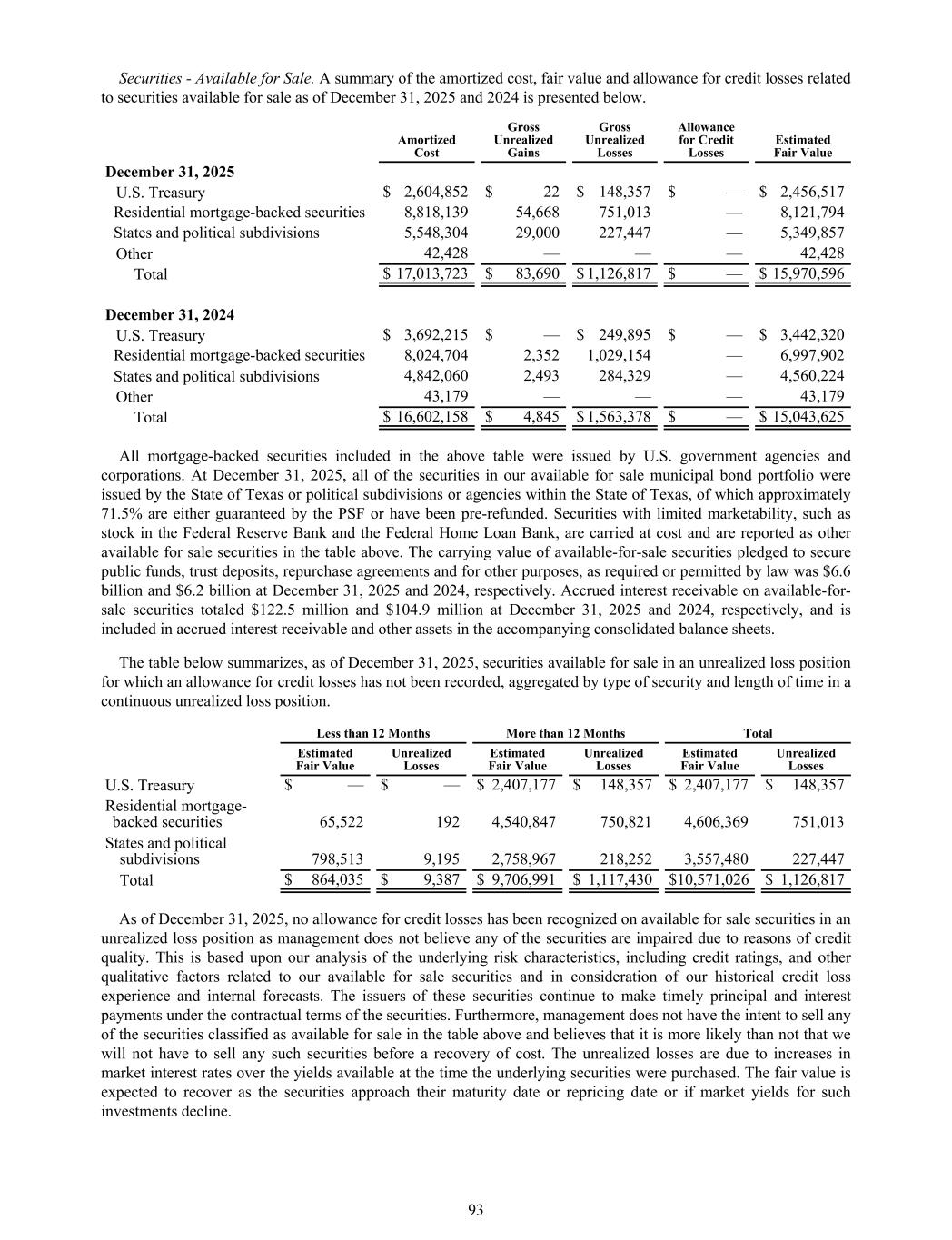Securities - Available for Sale. A summary of the amortized cost, fair value and allowance for credit losses related to securities available for sale as of December 31, 2025 and 2024 is presented below. Amortized Cost Gross Unrealized Gains Gross Unrealized Losses Allowance for Credit Losses Estimated Fair Value December 31, 2025 U.S. Treasury $ 2,604,852 $ 22 $ 148,357 $ — $ 2,456,517 Residential mortgage-backed securities 8,818,139 54,668 751,013 — 8,121,794 States and political subdivisions 5,548,304 29,000 227,447 — 5,349,857 Other 42,428 — — — 42,428 Total $ 17,013,723 $ 83,690 $ 1,126,817 $ — $ 15,970,596 December 31, 2024 U.S. Treasury $ 3,692,215 $ — $ 249,895 $ — $ 3,442,320 Residential mortgage-backed securities 8,024,704 2,352 1,029,154 — 6,997,902 States and political subdivisions 4,842,060 2,493 284,329 — 4,560,224 Other 43,179 — — — 43,179 Total $ 16,602,158 $ 4,845 $ 1,563,378 $ — $ 15,043,625 All mortgage-backed securities included in the above table were issued by U.S. government agencies and corporations. At December 31, 2025, all of the securities in our available for sale municipal bond portfolio were issued by the State of Texas or political subdivisions or agencies within the State of Texas, of which approximately 71.5% are either guaranteed by the PSF or have been pre-refunded. Securities with limited marketability, such as stock in the Federal Reserve Bank and the Federal Home Loan Bank, are carried at cost and are reported as other available for sale securities in the table above. The carrying value of available-for-sale securities pledged to secure public funds, trust deposits, repurchase agreements and for other purposes, as required or permitted by law was $6.6 billion and $6.2 billion at December 31, 2025 and 2024, respectively. Accrued interest receivable on available-for- sale securities totaled $122.5 million and $104.9 million at December 31, 2025 and 2024, respectively, and is included in accrued interest receivable and other assets in the accompanying consolidated balance sheets. The table below summarizes, as of December 31, 2025, securities available for sale in an unrealized loss position for which an allowance for credit losses has not been recorded, aggregated by type of security and length of time in a continuous unrealized loss position. Less than 12 Months More than 12 Months Total Estimated Fair Value Unrealized Losses Estimated Fair Value Unrealized Losses Estimated Fair Value Unrealized Losses U.S. Treasury $ — $ — $ 2,407,177 $ 148,357 $ 2,407,177 $ 148,357 Residential mortgage- backed securities 65,522 192 4,540,847 750,821 4,606,369 751,013 States and political subdivisions 798,513 9,195 2,758,967 218,252 3,557,480 227,447 Total $ 864,035 $ 9,387 $ 9,706,991 $ 1,117,430 $10,571,026 $ 1,126,817 As of December 31, 2025, no allowance for credit losses has been recognized on available for sale securities in an unrealized loss position as management does not believe any of the securities are impaired due to reasons of credit quality. This is based upon our analysis of the underlying risk characteristics, including credit ratings, and other qualitative factors related to our available for sale securities and in consideration of our historical credit loss experience and internal forecasts. The issuers of these securities continue to make timely principal and interest payments under the contractual terms of the securities. Furthermore, management does not have the intent to sell any of the securities classified as available for sale in the table above and believes that it is more likely than not that we will not have to sell any such securities before a recovery of cost. The unrealized losses are due to increases in market interest rates over the yields available at the time the underlying securities were purchased. The fair value is expected to recover as the securities approach their maturity date or repricing date or if market yields for such investments decline. 93