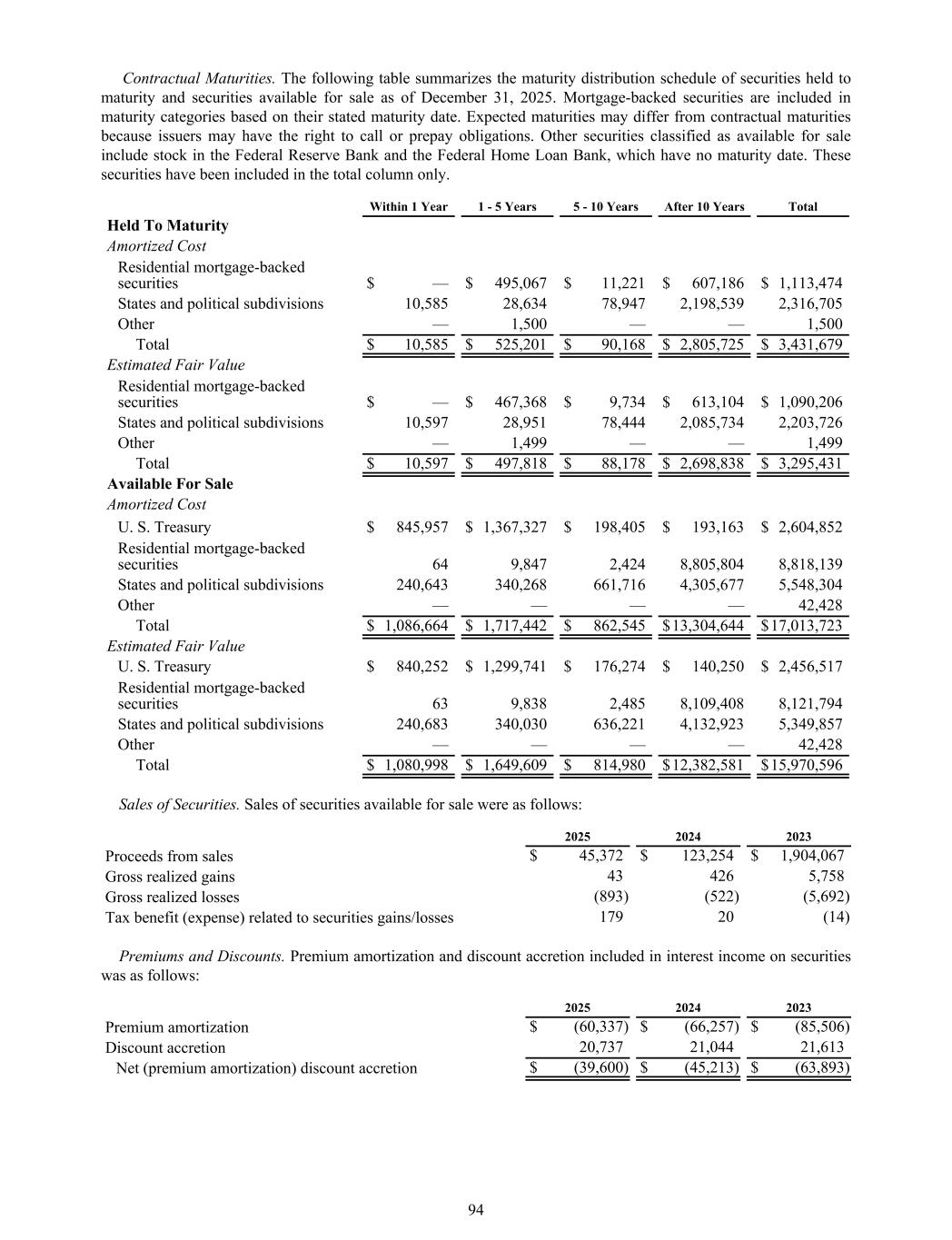 Contractual Maturities. The following table summarizes the maturity distribution schedule of securities held to maturity and securities available for sale as of December 31, 2025. Mortgage-backed securities are included in maturity categories based on their stated maturity date. Expected maturities may differ from contractual maturities because issuers may have the right to call or prepay obligations. Other securities classified as available for sale include stock in the Federal Reserve Bank and the Federal Home Loan Bank, which have no maturity date. These securities have been included in the total column only. Within 1 Year 1 - 5 Years 5 - 10 Years After 10 Years Total Held To Maturity Amortized Cost Residential mortgage-backed securities $ — $ 495,067 $ 11,221 $ 607,186 $ 1,113,474 States and political subdivisions 10,585 28,634 78,947 2,198,539 2,316,705 Other — 1,500 — — 1,500 Total $ 10,585 $ 525,201 $ 90,168 $ 2,805,725 $ 3,431,679 Estimated Fair Value Residential mortgage-backed securities $ — $ 467,368 $ 9,734 $ 613,104 $ 1,090,206 States and political subdivisions 10,597 28,951 78,444 2,085,734 2,203,726 Other — 1,499 — — 1,499 Total $ 10,597 $ 497,818 $ 88,178 $ 2,698,838 $ 3,295,431 Available For Sale Amortized Cost U. S. Treasury $ 845,957 $ 1,367,327 $ 198,405 $ 193,163 $ 2,604,852 Residential mortgage-backed securities 64 9,847 2,424 8,805,804 8,818,139 States and political subdivisions 240,643 340,268 661,716 4,305,677 5,548,304 Other — — — — 42,428 Total $ 1,086,664 $ 1,717,442 $ 862,545 $13,304,644 $17,013,723 Estimated Fair Value U. S. Treasury $ 840,252 $ 1,299,741 $ 176,274 $ 140,250 $ 2,456,517 Residential mortgage-backed securities 63 9,838 2,485 8,109,408 8,121,794 States and political subdivisions 240,683 340,030 636,221 4,132,923 5,349,857 Other — — — — 42,428 Total $ 1,080,998 $ 1,649,609 $ 814,980 $12,382,581 $15,970,596 Sales of Securities. Sales of securities available for sale were as follows: 2025 2024 2023 Proceeds from sales $ 45,372 $ 123,254 $ 1,904,067 Gross realized gains 43 426 5,758 Gross realized losses (893) (522) (5,692) Tax benefit (expense) related to securities gains/losses 179 20 (14) Premiums and Discounts. Premium amortization and discount accretion included in interest income on securities was as follows: 2025 2024 2023 Premium amortization $ (60,337) $ (66,257) $ (85,506) Discount accretion 20,737 21,044 21,613 Net (premium amortization) discount accretion $ (39,600) $ (45,213) $ (63,893) 94