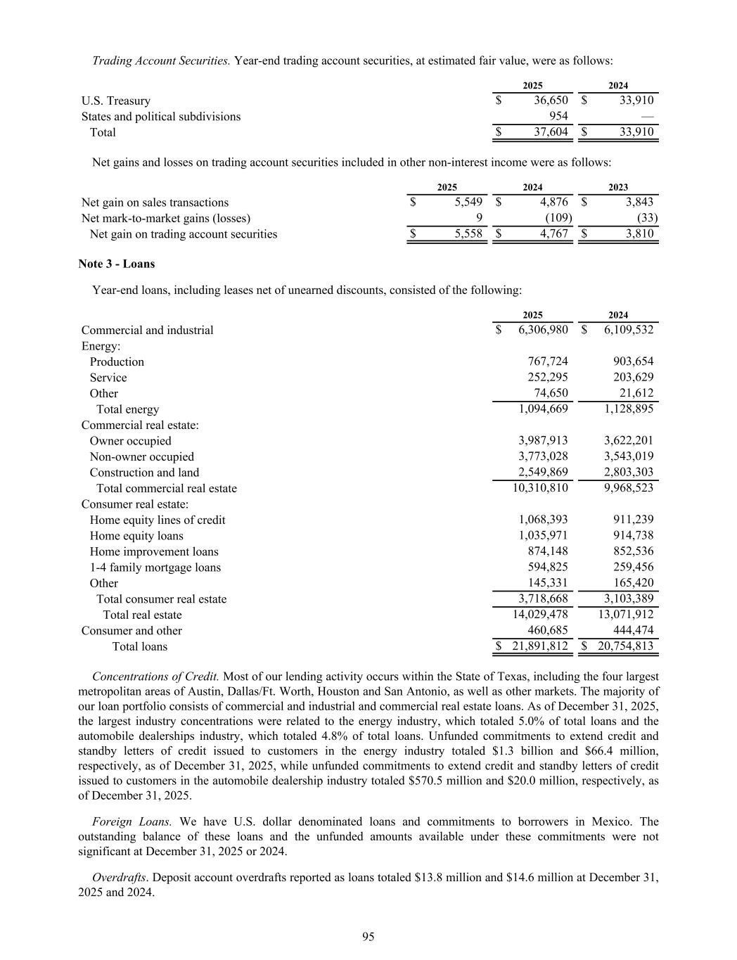 Trading Account Securities. Year-end trading account securities, at estimated fair value, were as follows: 2025 2024 U.S. Treasury $ 36,650 $ 33,910 States and political subdivisions 954 — Total $ 37,604 $ 33,910 Net gains and losses on trading account securities included in other non-interest income were as follows: 2025 2024 2023 Net gain on sales transactions $ 5,549 $ 4,876 $ 3,843 Net mark-to-market gains (losses) 9 (109) (33) Net gain on trading account securities $ 5,558 $ 4,767 $ 3,810 Note 3 - Loans Year-end loans, including leases net of unearned discounts, consisted of the following: 2025 2024 Commercial and industrial $ 6,306,980 $ 6,109,532 Energy: Production 767,724 903,654 Service 252,295 203,629 Other 74,650 21,612 Total energy 1,094,669 1,128,895 Commercial real estate: Owner occupied 3,987,913 3,622,201 Non-owner occupied 3,773,028 3,543,019 Construction and land 2,549,869 2,803,303 Total commercial real estate 10,310,810 9,968,523 Consumer real estate: Home equity lines of credit 1,068,393 911,239 Home equity loans 1,035,971 914,738 Home improvement loans 874,148 852,536 1-4 family mortgage loans 594,825 259,456 Other 145,331 165,420 Total consumer real estate 3,718,668 3,103,389 Total real estate 14,029,478 13,071,912 Consumer and other 460,685 444,474 Total loans $ 21,891,812 $ 20,754,813 Concentrations of Credit. Most of our lending activity occurs within the State of Texas, including the four largest metropolitan areas of Austin, Dallas/Ft. Worth, Houston and San Antonio, as well as other markets. The majority of our loan portfolio consists of commercial and industrial and commercial real estate loans. As of December 31, 2025, the largest industry concentrations were related to the energy industry, which totaled 5.0% of total loans and the automobile dealerships industry, which totaled 4.8% of total loans. Unfunded commitments to extend credit and standby letters of credit issued to customers in the energy industry totaled $1.3 billion and $66.4 million, respectively, as of December 31, 2025, while unfunded commitments to extend credit and standby letters of credit issued to customers in the automobile dealership industry totaled $570.5 million and $20.0 million, respectively, as of December 31, 2025. Foreign Loans. We have U.S. dollar denominated loans and commitments to borrowers in Mexico. The outstanding balance of these loans and the unfunded amounts available under these commitments were not significant at December 31, 2025 or 2024. Overdrafts. Deposit account overdrafts reported as loans totaled $13.8 million and $14.6 million at December 31, 2025 and 2024. 95