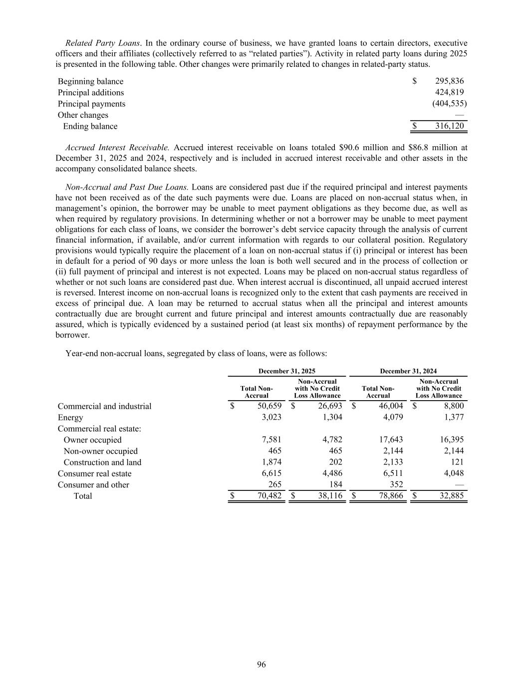 Related Party Loans. In the ordinary course of business, we have granted loans to certain directors, executive officers and their affiliates (collectively referred to as “related parties”). Activity in related party loans during 2025 is presented in the following table. Other changes were primarily related to changes in related-party status. Beginning balance $ 295,836 Principal additions 424,819 Principal payments (404,535) Other changes — Ending balance $ 316,120 Accrued Interest Receivable. Accrued interest receivable on loans totaled $90.6 million and $86.8 million at December 31, 2025 and 2024, respectively and is included in accrued interest receivable and other assets in the accompany consolidated balance sheets. Non-Accrual and Past Due Loans. Loans are considered past due if the required principal and interest payments have not been received as of the date such payments were due. Loans are placed on non-accrual status when, in management’s opinion, the borrower may be unable to meet payment obligations as they become due, as well as when required by regulatory provisions. In determining whether or not a borrower may be unable to meet payment obligations for each class of loans, we consider the borrower’s debt service capacity through the analysis of current financial information, if available, and/or current information with regards to our collateral position. Regulatory provisions would typically require the placement of a loan on non-accrual status if (i) principal or interest has been in default for a period of 90 days or more unless the loan is both well secured and in the process of collection or (ii) full payment of principal and interest is not expected. Loans may be placed on non-accrual status regardless of whether or not such loans are considered past due. When interest accrual is discontinued, all unpaid accrued interest is reversed. Interest income on non-accrual loans is recognized only to the extent that cash payments are received in excess of principal due. A loan may be returned to accrual status when all the principal and interest amounts contractually due are brought current and future principal and interest amounts contractually due are reasonably assured, which is typically evidenced by a sustained period (at least six months) of repayment performance by the borrower. Year-end non-accrual loans, segregated by class of loans, were as follows: December 31, 2025 December 31, 2024 Total Non- Accrual Non-Accrual with No Credit Loss Allowance Total Non- Accrual Non-Accrual with No Credit Loss Allowance Commercial and industrial $ 50,659 $ 26,693 $ 46,004 $ 8,800 Energy 3,023 1,304 4,079 1,377 Commercial real estate: Owner occupied 7,581 4,782 17,643 16,395 Non-owner occupied 465 465 2,144 2,144 Construction and land 1,874 202 2,133 121 Consumer real estate 6,615 4,486 6,511 4,048 Consumer and other 265 184 352 — Total $ 70,482 $ 38,116 $ 78,866 $ 32,885 96