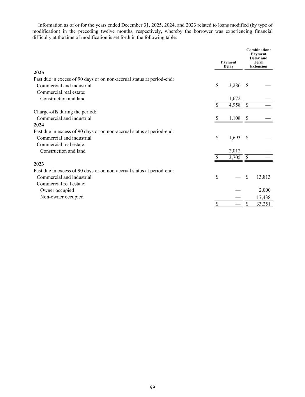 Information as of or for the years ended December 31, 2025, 2024, and 2023 related to loans modified (by type of modification) in the preceding twelve months, respectively, whereby the borrower was experiencing financial difficulty at the time of modification is set forth in the following table. 2025 Past due in excess of 90 days or on non-accrual status at period-end: Commercial and industrial $ 3,286 $ — Commercial real estate: Construction and land 1,672 — $ 4,958 $ — Charge-offs during the period: Commercial and industrial $ 1,108 $ — 2024 Past due in excess of 90 days or on non-accrual status at period-end: Commercial and industrial $ 1,693 $ — Commercial real estate: Construction and land 2,012 — $ 3,705 $ — 2023 Past due in excess of 90 days or on non-accrual status at period-end: Commercial and industrial $ — $ 13,813 Commercial real estate: Owner occupied — 2,000 Non-owner occupied — 17,438 $ — $ 33,251 Payment Delay Combination: Payment Delay and Term Extension 99