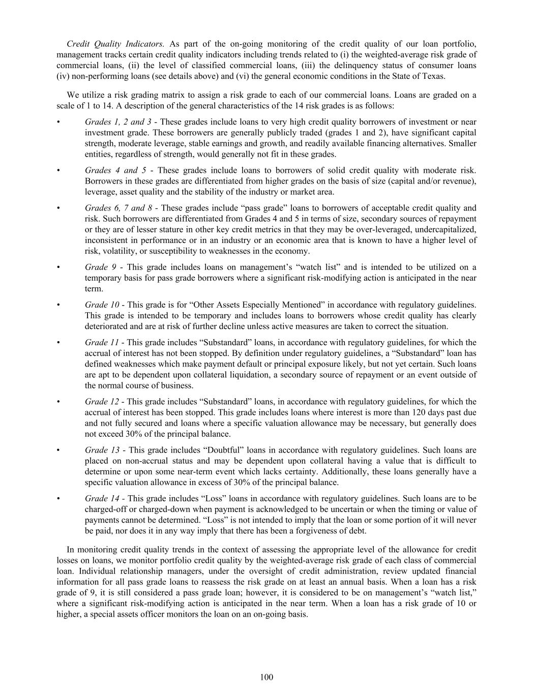 Credit Quality Indicators. As part of the on-going monitoring of the credit quality of our loan portfolio, management tracks certain credit quality indicators including trends related to (i) the weighted-average risk grade of commercial loans, (ii) the level of classified commercial loans, (iii) the delinquency status of consumer loans (iv) non-performing loans (see details above) and (vi) the general economic conditions in the State of Texas. We utilize a risk grading matrix to assign a risk grade to each of our commercial loans. Loans are graded on a scale of 1 to 14. A description of the general characteristics of the 14 risk grades is as follows: • Grades 1, 2 and 3 - These grades include loans to very high credit quality borrowers of investment or near investment grade. These borrowers are generally publicly traded (grades 1 and 2), have significant capital strength, moderate leverage, stable earnings and growth, and readily available financing alternatives. Smaller entities, regardless of strength, would generally not fit in these grades. • Grades 4 and 5 - These grades include loans to borrowers of solid credit quality with moderate risk. Borrowers in these grades are differentiated from higher grades on the basis of size (capital and/or revenue), leverage, asset quality and the stability of the industry or market area. • Grades 6, 7 and 8 - These grades include “pass grade” loans to borrowers of acceptable credit quality and risk. Such borrowers are differentiated from Grades 4 and 5 in terms of size, secondary sources of repayment or they are of lesser stature in other key credit metrics in that they may be over-leveraged, undercapitalized, inconsistent in performance or in an industry or an economic area that is known to have a higher level of risk, volatility, or susceptibility to weaknesses in the economy. • Grade 9 - This grade includes loans on management’s “watch list” and is intended to be utilized on a temporary basis for pass grade borrowers where a significant risk-modifying action is anticipated in the near term. • Grade 10 - This grade is for “Other Assets Especially Mentioned” in accordance with regulatory guidelines. This grade is intended to be temporary and includes loans to borrowers whose credit quality has clearly deteriorated and are at risk of further decline unless active measures are taken to correct the situation. • Grade 11 - This grade includes “Substandard” loans, in accordance with regulatory guidelines, for which the accrual of interest has not been stopped. By definition under regulatory guidelines, a “Substandard” loan has defined weaknesses which make payment default or principal exposure likely, but not yet certain. Such loans are apt to be dependent upon collateral liquidation, a secondary source of repayment or an event outside of the normal course of business. • Grade 12 - This grade includes “Substandard” loans, in accordance with regulatory guidelines, for which the accrual of interest has been stopped. This grade includes loans where interest is more than 120 days past due and not fully secured and loans where a specific valuation allowance may be necessary, but generally does not exceed 30% of the principal balance. • Grade 13 - This grade includes “Doubtful” loans in accordance with regulatory guidelines. Such loans are placed on non-accrual status and may be dependent upon collateral having a value that is difficult to determine or upon some near-term event which lacks certainty. Additionally, these loans generally have a specific valuation allowance in excess of 30% of the principal balance. • Grade 14 - This grade includes “Loss” loans in accordance with regulatory guidelines. Such loans are to be charged-off or charged-down when payment is acknowledged to be uncertain or when the timing or value of payments cannot be determined. “Loss” is not intended to imply that the loan or some portion of it will never be paid, nor does it in any way imply that there has been a forgiveness of debt. In monitoring credit quality trends in the context of assessing the appropriate level of the allowance for credit losses on loans, we monitor portfolio credit quality by the weighted-average risk grade of each class of commercial loan. Individual relationship managers, under the oversight of credit administration, review updated financial information for all pass grade loans to reassess the risk grade on at least an annual basis. When a loan has a risk grade of 9, it is still considered a pass grade loan; however, it is considered to be on management’s “watch list,” where a significant risk-modifying action is anticipated in the near term. When a loan has a risk grade of 10 or higher, a special assets officer monitors the loan on an on-going basis. 100