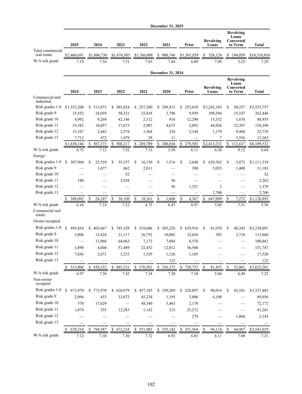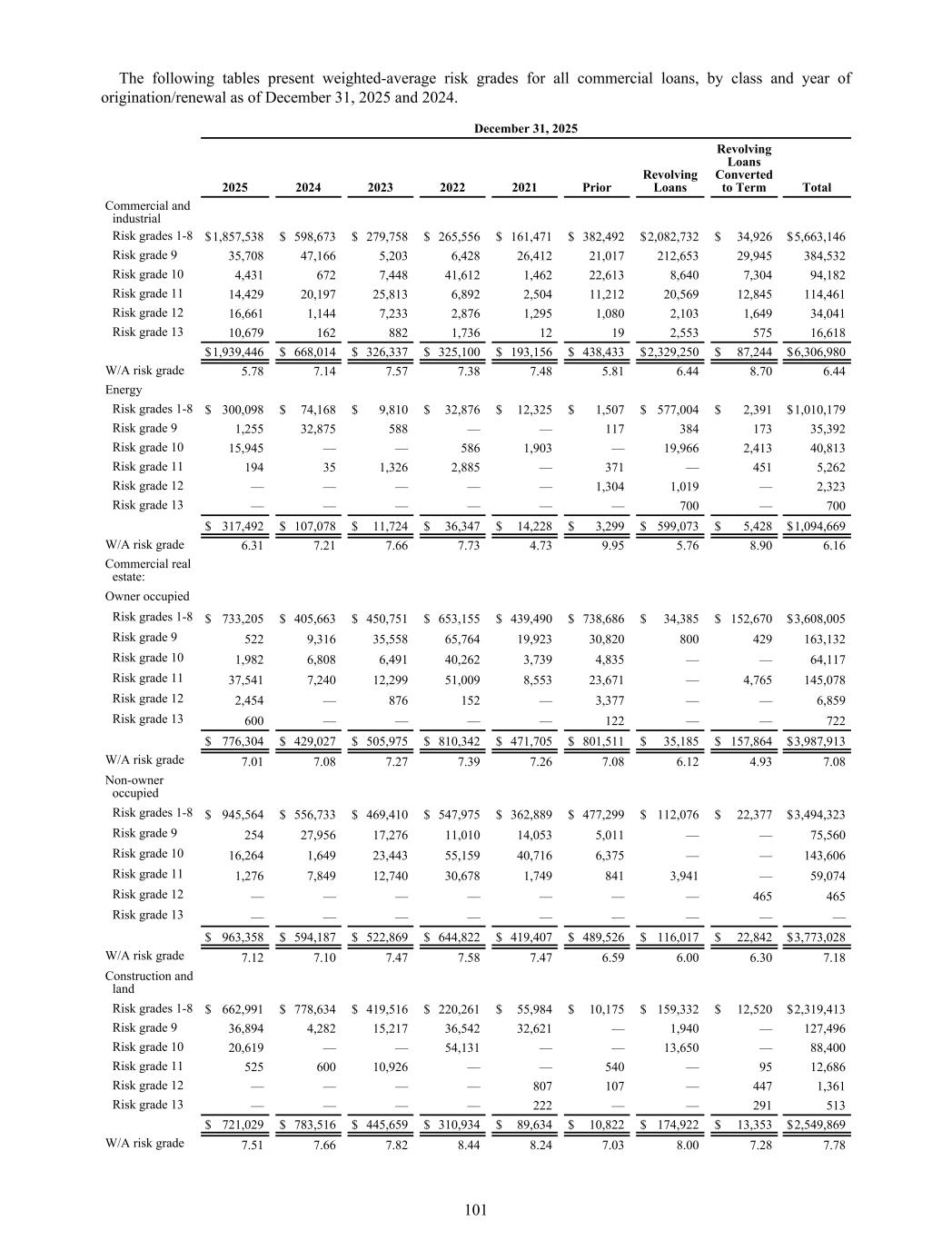 Total commercial real estate $2,460,691 $1,806,730 $1,474,503 $1,766,098 $ 980,746 $1,301,859 $ 326,124 $ 194,059 $10,310,810 W/A risk grade 7.19 7.34 7.51 7.65 7.44 6.89 7.09 5.25 7.29 December 31, 2025 2025 2024 2023 2022 2021 Prior Revolving Loans Revolving Loans Converted to Term Total Commercial and industrial Risk grades 1-8 $1,553,200 $ 513,073 $ 385,824 $ 257,280 $ 298,912 $ 253,018 $2,242,193 $ 50,257 $5,553,757 Risk grade 9 15,552 24,059 58,521 25,818 3,796 9,959 109,594 15,147 262,446 Risk grade 10 4,992 9,269 42,146 2,112 918 12,290 15,332 1,876 88,935 Risk grade 11 35,583 18,057 17,673 2,987 4,675 2,092 44,926 32,397 158,390 Risk grade 12 13,107 2,443 2,574 1,564 324 2,144 1,179 9,404 32,739 Risk grade 13 7,712 472 1,479 28 11 — 7 3,556 13,265 $1,630,146 $ 567,373 $ 508,217 $ 289,789 $ 308,636 $ 279,503 $2,413,231 $ 112,637 $6,109,532 W/A risk grade 6.73 7.12 7.52 7.13 5.58 6.11 6.30 9.12 6.64 Energy Risk grades 1-8 $ 387,904 $ 22,510 $ 35,357 $ 16,150 $ 1,516 $ 2,648 $ 639,362 $ 5,872 $1,111,319 Risk grade 9 — 1,677 662 2,011 — 398 5,035 1,400 11,183 Risk grade 10 — — 52 — — — — — 52 Risk grade 11 188 — 2,038 — 36 — — — 2,262 Risk grade 12 — — — — 56 1,321 2 — 1,379 Risk grade 13 — — — — — — 2,700 — 2,700 $ 388,092 $ 24,187 $ 38,109 $ 18,161 $ 1,608 $ 4,367 $ 647,099 $ 7,272 $1,128,895 W/A risk grade 6.16 7.14 7.53 4.75 6.47 8.97 5.05 7.31 5.58 Commercial real estate: Owner occupied Risk grades 1-8 $ 495,854 $ 403,667 $ 745,329 $ 518,686 $ 305,226 $ 639,916 $ 81,070 $ 48,343 $3,238,091 Risk grade 9 5,806 13,424 21,117 26,752 10,002 32,656 385 3,718 113,860 Risk grade 10 — 13,966 64,063 7,172 7,084 8,576 — — 100,861 Risk grade 11 3,890 4,604 51,489 22,452 12,812 56,500 — — 151,747 Risk grade 12 7,856 2,671 3,233 1,529 1,126 1,105 — — 17,520 Risk grade 13 — — — — 122 — — — 122 $ 513,406 $ 438,332 $ 885,231 $ 576,591 $ 336,372 $ 738,753 $ 81,455 $ 52,061 $3,622,201 W/A risk grade 6.97 7.26 7.42 7.34 7.20 7.34 5.06 6.48 7.22 Non-owner occupied Risk grades 1-8 $ 673,970 $ 775,970 $ 626,079 $ 457,185 $ 350,269 $ 320,897 $ 90,014 $ 43,101 $3,337,485 Risk grade 9 2,096 453 33,872 45,234 1,195 3,006 4,100 — 89,956 Risk grade 10 570 17,629 — 48,340 3,463 2,170 — — 72,172 Risk grade 11 1,874 535 12,283 1,142 215 25,212 — — 41,261 Risk grade 12 — — — — — 279 — 1,866 2,145 Risk grade 13 — — — — — — — — — $ 678,510 $ 794,587 $ 672,234 $ 551,901 $ 355,142 $ 351,564 $ 94,114 $ 44,967 $3,543,019 W/A risk grade 7.12 7.30 7.30 7.72 6.92 6.83 6.11 7.08 7.21 December 31, 2024 2024 2023 2022 2021 2020 Prior Revolving Loans Revolving Loans Converted to Term Total 102