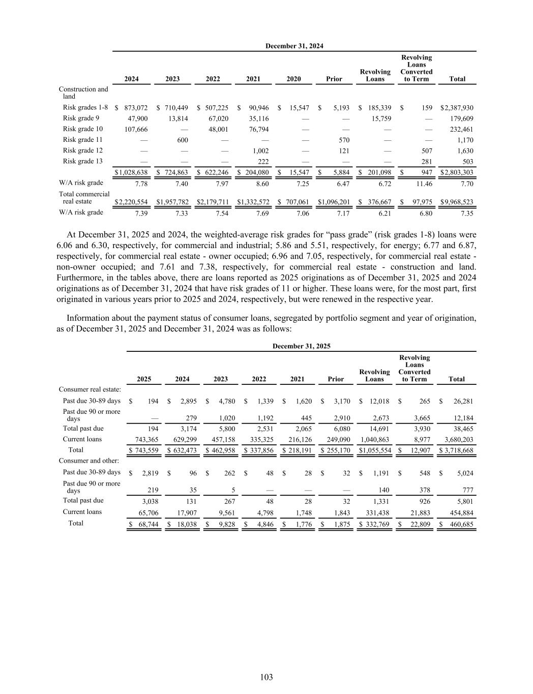 Construction and land Risk grades 1-8 $ 873,072 $ 710,449 $ 507,225 $ 90,946 $ 15,547 $ 5,193 $ 185,339 $ 159 $2,387,930 Risk grade 9 47,900 13,814 67,020 35,116 — — 15,759 — 179,609 Risk grade 10 107,666 — 48,001 76,794 — — — — 232,461 Risk grade 11 — 600 — — — 570 — — 1,170 Risk grade 12 — — — 1,002 — 121 — 507 1,630 Risk grade 13 — — — 222 — — — 281 503 $1,028,638 $ 724,863 $ 622,246 $ 204,080 $ 15,547 $ 5,884 $ 201,098 $ 947 $2,803,303 W/A risk grade 7.78 7.40 7.97 8.60 7.25 6.47 6.72 11.46 7.70 Total commercial real estate $2,220,554 $1,957,782 $2,179,711 $1,332,572 $ 707,061 $1,096,201 $ 376,667 $ 97,975 $9,968,523 W/A risk grade 7.39 7.33 7.54 7.69 7.06 7.17 6.21 6.80 7.35 December 31, 2024 2024 2023 2022 2021 2020 Prior Revolving Loans Revolving Loans Converted to Term Total At December 31, 2025 and 2024, the weighted-average risk grades for “pass grade” (risk grades 1-8) loans were 6.06 and 6.30, respectively, for commercial and industrial; 5.86 and 5.51, respectively, for energy; 6.77 and 6.87, respectively, for commercial real estate - owner occupied; 6.96 and 7.05, respectively, for commercial real estate - non-owner occupied; and 7.61 and 7.38, respectively, for commercial real estate - construction and land. Furthermore, in the tables above, there are loans reported as 2025 originations as of December 31, 2025 and 2024 originations as of December 31, 2024 that have risk grades of 11 or higher. These loans were, for the most part, first originated in various years prior to 2025 and 2024, respectively, but were renewed in the respective year. Information about the payment status of consumer loans, segregated by portfolio segment and year of origination, as of December 31, 2025 and December 31, 2024 was as follows: December 31, 2025 2025 2024 2023 2022 2021 Prior Revolving Loans Revolving Loans Converted to Term Total Consumer real estate: Past due 30-89 days $ 194 $ 2,895 $ 4,780 $ 1,339 $ 1,620 $ 3,170 $ 12,018 $ 265 $ 26,281 Past due 90 or more days — 279 1,020 1,192 445 2,910 2,673 3,665 12,184 Total past due 194 3,174 5,800 2,531 2,065 6,080 14,691 3,930 38,465 Current loans 743,365 629,299 457,158 335,325 216,126 249,090 1,040,863 8,977 3,680,203 Total $ 743,559 $ 632,473 $ 462,958 $ 337,856 $ 218,191 $ 255,170 $1,055,554 $ 12,907 $ 3,718,668 Consumer and other: Past due 30-89 days $ 2,819 $ 96 $ 262 $ 48 $ 28 $ 32 $ 1,191 $ 548 $ 5,024 Past due 90 or more days 219 35 5 — — — 140 378 777 Total past due 3,038 131 267 48 28 32 1,331 926 5,801 Current loans 65,706 17,907 9,561 4,798 1,748 1,843 331,438 21,883 454,884 Total $ 68,744 $ 18,038 $ 9,828 $ 4,846 $ 1,776 $ 1,875 $ 332,769 $ 22,809 $ 460,685 103