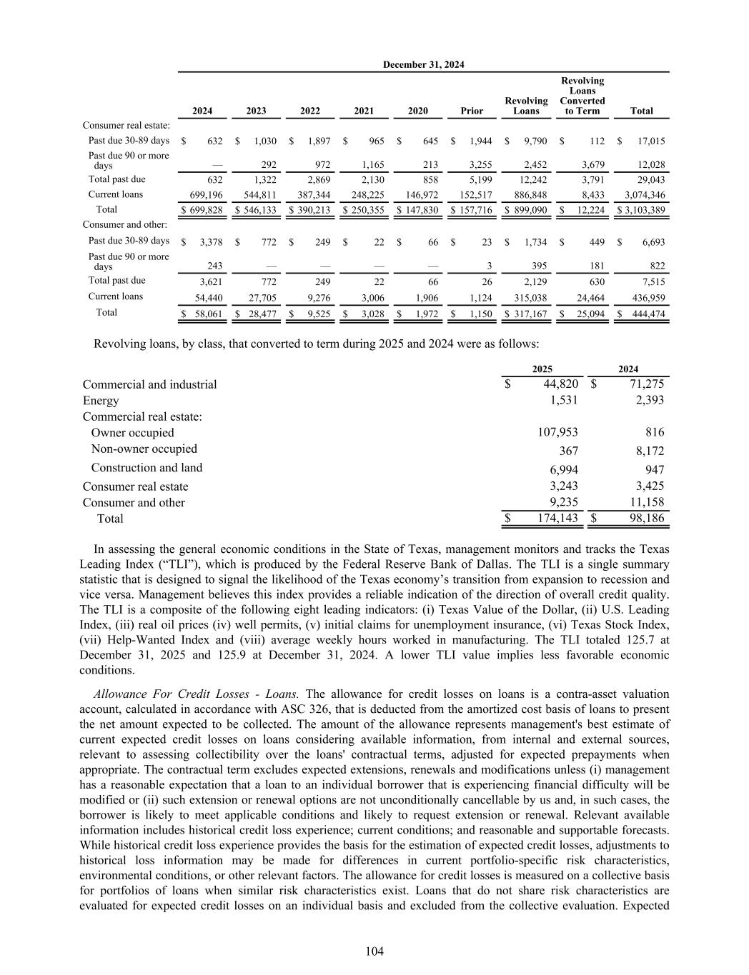 December 31, 2024 2024 2023 2022 2021 2020 Prior Revolving Loans Revolving Loans Converted to Term Total Consumer real estate: Past due 30-89 days $ 632 $ 1,030 $ 1,897 $ 965 $ 645 $ 1,944 $ 9,790 $ 112 $ 17,015 Past due 90 or more days — 292 972 1,165 213 3,255 2,452 3,679 12,028 Total past due 632 1,322 2,869 2,130 858 5,199 12,242 3,791 29,043 Current loans 699,196 544,811 387,344 248,225 146,972 152,517 886,848 8,433 3,074,346 Total $ 699,828 $ 546,133 $ 390,213 $ 250,355 $ 147,830 $ 157,716 $ 899,090 $ 12,224 $ 3,103,389 Consumer and other: Past due 30-89 days $ 3,378 $ 772 $ 249 $ 22 $ 66 $ 23 $ 1,734 $ 449 $ 6,693 Past due 90 or more days 243 — — — — 3 395 181 822 Total past due 3,621 772 249 22 66 26 2,129 630 7,515 Current loans 54,440 27,705 9,276 3,006 1,906 1,124 315,038 24,464 436,959 Total $ 58,061 $ 28,477 $ 9,525 $ 3,028 $ 1,972 $ 1,150 $ 317,167 $ 25,094 $ 444,474 Revolving loans, by class, that converted to term during 2025 and 2024 were as follows: 2025 2024 Commercial and industrial $ 44,820 $ 71,275 Energy 1,531 2,393 Commercial real estate: Owner occupied 107,953 816 Non-owner occupied 367 8,172 Construction and land 6,994 947 Consumer real estate 3,243 3,425 Consumer and other 9,235 11,158 Total $ 174,143 $ 98,186 In assessing the general economic conditions in the State of Texas, management monitors and tracks the Texas Leading Index (“TLI”), which is produced by the Federal Reserve Bank of Dallas. The TLI is a single summary statistic that is designed to signal the likelihood of the Texas economy’s transition from expansion to recession and vice versa. Management believes this index provides a reliable indication of the direction of overall credit quality. The TLI is a composite of the following eight leading indicators: (i) Texas Value of the Dollar, (ii) U.S. Leading Index, (iii) real oil prices (iv) well permits, (v) initial claims for unemployment insurance, (vi) Texas Stock Index, (vii) Help-Wanted Index and (viii) average weekly hours worked in manufacturing. The TLI totaled 125.7 at December 31, 2025 and 125.9 at December 31, 2024. A lower TLI value implies less favorable economic conditions. Allowance For Credit Losses - Loans. The allowance for credit losses on loans is a contra-asset valuation account, calculated in accordance with ASC 326, that is deducted from the amortized cost basis of loans to present the net amount expected to be collected. The amount of the allowance represents management's best estimate of current expected credit losses on loans considering available information, from internal and external sources, relevant to assessing collectibility over the loans' contractual terms, adjusted for expected prepayments when appropriate. The contractual term excludes expected extensions, renewals and modifications unless (i) management has a reasonable expectation that a loan to an individual borrower that is experiencing financial difficulty will be modified or (ii) such extension or renewal options are not unconditionally cancellable by us and, in such cases, the borrower is likely to meet applicable conditions and likely to request extension or renewal. Relevant available information includes historical credit loss experience; current conditions; and reasonable and supportable forecasts. While historical credit loss experience provides the basis for the estimation of expected credit losses, adjustments to historical loss information may be made for differences in current portfolio-specific risk characteristics, environmental conditions, or other relevant factors. The allowance for credit losses is measured on a collective basis for portfolios of loans when similar risk characteristics exist. Loans that do not share risk characteristics are evaluated for expected credit losses on an individual basis and excluded from the collective evaluation. Expected 104
