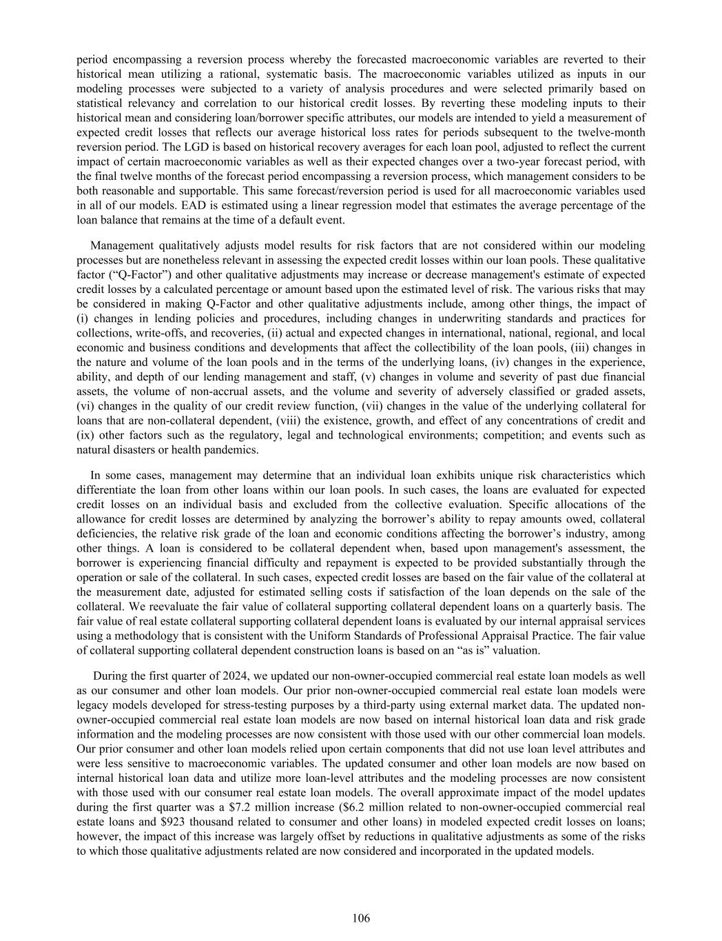 period encompassing a reversion process whereby the forecasted macroeconomic variables are reverted to their historical mean utilizing a rational, systematic basis. The macroeconomic variables utilized as inputs in our modeling processes were subjected to a variety of analysis procedures and were selected primarily based on statistical relevancy and correlation to our historical credit losses. By reverting these modeling inputs to their historical mean and considering loan/borrower specific attributes, our models are intended to yield a measurement of expected credit losses that reflects our average historical loss rates for periods subsequent to the twelve-month reversion period. The LGD is based on historical recovery averages for each loan pool, adjusted to reflect the current impact of certain macroeconomic variables as well as their expected changes over a two-year forecast period, with the final twelve months of the forecast period encompassing a reversion process, which management considers to be both reasonable and supportable. This same forecast/reversion period is used for all macroeconomic variables used in all of our models. EAD is estimated using a linear regression model that estimates the average percentage of the loan balance that remains at the time of a default event. Management qualitatively adjusts model results for risk factors that are not considered within our modeling processes but are nonetheless relevant in assessing the expected credit losses within our loan pools. These qualitative factor (“Q-Factor”) and other qualitative adjustments may increase or decrease management's estimate of expected credit losses by a calculated percentage or amount based upon the estimated level of risk. The various risks that may be considered in making Q-Factor and other qualitative adjustments include, among other things, the impact of (i) changes in lending policies and procedures, including changes in underwriting standards and practices for collections, write-offs, and recoveries, (ii) actual and expected changes in international, national, regional, and local economic and business conditions and developments that affect the collectibility of the loan pools, (iii) changes in the nature and volume of the loan pools and in the terms of the underlying loans, (iv) changes in the experience, ability, and depth of our lending management and staff, (v) changes in volume and severity of past due financial assets, the volume of non-accrual assets, and the volume and severity of adversely classified or graded assets, (vi) changes in the quality of our credit review function, (vii) changes in the value of the underlying collateral for loans that are non-collateral dependent, (viii) the existence, growth, and effect of any concentrations of credit and (ix) other factors such as the regulatory, legal and technological environments; competition; and events such as natural disasters or health pandemics. In some cases, management may determine that an individual loan exhibits unique risk characteristics which differentiate the loan from other loans within our loan pools. In such cases, the loans are evaluated for expected credit losses on an individual basis and excluded from the collective evaluation. Specific allocations of the allowance for credit losses are determined by analyzing the borrower’s ability to repay amounts owed, collateral deficiencies, the relative risk grade of the loan and economic conditions affecting the borrower’s industry, among other things. A loan is considered to be collateral dependent when, based upon management's assessment, the borrower is experiencing financial difficulty and repayment is expected to be provided substantially through the operation or sale of the collateral. In such cases, expected credit losses are based on the fair value of the collateral at the measurement date, adjusted for estimated selling costs if satisfaction of the loan depends on the sale of the collateral. We reevaluate the fair value of collateral supporting collateral dependent loans on a quarterly basis. The fair value of real estate collateral supporting collateral dependent loans is evaluated by our internal appraisal services using a methodology that is consistent with the Uniform Standards of Professional Appraisal Practice. The fair value of collateral supporting collateral dependent construction loans is based on an “as is” valuation. During the first quarter of 2024, we updated our non-owner-occupied commercial real estate loan models as well as our consumer and other loan models. Our prior non-owner-occupied commercial real estate loan models were legacy models developed for stress-testing purposes by a third-party using external market data. The updated non- owner-occupied commercial real estate loan models are now based on internal historical loan data and risk grade information and the modeling processes are now consistent with those used with our other commercial loan models. Our prior consumer and other loan models relied upon certain components that did not use loan level attributes and were less sensitive to macroeconomic variables. The updated consumer and other loan models are now based on internal historical loan data and utilize more loan-level attributes and the modeling processes are now consistent with those used with our consumer real estate loan models. The overall approximate impact of the model updates during the first quarter was a $7.2 million increase ($6.2 million related to non-owner-occupied commercial real estate loans and $923 thousand related to consumer and other loans) in modeled expected credit losses on loans; however, the impact of this increase was largely offset by reductions in qualitative adjustments as some of the risks to which those qualitative adjustments related are now considered and incorporated in the updated models. 106