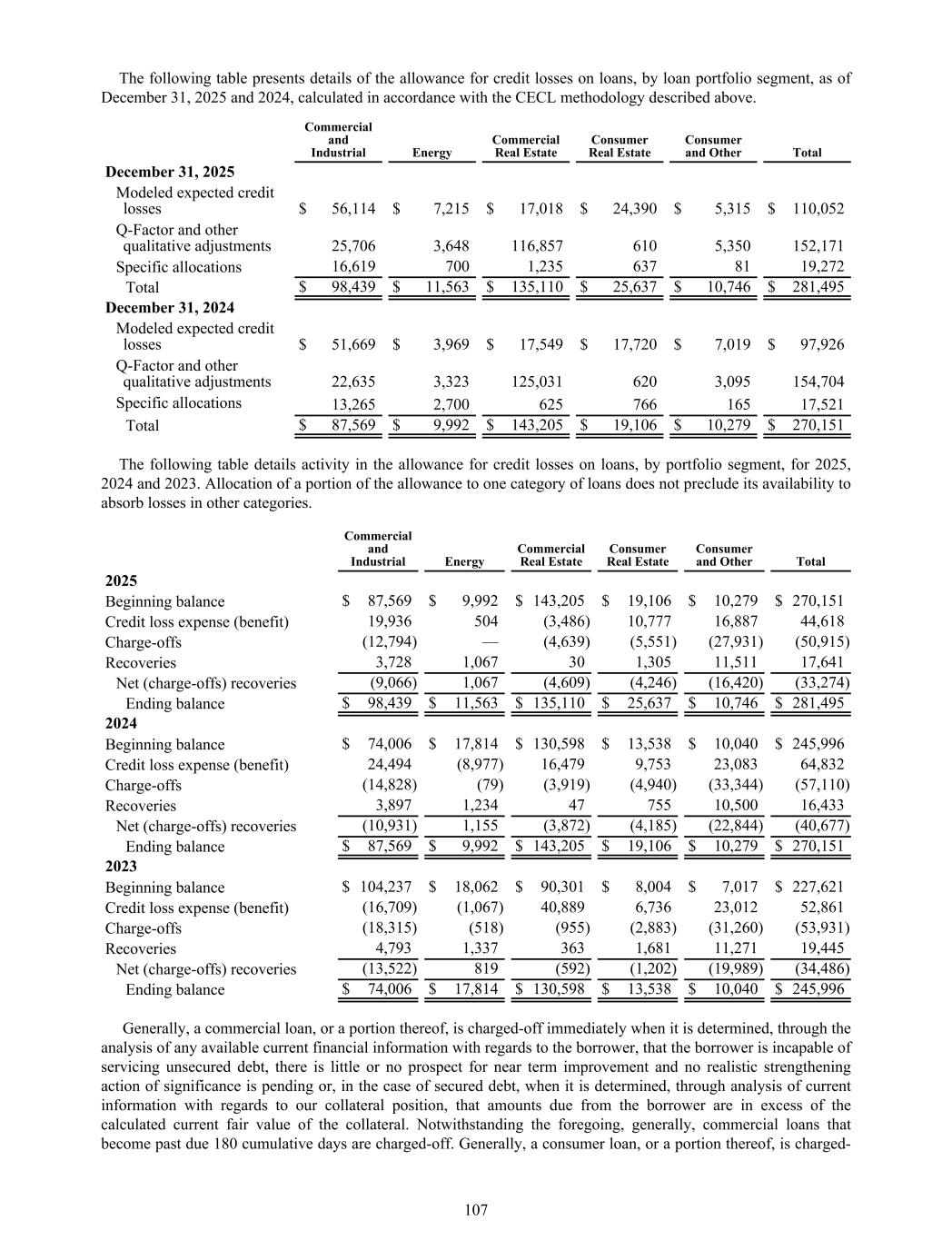 The following table presents details of the allowance for credit losses on loans, by loan portfolio segment, as of December 31, 2025 and 2024, calculated in accordance with the CECL methodology described above. Commercial and Industrial Energy Commercial Real Estate Consumer Real Estate Consumer and Other Total December 31, 2025 Modeled expected credit losses $ 56,114 $ 7,215 $ 17,018 $ 24,390 $ 5,315 $ 110,052 Q-Factor and other qualitative adjustments 25,706 3,648 116,857 610 5,350 152,171 Specific allocations 16,619 700 1,235 637 81 19,272 Total $ 98,439 $ 11,563 $ 135,110 $ 25,637 $ 10,746 $ 281,495 December 31, 2024 Modeled expected credit losses $ 51,669 $ 3,969 $ 17,549 $ 17,720 $ 7,019 $ 97,926 Q-Factor and other qualitative adjustments 22,635 3,323 125,031 620 3,095 154,704 Specific allocations 13,265 2,700 625 766 165 17,521 Total $ 87,569 $ 9,992 $ 143,205 $ 19,106 $ 10,279 $ 270,151 The following table details activity in the allowance for credit losses on loans, by portfolio segment, for 2025, 2024 and 2023. Allocation of a portion of the allowance to one category of loans does not preclude its availability to absorb losses in other categories. Commercial and Industrial Energy Commercial Real Estate Consumer Real Estate Consumer and Other Total 2025 Beginning balance $ 87,569 $ 9,992 $ 143,205 $ 19,106 $ 10,279 $ 270,151 Credit loss expense (benefit) 19,936 504 (3,486) 10,777 16,887 44,618 Charge-offs (12,794) — (4,639) (5,551) (27,931) (50,915) Recoveries 3,728 1,067 30 1,305 11,511 17,641 Net (charge-offs) recoveries (9,066) 1,067 (4,609) (4,246) (16,420) (33,274) Ending balance $ 98,439 $ 11,563 $ 135,110 $ 25,637 $ 10,746 $ 281,495 2024 Beginning balance $ 74,006 $ 17,814 $ 130,598 $ 13,538 $ 10,040 $ 245,996 Credit loss expense (benefit) 24,494 (8,977) 16,479 9,753 23,083 64,832 Charge-offs (14,828) (79) (3,919) (4,940) (33,344) (57,110) Recoveries 3,897 1,234 47 755 10,500 16,433 Net (charge-offs) recoveries (10,931) 1,155 (3,872) (4,185) (22,844) (40,677) Ending balance $ 87,569 $ 9,992 $ 143,205 $ 19,106 $ 10,279 $ 270,151 2023 Beginning balance $ 104,237 $ 18,062 $ 90,301 $ 8,004 $ 7,017 $ 227,621 Credit loss expense (benefit) (16,709) (1,067) 40,889 6,736 23,012 52,861 Charge-offs (18,315) (518) (955) (2,883) (31,260) (53,931) Recoveries 4,793 1,337 363 1,681 11,271 19,445 Net (charge-offs) recoveries (13,522) 819 (592) (1,202) (19,989) (34,486) Ending balance $ 74,006 $ 17,814 $ 130,598 $ 13,538 $ 10,040 $ 245,996 Generally, a commercial loan, or a portion thereof, is charged-off immediately when it is determined, through the analysis of any available current financial information with regards to the borrower, that the borrower is incapable of servicing unsecured debt, there is little or no prospect for near term improvement and no realistic strengthening action of significance is pending or, in the case of secured debt, when it is determined, through analysis of current information with regards to our collateral position, that amounts due from the borrower are in excess of the calculated current fair value of the collateral. Notwithstanding the foregoing, generally, commercial loans that become past due 180 cumulative days are charged-off. Generally, a consumer loan, or a portion thereof, is charged- 107