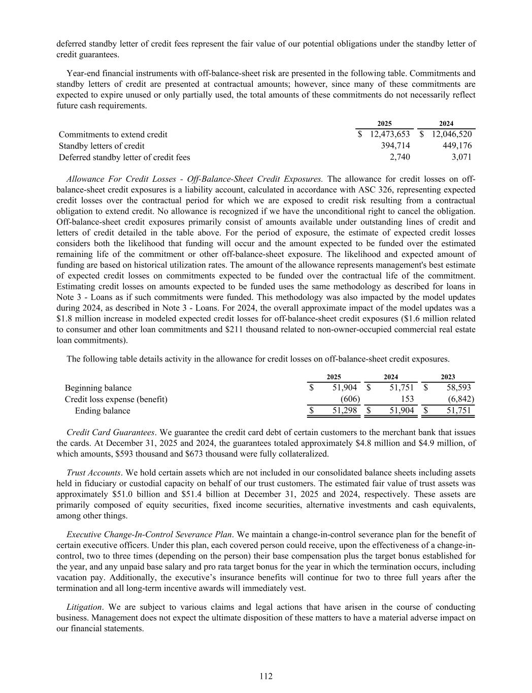 deferred standby letter of credit fees represent the fair value of our potential obligations under the standby letter of credit guarantees. Year-end financial instruments with off-balance-sheet risk are presented in the following table. Commitments and standby letters of credit are presented at contractual amounts; however, since many of these commitments are expected to expire unused or only partially used, the total amounts of these commitments do not necessarily reflect future cash requirements. 2025 2024 Commitments to extend credit $ 12,473,653 $ 12,046,520 Standby letters of credit 394,714 449,176 Deferred standby letter of credit fees 2,740 3,071 Allowance For Credit Losses - Off-Balance-Sheet Credit Exposures. The allowance for credit losses on off- balance-sheet credit exposures is a liability account, calculated in accordance with ASC 326, representing expected credit losses over the contractual period for which we are exposed to credit risk resulting from a contractual obligation to extend credit. No allowance is recognized if we have the unconditional right to cancel the obligation. Off-balance-sheet credit exposures primarily consist of amounts available under outstanding lines of credit and letters of credit detailed in the table above. For the period of exposure, the estimate of expected credit losses considers both the likelihood that funding will occur and the amount expected to be funded over the estimated remaining life of the commitment or other off-balance-sheet exposure. The likelihood and expected amount of funding are based on historical utilization rates. The amount of the allowance represents management's best estimate of expected credit losses on commitments expected to be funded over the contractual life of the commitment. Estimating credit losses on amounts expected to be funded uses the same methodology as described for loans in Note 3 - Loans as if such commitments were funded. This methodology was also impacted by the model updates during 2024, as described in Note 3 - Loans. For 2024, the overall approximate impact of the model updates was a $1.8 million increase in modeled expected credit losses for off-balance-sheet credit exposures ($1.6 million related to consumer and other loan commitments and $211 thousand related to non-owner-occupied commercial real estate loan commitments). The following table details activity in the allowance for credit losses on off-balance-sheet credit exposures. 2025 2024 2023 Beginning balance $ 51,904 $ 51,751 $ 58,593 Credit loss expense (benefit) (606) 153 (6,842) Ending balance $ 51,298 $ 51,904 $ 51,751 Credit Card Guarantees. We guarantee the credit card debt of certain customers to the merchant bank that issues the cards. At December 31, 2025 and 2024, the guarantees totaled approximately $4.8 million and $4.9 million, of which amounts, $593 thousand and $673 thousand were fully collateralized. Trust Accounts. We hold certain assets which are not included in our consolidated balance sheets including assets held in fiduciary or custodial capacity on behalf of our trust customers. The estimated fair value of trust assets was approximately $51.0 billion and $51.4 billion at December 31, 2025 and 2024, respectively. These assets are primarily composed of equity securities, fixed income securities, alternative investments and cash equivalents, among other things. Executive Change-In-Control Severance Plan. We maintain a change-in-control severance plan for the benefit of certain executive officers. Under this plan, each covered person could receive, upon the effectiveness of a change-in- control, two to three times (depending on the person) their base compensation plus the target bonus established for the year, and any unpaid base salary and pro rata target bonus for the year in which the termination occurs, including vacation pay. Additionally, the executive’s insurance benefits will continue for two to three full years after the termination and all long-term incentive awards will immediately vest. Litigation. We are subject to various claims and legal actions that have arisen in the course of conducting business. Management does not expect the ultimate disposition of these matters to have a material adverse impact on our financial statements. 112