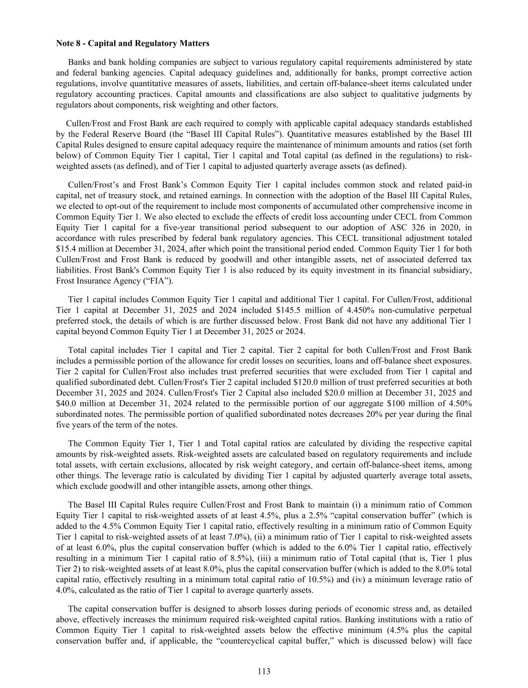 Note 8 - Capital and Regulatory Matters Banks and bank holding companies are subject to various regulatory capital requirements administered by state and federal banking agencies. Capital adequacy guidelines and, additionally for banks, prompt corrective action regulations, involve quantitative measures of assets, liabilities, and certain off-balance-sheet items calculated under regulatory accounting practices. Capital amounts and classifications are also subject to qualitative judgments by regulators about components, risk weighting and other factors. Cullen/Frost and Frost Bank are each required to comply with applicable capital adequacy standards established by the Federal Reserve Board (the “Basel III Capital Rules”). Quantitative measures established by the Basel III Capital Rules designed to ensure capital adequacy require the maintenance of minimum amounts and ratios (set forth below) of Common Equity Tier 1 capital, Tier 1 capital and Total capital (as defined in the regulations) to risk- weighted assets (as defined), and of Tier 1 capital to adjusted quarterly average assets (as defined). Cullen/Frost’s and Frost Bank’s Common Equity Tier 1 capital includes common stock and related paid-in capital, net of treasury stock, and retained earnings. In connection with the adoption of the Basel III Capital Rules, we elected to opt-out of the requirement to include most components of accumulated other comprehensive income in Common Equity Tier 1. We also elected to exclude the effects of credit loss accounting under CECL from Common Equity Tier 1 capital for a five-year transitional period subsequent to our adoption of ASC 326 in 2020, in accordance with rules prescribed by federal bank regulatory agencies. This CECL transitional adjustment totaled $15.4 million at December 31, 2024, after which point the transitional period ended. Common Equity Tier 1 for both Cullen/Frost and Frost Bank is reduced by goodwill and other intangible assets, net of associated deferred tax liabilities. Frost Bank's Common Equity Tier 1 is also reduced by its equity investment in its financial subsidiary, Frost Insurance Agency (“FIA”). Tier 1 capital includes Common Equity Tier 1 capital and additional Tier 1 capital. For Cullen/Frost, additional Tier 1 capital at December 31, 2025 and 2024 included $145.5 million of 4.450% non-cumulative perpetual preferred stock, the details of which is are further discussed below. Frost Bank did not have any additional Tier 1 capital beyond Common Equity Tier 1 at December 31, 2025 or 2024. Total capital includes Tier 1 capital and Tier 2 capital. Tier 2 capital for both Cullen/Frost and Frost Bank includes a permissible portion of the allowance for credit losses on securities, loans and off-balance sheet exposures. Tier 2 capital for Cullen/Frost also includes trust preferred securities that were excluded from Tier 1 capital and qualified subordinated debt. Cullen/Frost's Tier 2 capital included $120.0 million of trust preferred securities at both December 31, 2025 and 2024. Cullen/Frost's Tier 2 Capital also included $20.0 million at December 31, 2025 and $40.0 million at December 31, 2024 related to the permissible portion of our aggregate $100 million of 4.50% subordinated notes. The permissible portion of qualified subordinated notes decreases 20% per year during the final five years of the term of the notes. The Common Equity Tier 1, Tier 1 and Total capital ratios are calculated by dividing the respective capital amounts by risk-weighted assets. Risk-weighted assets are calculated based on regulatory requirements and include total assets, with certain exclusions, allocated by risk weight category, and certain off-balance-sheet items, among other things. The leverage ratio is calculated by dividing Tier 1 capital by adjusted quarterly average total assets, which exclude goodwill and other intangible assets, among other things. The Basel III Capital Rules require Cullen/Frost and Frost Bank to maintain (i) a minimum ratio of Common Equity Tier 1 capital to risk-weighted assets of at least 4.5%, plus a 2.5% “capital conservation buffer” (which is added to the 4.5% Common Equity Tier 1 capital ratio, effectively resulting in a minimum ratio of Common Equity Tier 1 capital to risk-weighted assets of at least 7.0%), (ii) a minimum ratio of Tier 1 capital to risk-weighted assets of at least 6.0%, plus the capital conservation buffer (which is added to the 6.0% Tier 1 capital ratio, effectively resulting in a minimum Tier 1 capital ratio of 8.5%), (iii) a minimum ratio of Total capital (that is, Tier 1 plus Tier 2) to risk-weighted assets of at least 8.0%, plus the capital conservation buffer (which is added to the 8.0% total capital ratio, effectively resulting in a minimum total capital ratio of 10.5%) and (iv) a minimum leverage ratio of 4.0%, calculated as the ratio of Tier 1 capital to average quarterly assets. The capital conservation buffer is designed to absorb losses during periods of economic stress and, as detailed above, effectively increases the minimum required risk-weighted capital ratios. Banking institutions with a ratio of Common Equity Tier 1 capital to risk-weighted assets below the effective minimum (4.5% plus the capital conservation buffer and, if applicable, the “countercyclical capital buffer,” which is discussed below) will face 113