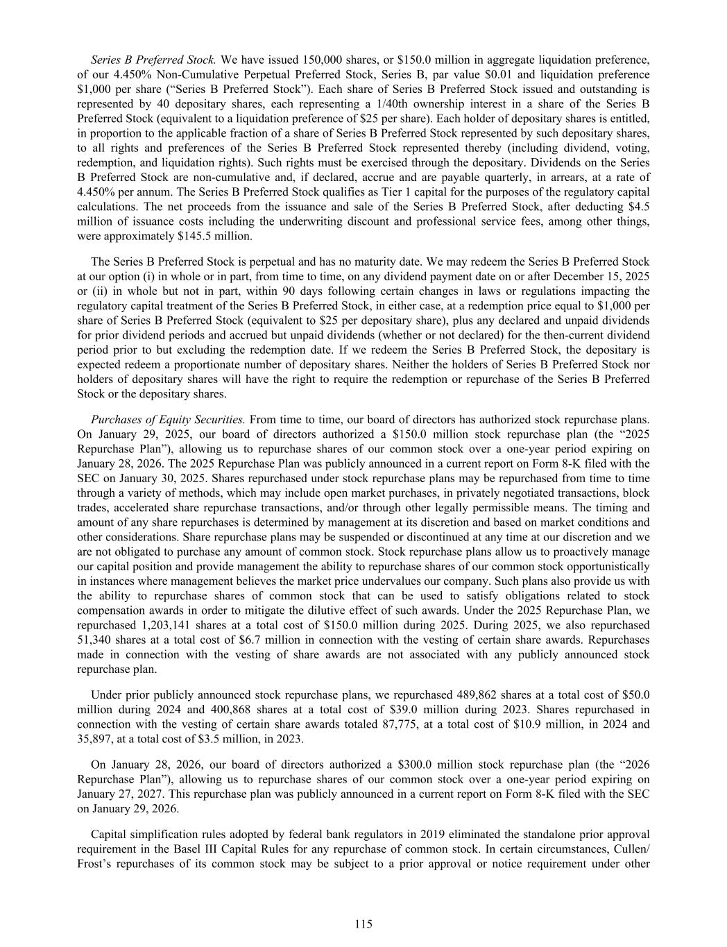 Series B Preferred Stock. We have issued 150,000 shares, or $150.0 million in aggregate liquidation preference, of our 4.450% Non-Cumulative Perpetual Preferred Stock, Series B, par value $0.01 and liquidation preference $1,000 per share (“Series B Preferred Stock”). Each share of Series B Preferred Stock issued and outstanding is represented by 40 depositary shares, each representing a 1/40th ownership interest in a share of the Series B Preferred Stock (equivalent to a liquidation preference of $25 per share). Each holder of depositary shares is entitled, in proportion to the applicable fraction of a share of Series B Preferred Stock represented by such depositary shares, to all rights and preferences of the Series B Preferred Stock represented thereby (including dividend, voting, redemption, and liquidation rights). Such rights must be exercised through the depositary. Dividends on the Series B Preferred Stock are non-cumulative and, if declared, accrue and are payable quarterly, in arrears, at a rate of 4.450% per annum. The Series B Preferred Stock qualifies as Tier 1 capital for the purposes of the regulatory capital calculations. The net proceeds from the issuance and sale of the Series B Preferred Stock, after deducting $4.5 million of issuance costs including the underwriting discount and professional service fees, among other things, were approximately $145.5 million. The Series B Preferred Stock is perpetual and has no maturity date. We may redeem the Series B Preferred Stock at our option (i) in whole or in part, from time to time, on any dividend payment date on or after December 15, 2025 or (ii) in whole but not in part, within 90 days following certain changes in laws or regulations impacting the regulatory capital treatment of the Series B Preferred Stock, in either case, at a redemption price equal to $1,000 per share of Series B Preferred Stock (equivalent to $25 per depositary share), plus any declared and unpaid dividends for prior dividend periods and accrued but unpaid dividends (whether or not declared) for the then-current dividend period prior to but excluding the redemption date. If we redeem the Series B Preferred Stock, the depositary is expected redeem a proportionate number of depositary shares. Neither the holders of Series B Preferred Stock nor holders of depositary shares will have the right to require the redemption or repurchase of the Series B Preferred Stock or the depositary shares. Purchases of Equity Securities. From time to time, our board of directors has authorized stock repurchase plans. On January 29, 2025, our board of directors authorized a $150.0 million stock repurchase plan (the “2025 Repurchase Plan”), allowing us to repurchase shares of our common stock over a one-year period expiring on January 28, 2026. The 2025 Repurchase Plan was publicly announced in a current report on Form 8-K filed with the SEC on January 30, 2025. Shares repurchased under stock repurchase plans may be repurchased from time to time through a variety of methods, which may include open market purchases, in privately negotiated transactions, block trades, accelerated share repurchase transactions, and/or through other legally permissible means. The timing and amount of any share repurchases is determined by management at its discretion and based on market conditions and other considerations. Share repurchase plans may be suspended or discontinued at any time at our discretion and we are not obligated to purchase any amount of common stock. Stock repurchase plans allow us to proactively manage our capital position and provide management the ability to repurchase shares of our common stock opportunistically in instances where management believes the market price undervalues our company. Such plans also provide us with the ability to repurchase shares of common stock that can be used to satisfy obligations related to stock compensation awards in order to mitigate the dilutive effect of such awards. Under the 2025 Repurchase Plan, we repurchased 1,203,141 shares at a total cost of $150.0 million during 2025. During 2025, we also repurchased 51,340 shares at a total cost of $6.7 million in connection with the vesting of certain share awards. Repurchases made in connection with the vesting of share awards are not associated with any publicly announced stock repurchase plan. Under prior publicly announced stock repurchase plans, we repurchased 489,862 shares at a total cost of $50.0 million during 2024 and 400,868 shares at a total cost of $39.0 million during 2023. Shares repurchased in connection with the vesting of certain share awards totaled 87,775, at a total cost of $10.9 million, in 2024 and 35,897, at a total cost of $3.5 million, in 2023. On January 28, 2026, our board of directors authorized a $300.0 million stock repurchase plan (the “2026 Repurchase Plan”), allowing us to repurchase shares of our common stock over a one-year period expiring on January 27, 2027. This repurchase plan was publicly announced in a current report on Form 8-K filed with the SEC on January 29, 2026. Capital simplification rules adopted by federal bank regulators in 2019 eliminated the standalone prior approval requirement in the Basel III Capital Rules for any repurchase of common stock. In certain circumstances, Cullen/ Frost’s repurchases of its common stock may be subject to a prior approval or notice requirement under other 115