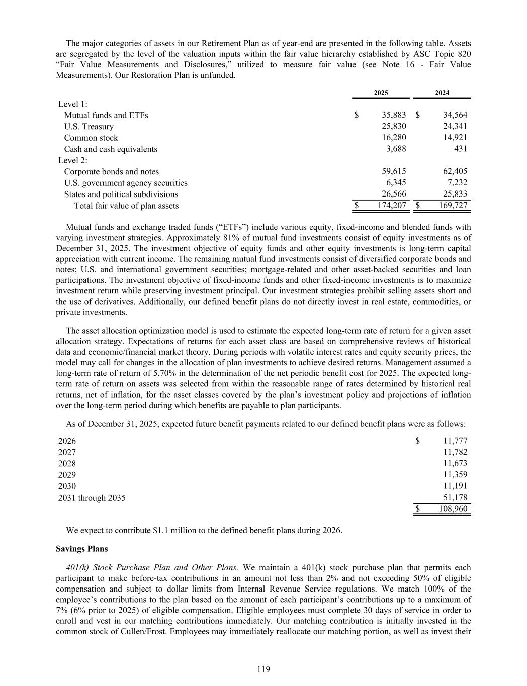 The major categories of assets in our Retirement Plan as of year-end are presented in the following table. Assets are segregated by the level of the valuation inputs within the fair value hierarchy established by ASC Topic 820 “Fair Value Measurements and Disclosures,” utilized to measure fair value (see Note 16 - Fair Value Measurements). Our Restoration Plan is unfunded. 2025 2024 Level 1: Mutual funds and ETFs $ 35,883 $ 34,564 U.S. Treasury 25,830 24,341 Common stock 16,280 14,921 Cash and cash equivalents 3,688 431 Level 2: Corporate bonds and notes 59,615 62,405 U.S. government agency securities 6,345 7,232 States and political subdivisions 26,566 25,833 Total fair value of plan assets $ 174,207 $ 169,727 Mutual funds and exchange traded funds (“ETFs”) include various equity, fixed-income and blended funds with varying investment strategies. Approximately 81% of mutual fund investments consist of equity investments as of December 31, 2025. The investment objective of equity funds and other equity investments is long-term capital appreciation with current income. The remaining mutual fund investments consist of diversified corporate bonds and notes; U.S. and international government securities; mortgage-related and other asset-backed securities and loan participations. The investment objective of fixed-income funds and other fixed-income investments is to maximize investment return while preserving investment principal. Our investment strategies prohibit selling assets short and the use of derivatives. Additionally, our defined benefit plans do not directly invest in real estate, commodities, or private investments. The asset allocation optimization model is used to estimate the expected long-term rate of return for a given asset allocation strategy. Expectations of returns for each asset class are based on comprehensive reviews of historical data and economic/financial market theory. During periods with volatile interest rates and equity security prices, the model may call for changes in the allocation of plan investments to achieve desired returns. Management assumed a long-term rate of return of 5.70% in the determination of the net periodic benefit cost for 2025. The expected long- term rate of return on assets was selected from within the reasonable range of rates determined by historical real returns, net of inflation, for the asset classes covered by the plan’s investment policy and projections of inflation over the long-term period during which benefits are payable to plan participants. As of December 31, 2025, expected future benefit payments related to our defined benefit plans were as follows: 2026 $ 11,777 2027 11,782 2028 11,673 2029 11,359 2030 11,191 2031 through 2035 51,178 $ 108,960 We expect to contribute $1.1 million to the defined benefit plans during 2026. Savings Plans 401(k) Stock Purchase Plan and Other Plans. We maintain a 401(k) stock purchase plan that permits each participant to make before-tax contributions in an amount not less than 2% and not exceeding 50% of eligible compensation and subject to dollar limits from Internal Revenue Service regulations. We match 100% of the employee’s contributions to the plan based on the amount of each participant’s contributions up to a maximum of 7% (6% prior to 2025) of eligible compensation. Eligible employees must complete 30 days of service in order to enroll and vest in our matching contributions immediately. Our matching contribution is initially invested in the common stock of Cullen/Frost. Employees may immediately reallocate our matching portion, as well as invest their 119