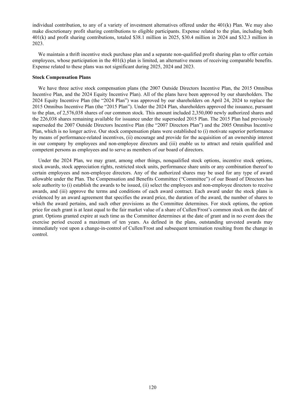 individual contribution, to any of a variety of investment alternatives offered under the 401(k) Plan. We may also make discretionary profit sharing contributions to eligible participants. Expense related to the plan, including both 401(k) and profit sharing contributions, totaled $38.1 million in 2025, $30.4 million in 2024 and $32.3 million in 2023. We maintain a thrift incentive stock purchase plan and a separate non-qualified profit sharing plan to offer certain employees, whose participation in the 401(k) plan is limited, an alternative means of receiving comparable benefits. Expense related to these plans was not significant during 2025, 2024 and 2023. Stock Compensation Plans We have three active stock compensation plans (the 2007 Outside Directors Incentive Plan, the 2015 Omnibus Incentive Plan, and the 2024 Equity Incentive Plan). All of the plans have been approved by our shareholders. The 2024 Equity Incentive Plan (the “2024 Plan”) was approved by our shareholders on April 24, 2024 to replace the 2015 Omnibus Incentive Plan (the “2015 Plan”). Under the 2024 Plan, shareholders approved the issuance, pursuant to the plan, of 2,576,038 shares of our common stock. This amount included 2,350,000 newly authorized shares and the 226,038 shares remaining available for issuance under the superseded 2015 Plan. The 2015 Plan had previously superseded the 2007 Outside Directors Incentive Plan (the “2007 Directors Plan”) and the 2005 Omnibus Incentive Plan, which is no longer active. Our stock compensation plans were established to (i) motivate superior performance by means of performance-related incentives, (ii) encourage and provide for the acquisition of an ownership interest in our company by employees and non-employee directors and (iii) enable us to attract and retain qualified and competent persons as employees and to serve as members of our board of directors. Under the 2024 Plan, we may grant, among other things, nonqualified stock options, incentive stock options, stock awards, stock appreciation rights, restricted stock units, performance share units or any combination thereof to certain employees and non-employee directors. Any of the authorized shares may be used for any type of award allowable under the Plan. The Compensation and Benefits Committee (“Committee”) of our Board of Directors has sole authority to (i) establish the awards to be issued, (ii) select the employees and non-employee directors to receive awards, and (iii) approve the terms and conditions of each award contract. Each award under the stock plans is evidenced by an award agreement that specifies the award price, the duration of the award, the number of shares to which the award pertains, and such other provisions as the Committee determines. For stock options, the option price for each grant is at least equal to the fair market value of a share of Cullen/Frost’s common stock on the date of grant. Options granted expire at such time as the Committee determines at the date of grant and in no event does the exercise period exceed a maximum of ten years. As defined in the plans, outstanding unvested awards may immediately vest upon a change-in-control of Cullen/Frost and subsequent termination resulting from the change in control. 120