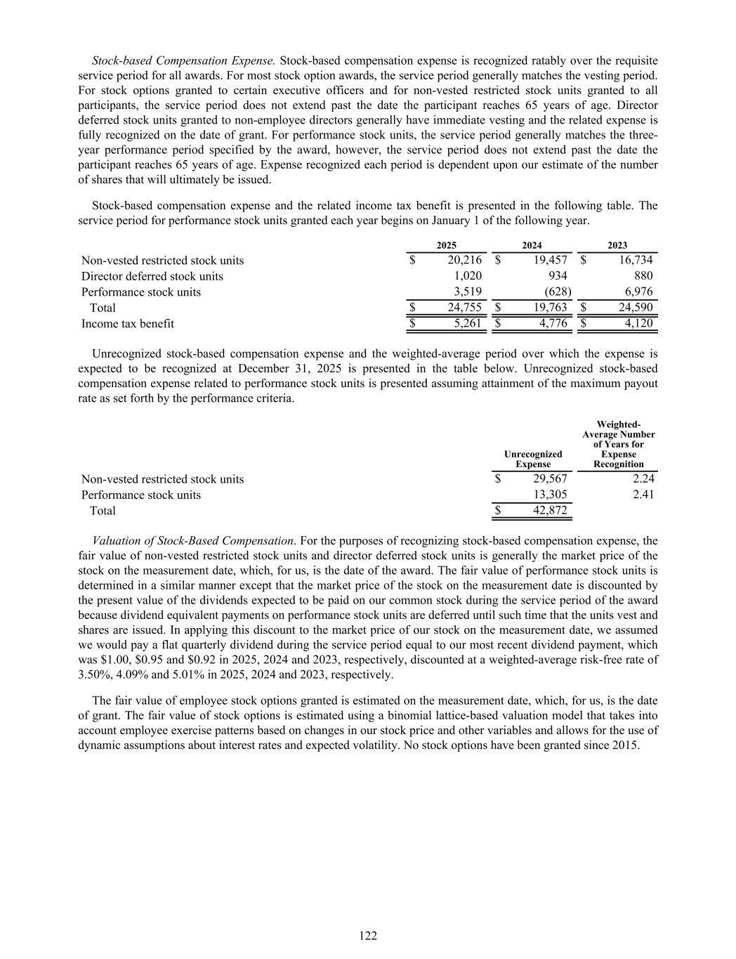 Stock-based Compensation Expense. Stock-based compensation expense is recognized ratably over the requisite service period for all awards. For most stock option awards, the service period generally matches the vesting period. For stock options granted to certain executive officers and for non-vested restricted stock units granted to all participants, the service period does not extend past the date the participant reaches 65 years of age. Director deferred stock units granted to non-employee directors generally have immediate vesting and the related expense is fully recognized on the date of grant. For performance stock units, the service period generally matches the three- year performance period specified by the award, however, the service period does not extend past the date the participant reaches 65 years of age. Expense recognized each period is dependent upon our estimate of the number of shares that will ultimately be issued. Stock-based compensation expense and the related income tax benefit is presented in the following table. The service period for performance stock units granted each year begins on January 1 of the following year. 2025 2024 2023 Non-vested restricted stock units $ 20,216 $ 19,457 $ 16,734 Director deferred stock units 1,020 934 880 Performance stock units 3,519 (628) 6,976 Total $ 24,755 $ 19,763 $ 24,590 Income tax benefit $ 5,261 $ 4,776 $ 4,120 Unrecognized stock-based compensation expense and the weighted-average period over which the expense is expected to be recognized at December 31, 2025 is presented in the table below. Unrecognized stock-based compensation expense related to performance stock units is presented assuming attainment of the maximum payout rate as set forth by the performance criteria. Unrecognized Expense Weighted- Average Number of Years for Expense Recognition Non-vested restricted stock units $ 29,567 2.24 Performance stock units 13,305 2.41 Total $ 42,872 Valuation of Stock-Based Compensation. For the purposes of recognizing stock-based compensation expense, the fair value of non-vested restricted stock units and director deferred stock units is generally the market price of the stock on the measurement date, which, for us, is the date of the award. The fair value of performance stock units is determined in a similar manner except that the market price of the stock on the measurement date is discounted by the present value of the dividends expected to be paid on our common stock during the service period of the award because dividend equivalent payments on performance stock units are deferred until such time that the units vest and shares are issued. In applying this discount to the market price of our stock on the measurement date, we assumed we would pay a flat quarterly dividend during the service period equal to our most recent dividend payment, which was $1.00, $0.95 and $0.92 in 2025, 2024 and 2023, respectively, discounted at a weighted-average risk-free rate of 3.50%, 4.09% and 5.01% in 2025, 2024 and 2023, respectively. The fair value of employee stock options granted is estimated on the measurement date, which, for us, is the date of grant. The fair value of stock options is estimated using a binomial lattice-based valuation model that takes into account employee exercise patterns based on changes in our stock price and other variables and allows for the use of dynamic assumptions about interest rates and expected volatility. No stock options have been granted since 2015. 122