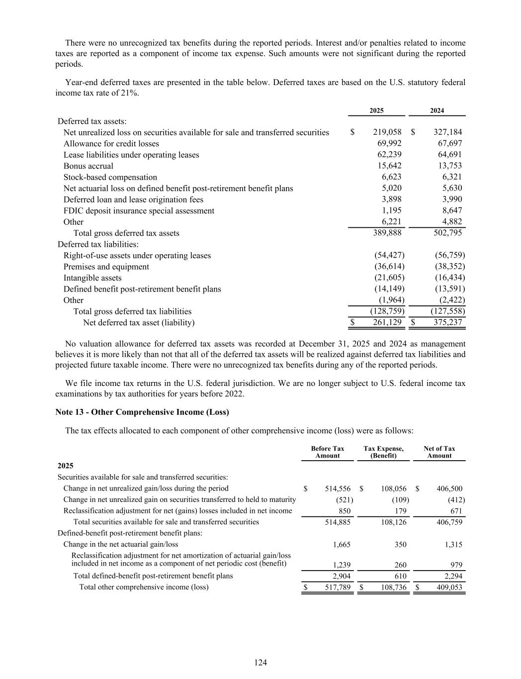 There were no unrecognized tax benefits during the reported periods. Interest and/or penalties related to income taxes are reported as a component of income tax expense. Such amounts were not significant during the reported periods. Year-end deferred taxes are presented in the table below. Deferred taxes are based on the U.S. statutory federal income tax rate of 21%. 2025 2024 Deferred tax assets: Net unrealized loss on securities available for sale and transferred securities $ 219,058 $ 327,184 Allowance for credit losses 69,992 67,697 Lease liabilities under operating leases 62,239 64,691 Bonus accrual 15,642 13,753 Stock-based compensation 6,623 6,321 Net actuarial loss on defined benefit post-retirement benefit plans 5,020 5,630 Deferred loan and lease origination fees 3,898 3,990 FDIC deposit insurance special assessment 1,195 8,647 Other 6,221 4,882 Total gross deferred tax assets 389,888 502,795 Deferred tax liabilities: Right-of-use assets under operating leases (54,427) (56,759) Premises and equipment (36,614) (38,352) Intangible assets (21,605) (16,434) Defined benefit post-retirement benefit plans (14,149) (13,591) Other (1,964) (2,422) Total gross deferred tax liabilities (128,759) (127,558) Net deferred tax asset (liability) $ 261,129 $ 375,237 No valuation allowance for deferred tax assets was recorded at December 31, 2025 and 2024 as management believes it is more likely than not that all of the deferred tax assets will be realized against deferred tax liabilities and projected future taxable income. There were no unrecognized tax benefits during any of the reported periods. We file income tax returns in the U.S. federal jurisdiction. We are no longer subject to U.S. federal income tax examinations by tax authorities for years before 2022. Note 13 - Other Comprehensive Income (Loss) The tax effects allocated to each component of other comprehensive income (loss) were as follows: 2025 Securities available for sale and transferred securities: Change in net unrealized gain/loss during the period $ 514,556 $ 108,056 $ 406,500 Change in net unrealized gain on securities transferred to held to maturity (521) (109) (412) Reclassification adjustment for net (gains) losses included in net income 850 179 671 Total securities available for sale and transferred securities 514,885 108,126 406,759 Defined-benefit post-retirement benefit plans: Change in the net actuarial gain/loss 1,665 350 1,315 Reclassification adjustment for net amortization of actuarial gain/loss included in net income as a component of net periodic cost (benefit) 1,239 260 979 Total defined-benefit post-retirement benefit plans 2,904 610 2,294 Total other comprehensive income (loss) $ 517,789 $ 108,736 $ 409,053 Before Tax Amount Tax Expense, (Benefit) Net of Tax Amount 124