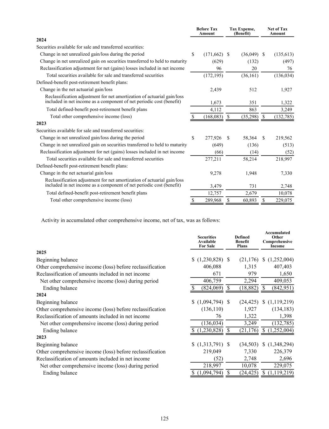 2024 Securities available for sale and transferred securities: Change in net unrealized gain/loss during the period $ (171,662) $ (36,049) $ (135,613) Change in net unrealized gain on securities transferred to held to maturity (629) (132) (497) Reclassification adjustment for net (gains) losses included in net income 96 20 76 Total securities available for sale and transferred securities (172,195) (36,161) (136,034) Defined-benefit post-retirement benefit plans: Change in the net actuarial gain/loss 2,439 512 1,927 Reclassification adjustment for net amortization of actuarial gain/loss included in net income as a component of net periodic cost (benefit) 1,673 351 1,322 Total defined-benefit post-retirement benefit plans 4,112 863 3,249 Total other comprehensive income (loss) $ (168,083) $ (35,298) $ (132,785) 2023 Securities available for sale and transferred securities: Change in net unrealized gain/loss during the period $ 277,926 $ 58,364 $ 219,562 Change in net unrealized gain on securities transferred to held to maturity (649) (136) (513) Reclassification adjustment for net (gains) losses included in net income (66) (14) (52) Total securities available for sale and transferred securities 277,211 58,214 218,997 Defined-benefit post-retirement benefit plans: Change in the net actuarial gain/loss 9,278 1,948 7,330 Reclassification adjustment for net amortization of actuarial gain/loss included in net income as a component of net periodic cost (benefit) 3,479 731 2,748 Total defined-benefit post-retirement benefit plans 12,757 2,679 10,078 Total other comprehensive income (loss) $ 289,968 $ 60,893 $ 229,075 Before Tax Amount Tax Expense, (Benefit) Net of Tax Amount Activity in accumulated other comprehensive income, net of tax, was as follows: Securities Available For Sale Defined Benefit Plans Accumulated Other Comprehensive Income 2025 Beginning balance $ (1,230,828) $ (21,176) $ (1,252,004) Other comprehensive income (loss) before reclassification 406,088 1,315 407,403 Reclassification of amounts included in net income 671 979 1,650 Net other comprehensive income (loss) during period 406,759 2,294 409,053 Ending balance $ (824,069) $ (18,882) $ (842,951) 2024 Beginning balance $ (1,094,794) $ (24,425) $ (1,119,219) Other comprehensive income (loss) before reclassification (136,110) 1,927 (134,183) Reclassification of amounts included in net income 76 1,322 1,398 Net other comprehensive income (loss) during period (136,034) 3,249 (132,785) Ending balance $ (1,230,828) $ (21,176) $ (1,252,004) 2023 Beginning balance $ (1,313,791) $ (34,503) $ (1,348,294) Other comprehensive income (loss) before reclassification 219,049 7,330 226,379 Reclassification of amounts included in net income (52) 2,748 2,696 Net other comprehensive income (loss) during period 218,997 10,078 229,075 Ending balance $ (1,094,794) $ (24,425) $ (1,119,219) 125