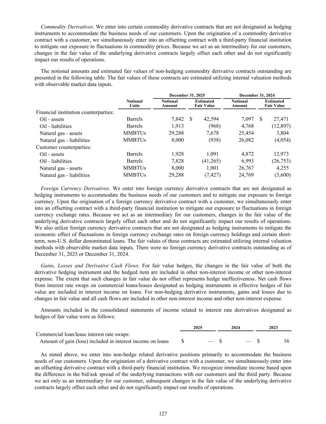 Commodity Derivatives. We enter into certain commodity derivative contracts that are not designated as hedging instruments to accommodate the business needs of our customers. Upon the origination of a commodity derivative contract with a customer, we simultaneously enter into an offsetting contract with a third-party financial institution to mitigate our exposure to fluctuations in commodity prices. Because we act as an intermediary for our customers, changes in the fair value of the underlying derivative contracts largely offset each other and do not significantly impact our results of operations. The notional amounts and estimated fair values of non-hedging commodity derivative contracts outstanding are presented in the following table. The fair values of these contracts are estimated utilizing internal valuation methods with observable market data inputs. December 31, 2025 December 31, 2024 Notional Units Notional Amount Estimated Fair Value Notional Amount Estimated Fair Value Financial institution counterparties: Oil - assets Barrels 7,842 $ 42,594 7,097 $ 27,471 Oil - liabilities Barrels 1,913 (968) 4,768 (12,897) Natural gas - assets MMBTUs 29,288 7,678 25,454 3,804 Natural gas - liabilities MMBTUs 8,000 (938) 26,082 (4,054) Customer counterparties: Oil - assets Barrels 1,928 1,091 4,872 12,973 Oil - liabilities Barrels 7,828 (41,265) 6,993 (26,753) Natural gas - assets MMBTUs 8,000 1,001 26,767 4,255 Natural gas - liabilities MMBTUs 29,288 (7,427) 24,769 (3,600) Foreign Currency Derivatives. We enter into foreign currency derivative contracts that are not designated as hedging instruments to accommodate the business needs of our customers and to mitigate our exposure to foreign currency. Upon the origination of a foreign currency derivative contract with a customer, we simultaneously enter into an offsetting contract with a third-party financial institution to mitigate our exposure to fluctuations in foreign currency exchange rates. Because we act as an intermediary for our customers, changes in the fair value of the underlying derivative contracts largely offset each other and do not significantly impact our results of operations. We also utilize foreign currency derivative contracts that are not designated as hedging instruments to mitigate the economic effect of fluctuations in foreign currency exchange rates on foreign currency holdings and certain short- term, non-U.S. dollar denominated loans. The fair values of these contracts are estimated utilizing internal valuation methods with observable market data inputs. There were no foreign currency derivative contracts outstanding as of December 31, 2025 or December 31, 2024. Gains, Losses and Derivative Cash Flows. For fair value hedges, the changes in the fair value of both the derivative hedging instrument and the hedged item are included in other non-interest income or other non-interest expense. The extent that such changes in fair value do not offset represents hedge ineffectiveness. Net cash flows from interest rate swaps on commercial loans/leases designated as hedging instruments in effective hedges of fair value are included in interest income on loans. For non-hedging derivative instruments, gains and losses due to changes in fair value and all cash flows are included in other non-interest income and other non-interest expense. Amounts included in the consolidated statements of income related to interest rate derivatives designated as hedges of fair value were as follows: 2025 2024 2023 Commercial loan/lease interest rate swaps: Amount of gain (loss) included in interest income on loans $ — $ — $ 16 As stated above, we enter into non-hedge related derivative positions primarily to accommodate the business needs of our customers. Upon the origination of a derivative contract with a customer, we simultaneously enter into an offsetting derivative contract with a third-party financial institution. We recognize immediate income based upon the difference in the bid/ask spread of the underlying transactions with our customers and the third party. Because we act only as an intermediary for our customer, subsequent changes in the fair value of the underlying derivative contracts largely offset each other and do not significantly impact our results of operations. 127
