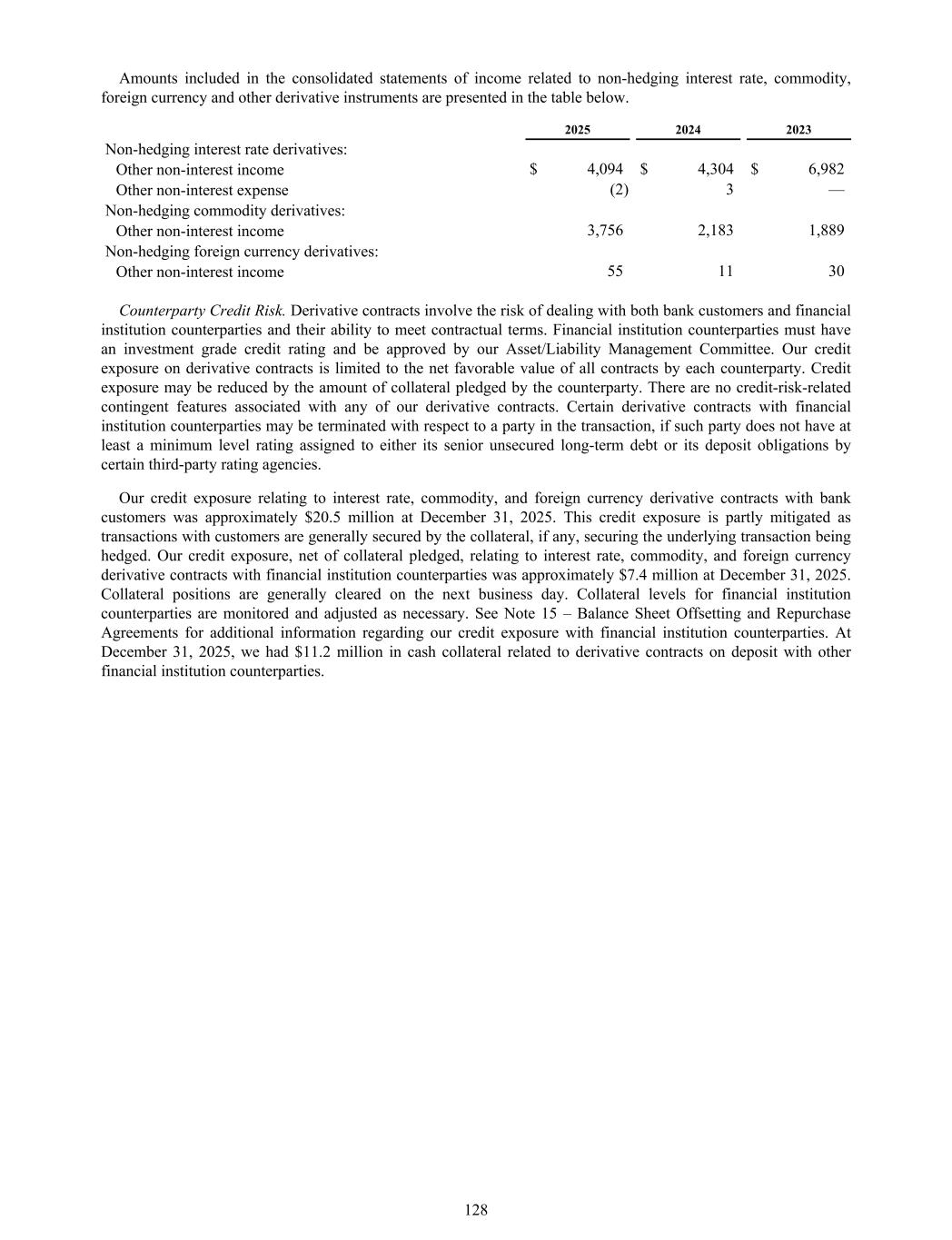 Amounts included in the consolidated statements of income related to non-hedging interest rate, commodity, foreign currency and other derivative instruments are presented in the table below. 2025 2024 2023 Non-hedging interest rate derivatives: Other non-interest income $ 4,094 $ 4,304 $ 6,982 Other non-interest expense (2) 3 — Non-hedging commodity derivatives: Other non-interest income 3,756 2,183 1,889 Non-hedging foreign currency derivatives: Other non-interest income 55 11 30 Counterparty Credit Risk. Derivative contracts involve the risk of dealing with both bank customers and financial institution counterparties and their ability to meet contractual terms. Financial institution counterparties must have an investment grade credit rating and be approved by our Asset/Liability Management Committee. Our credit exposure on derivative contracts is limited to the net favorable value of all contracts by each counterparty. Credit exposure may be reduced by the amount of collateral pledged by the counterparty. There are no credit-risk-related contingent features associated with any of our derivative contracts. Certain derivative contracts with financial institution counterparties may be terminated with respect to a party in the transaction, if such party does not have at least a minimum level rating assigned to either its senior unsecured long-term debt or its deposit obligations by certain third-party rating agencies. Our credit exposure relating to interest rate, commodity, and foreign currency derivative contracts with bank customers was approximately $20.5 million at December 31, 2025. This credit exposure is partly mitigated as transactions with customers are generally secured by the collateral, if any, securing the underlying transaction being hedged. Our credit exposure, net of collateral pledged, relating to interest rate, commodity, and foreign currency derivative contracts with financial institution counterparties was approximately $7.4 million at December 31, 2025. Collateral positions are generally cleared on the next business day. Collateral levels for financial institution counterparties are monitored and adjusted as necessary. See Note 15 – Balance Sheet Offsetting and Repurchase Agreements for additional information regarding our credit exposure with financial institution counterparties. At December 31, 2025, we had $11.2 million in cash collateral related to derivative contracts on deposit with other financial institution counterparties. 128