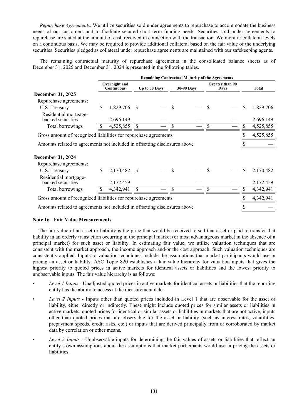 Repurchase Agreements. We utilize securities sold under agreements to repurchase to accommodate the business needs of our customers and to facilitate secured short-term funding needs. Securities sold under agreements to repurchase are stated at the amount of cash received in connection with the transaction. We monitor collateral levels on a continuous basis. We may be required to provide additional collateral based on the fair value of the underlying securities. Securities pledged as collateral under repurchase agreements are maintained with our safekeeping agents. The remaining contractual maturity of repurchase agreements in the consolidated balance sheets as of December 31, 2025 and December 31, 2024 is presented in the following tables. Remaining Contractual Maturity of the Agreements Overnight and Continuous Up to 30 Days 30-90 Days Greater than 90 Days Total December 31, 2025 Repurchase agreements: U.S. Treasury $ 1,829,706 $ — $ — $ — $ 1,829,706 Residential mortgage- backed securities 2,696,149 — — — 2,696,149 Total borrowings $ 4,525,855 $ — $ — $ — $ 4,525,855 Gross amount of recognized liabilities for repurchase agreements $ 4,525,855 Amounts related to agreements not included in offsetting disclosures above $ — December 31, 2024 Repurchase agreements: U.S. Treasury $ 2,170,482 $ — $ — $ — $ 2,170,482 Residential mortgage- backed securities 2,172,459 — — — 2,172,459 Total borrowings $ 4,342,941 $ — $ — $ — $ 4,342,941 Gross amount of recognized liabilities for repurchase agreements $ 4,342,941 Amounts related to agreements not included in offsetting disclosures above $ — Note 16 - Fair Value Measurements The fair value of an asset or liability is the price that would be received to sell that asset or paid to transfer that liability in an orderly transaction occurring in the principal market (or most advantageous market in the absence of a principal market) for such asset or liability. In estimating fair value, we utilize valuation techniques that are consistent with the market approach, the income approach and/or the cost approach. Such valuation techniques are consistently applied. Inputs to valuation techniques include the assumptions that market participants would use in pricing an asset or liability. ASC Topic 820 establishes a fair value hierarchy for valuation inputs that gives the highest priority to quoted prices in active markets for identical assets or liabilities and the lowest priority to unobservable inputs. The fair value hierarchy is as follows: • Level 1 Inputs - Unadjusted quoted prices in active markets for identical assets or liabilities that the reporting entity has the ability to access at the measurement date. • Level 2 Inputs - Inputs other than quoted prices included in Level 1 that are observable for the asset or liability, either directly or indirectly. These might include quoted prices for similar assets or liabilities in active markets, quoted prices for identical or similar assets or liabilities in markets that are not active, inputs other than quoted prices that are observable for the asset or liability (such as interest rates, volatilities, prepayment speeds, credit risks, etc.) or inputs that are derived principally from or corroborated by market data by correlation or other means. • Level 3 Inputs - Unobservable inputs for determining the fair values of assets or liabilities that reflect an entity’s own assumptions about the assumptions that market participants would use in pricing the assets or liabilities. 131
