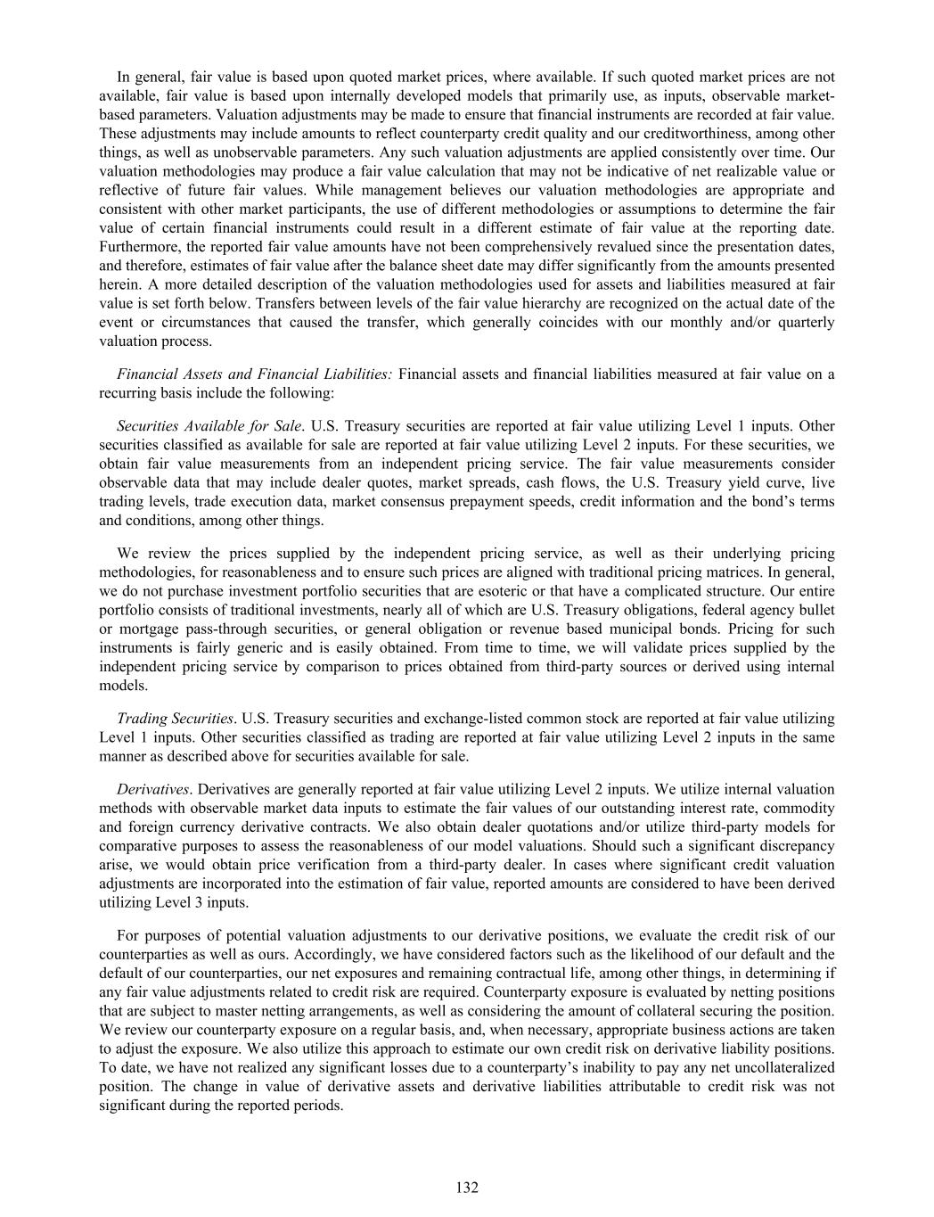 In general, fair value is based upon quoted market prices, where available. If such quoted market prices are not available, fair value is based upon internally developed models that primarily use, as inputs, observable market- based parameters. Valuation adjustments may be made to ensure that financial instruments are recorded at fair value. These adjustments may include amounts to reflect counterparty credit quality and our creditworthiness, among other things, as well as unobservable parameters. Any such valuation adjustments are applied consistently over time. Our valuation methodologies may produce a fair value calculation that may not be indicative of net realizable value or reflective of future fair values. While management believes our valuation methodologies are appropriate and consistent with other market participants, the use of different methodologies or assumptions to determine the fair value of certain financial instruments could result in a different estimate of fair value at the reporting date. Furthermore, the reported fair value amounts have not been comprehensively revalued since the presentation dates, and therefore, estimates of fair value after the balance sheet date may differ significantly from the amounts presented herein. A more detailed description of the valuation methodologies used for assets and liabilities measured at fair value is set forth below. Transfers between levels of the fair value hierarchy are recognized on the actual date of the event or circumstances that caused the transfer, which generally coincides with our monthly and/or quarterly valuation process. Financial Assets and Financial Liabilities: Financial assets and financial liabilities measured at fair value on a recurring basis include the following: Securities Available for Sale. U.S. Treasury securities are reported at fair value utilizing Level 1 inputs. Other securities classified as available for sale are reported at fair value utilizing Level 2 inputs. For these securities, we obtain fair value measurements from an independent pricing service. The fair value measurements consider observable data that may include dealer quotes, market spreads, cash flows, the U.S. Treasury yield curve, live trading levels, trade execution data, market consensus prepayment speeds, credit information and the bond’s terms and conditions, among other things. We review the prices supplied by the independent pricing service, as well as their underlying pricing methodologies, for reasonableness and to ensure such prices are aligned with traditional pricing matrices. In general, we do not purchase investment portfolio securities that are esoteric or that have a complicated structure. Our entire portfolio consists of traditional investments, nearly all of which are U.S. Treasury obligations, federal agency bullet or mortgage pass-through securities, or general obligation or revenue based municipal bonds. Pricing for such instruments is fairly generic and is easily obtained. From time to time, we will validate prices supplied by the independent pricing service by comparison to prices obtained from third-party sources or derived using internal models. Trading Securities. U.S. Treasury securities and exchange-listed common stock are reported at fair value utilizing Level 1 inputs. Other securities classified as trading are reported at fair value utilizing Level 2 inputs in the same manner as described above for securities available for sale. Derivatives. Derivatives are generally reported at fair value utilizing Level 2 inputs. We utilize internal valuation methods with observable market data inputs to estimate the fair values of our outstanding interest rate, commodity and foreign currency derivative contracts. We also obtain dealer quotations and/or utilize third-party models for comparative purposes to assess the reasonableness of our model valuations. Should such a significant discrepancy arise, we would obtain price verification from a third-party dealer. In cases where significant credit valuation adjustments are incorporated into the estimation of fair value, reported amounts are considered to have been derived utilizing Level 3 inputs. For purposes of potential valuation adjustments to our derivative positions, we evaluate the credit risk of our counterparties as well as ours. Accordingly, we have considered factors such as the likelihood of our default and the default of our counterparties, our net exposures and remaining contractual life, among other things, in determining if any fair value adjustments related to credit risk are required. Counterparty exposure is evaluated by netting positions that are subject to master netting arrangements, as well as considering the amount of collateral securing the position. We review our counterparty exposure on a regular basis, and, when necessary, appropriate business actions are taken to adjust the exposure. We also utilize this approach to estimate our own credit risk on derivative liability positions. To date, we have not realized any significant losses due to a counterparty’s inability to pay any net uncollateralized position. The change in value of derivative assets and derivative liabilities attributable to credit risk was not significant during the reported periods. 132