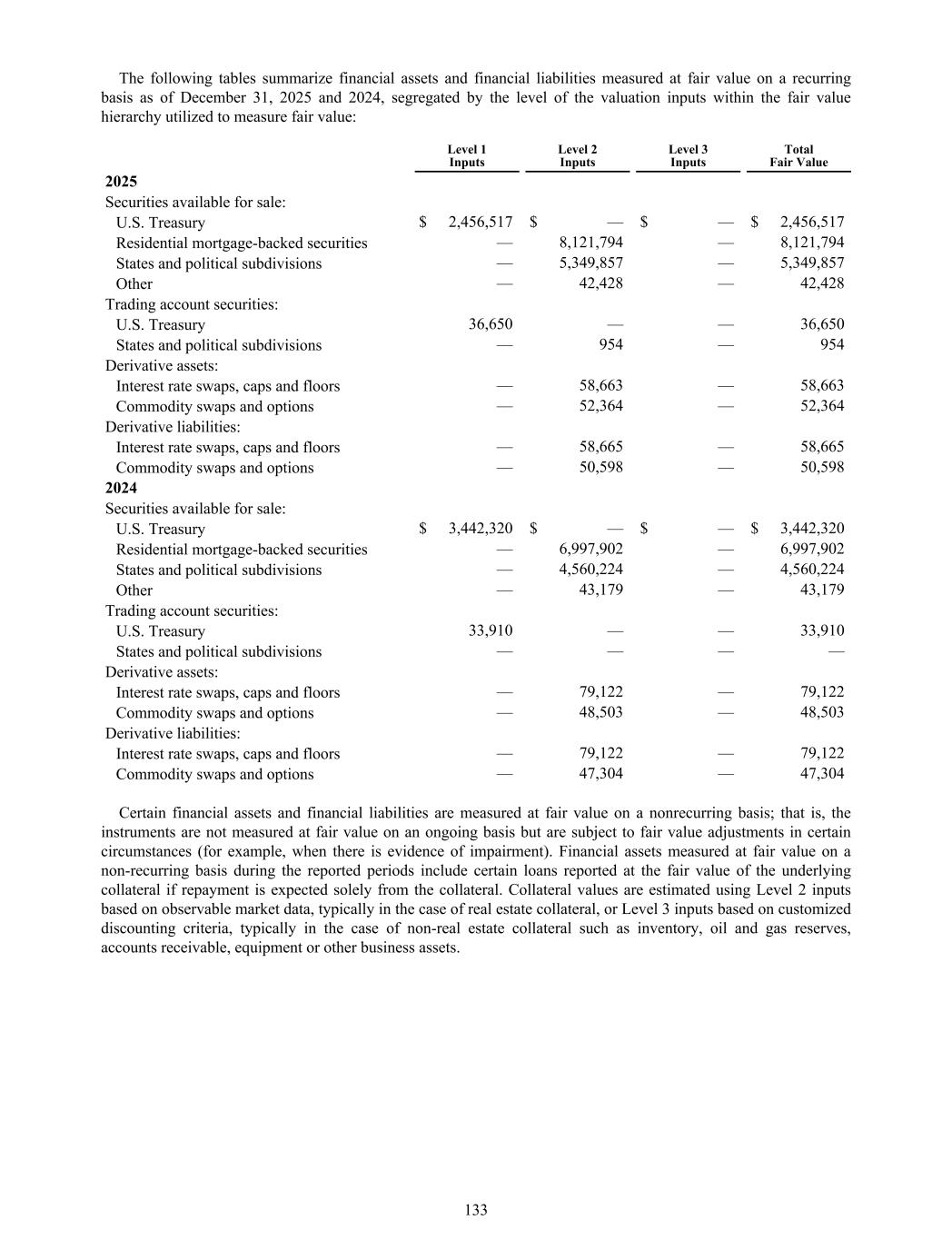 The following tables summarize financial assets and financial liabilities measured at fair value on a recurring basis as of December 31, 2025 and 2024, segregated by the level of the valuation inputs within the fair value hierarchy utilized to measure fair value: 2025 Securities available for sale: U.S. Treasury $ 2,456,517 $ — $ — $ 2,456,517 Residential mortgage-backed securities — 8,121,794 — 8,121,794 States and political subdivisions — 5,349,857 — 5,349,857 Other — 42,428 — 42,428 Trading account securities: U.S. Treasury 36,650 — — 36,650 States and political subdivisions — 954 — 954 Derivative assets: Interest rate swaps, caps and floors — 58,663 — 58,663 Commodity swaps and options — 52,364 — 52,364 Derivative liabilities: Interest rate swaps, caps and floors — 58,665 — 58,665 Commodity swaps and options — 50,598 — 50,598 2024 Securities available for sale: U.S. Treasury $ 3,442,320 $ — $ — $ 3,442,320 Residential mortgage-backed securities — 6,997,902 — 6,997,902 States and political subdivisions — 4,560,224 — 4,560,224 Other — 43,179 — 43,179 Trading account securities: U.S. Treasury 33,910 — — 33,910 States and political subdivisions — — — — Derivative assets: Interest rate swaps, caps and floors — 79,122 — 79,122 Commodity swaps and options — 48,503 — 48,503 Derivative liabilities: Interest rate swaps, caps and floors — 79,122 — 79,122 Commodity swaps and options — 47,304 — 47,304 Level 1 Inputs Level 2 Inputs Level 3 Inputs Total Fair Value Certain financial assets and financial liabilities are measured at fair value on a nonrecurring basis; that is, the instruments are not measured at fair value on an ongoing basis but are subject to fair value adjustments in certain circumstances (for example, when there is evidence of impairment). Financial assets measured at fair value on a non-recurring basis during the reported periods include certain loans reported at the fair value of the underlying collateral if repayment is expected solely from the collateral. Collateral values are estimated using Level 2 inputs based on observable market data, typically in the case of real estate collateral, or Level 3 inputs based on customized discounting criteria, typically in the case of non-real estate collateral such as inventory, oil and gas reserves, accounts receivable, equipment or other business assets. 133