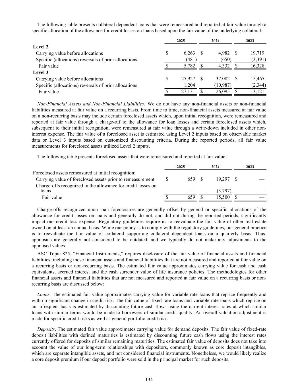 The following table presents collateral dependent loans that were remeasured and reported at fair value through a specific allocation of the allowance for credit losses on loans based upon the fair value of the underlying collateral: 2025 2024 2023 Level 2 Carrying value before allocations $ 6,263 $ 4,982 $ 19,719 Specific (allocations) reversals of prior allocations (481) (650) (3,391) Fair value $ 5,782 $ 4,332 $ 16,328 Level 3 Carrying value before allocations $ 25,927 $ 37,082 $ 15,465 Specific (allocations) reversals of prior allocations 1,204 (10,987) (2,344) Fair value $ 27,131 $ 26,095 $ 13,121 Non-Financial Assets and Non-Financial Liabilities: We do not have any non-financial assets or non-financial liabilities measured at fair value on a recurring basis. From time to time, non-financial assets measured at fair value on a non-recurring basis may include certain foreclosed assets which, upon initial recognition, were remeasured and reported at fair value through a charge-off to the allowance for loan losses and certain foreclosed assets which, subsequent to their initial recognition, were remeasured at fair value through a write-down included in other non- interest expense. The fair value of a foreclosed asset is estimated using Level 2 inputs based on observable market data or Level 3 inputs based on customized discounting criteria. During the reported periods, all fair value measurements for foreclosed assets utilized Level 2 inputs. The following table presents foreclosed assets that were remeasured and reported at fair value: 2025 2024 2023 Foreclosed assets remeasured at initial recognition: Carrying value of foreclosed assets prior to remeasurement $ 659 $ 19,297 $ — Charge-offs recognized in the allowance for credit losses on loans — (3,797) — Fair value $ 659 $ 15,500 $ — Charge-offs recognized upon loan foreclosures are generally offset by general or specific allocations of the allowance for credit losses on loans and generally do not, and did not during the reported periods, significantly impact our credit loss expense. Regulatory guidelines require us to reevaluate the fair value of other real estate owned on at least an annual basis. While our policy is to comply with the regulatory guidelines, our general practice is to reevaluate the fair value of collateral supporting collateral dependent loans on a quarterly basis. Thus, appraisals are generally not considered to be outdated, and we typically do not make any adjustments to the appraised values. ASC Topic 825, “Financial Instruments,” requires disclosure of the fair value of financial assets and financial liabilities, including those financial assets and financial liabilities that are not measured and reported at fair value on a recurring basis or non-recurring basis. The estimated fair value approximates carrying value for cash and cash equivalents, accrued interest and the cash surrender value of life insurance policies. The methodologies for other financial assets and financial liabilities that are not measured and reported at fair value on a recurring basis or non- recurring basis are discussed below: Loans. The estimated fair value approximates carrying value for variable-rate loans that reprice frequently and with no significant change in credit risk. The fair value of fixed-rate loans and variable-rate loans which reprice on an infrequent basis is estimated by discounting future cash flows using the current interest rates at which similar loans with similar terms would be made to borrowers of similar credit quality. An overall valuation adjustment is made for specific credit risks as well as general portfolio credit risk. Deposits. The estimated fair value approximates carrying value for demand deposits. The fair value of fixed-rate deposit liabilities with defined maturities is estimated by discounting future cash flows using the interest rates currently offered for deposits of similar remaining maturities. The estimated fair value of deposits does not take into account the value of our long-term relationships with depositors, commonly known as core deposit intangibles, which are separate intangible assets, and not considered financial instruments. Nonetheless, we would likely realize a core deposit premium if our deposit portfolio were sold in the principal market for such deposits. 134