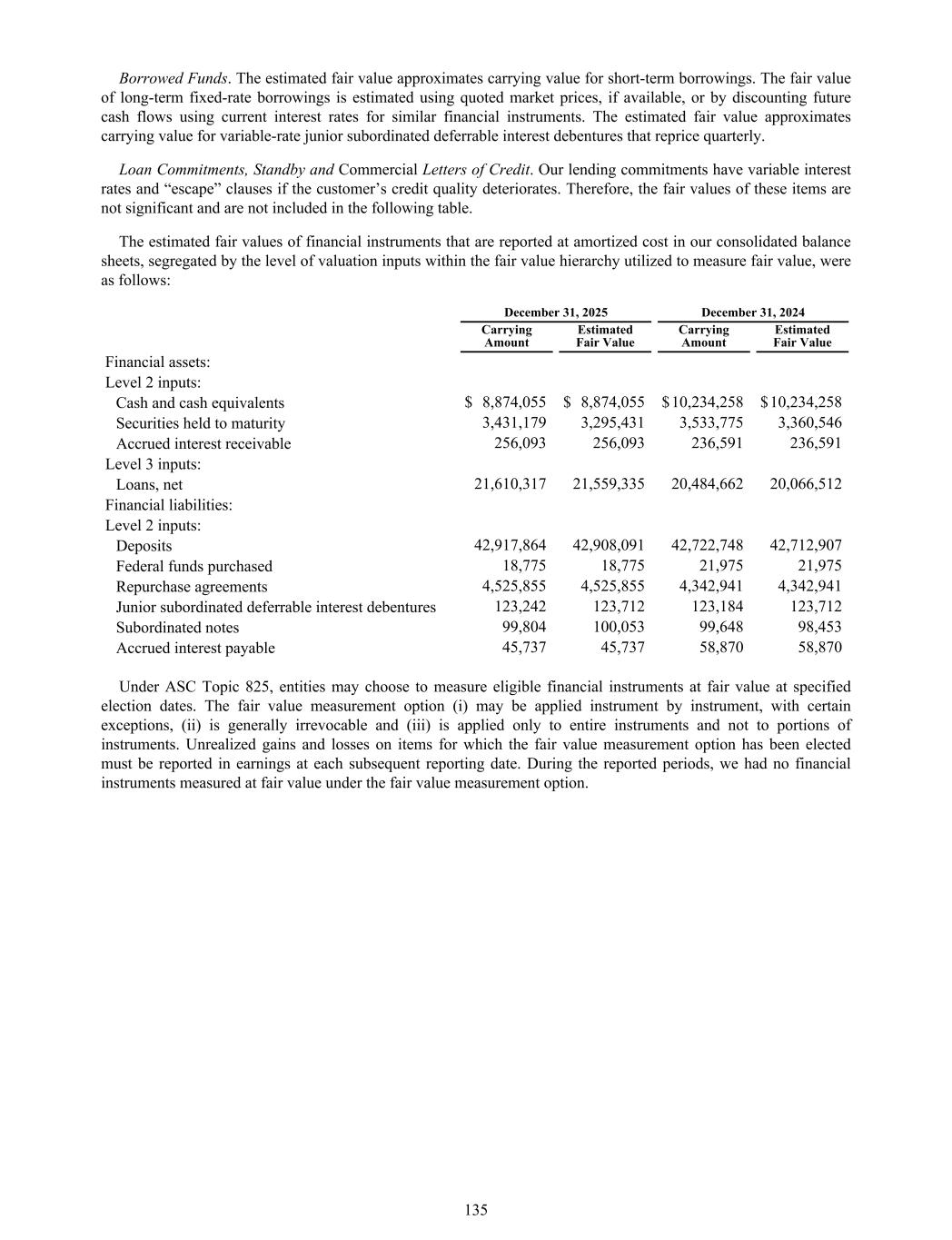 Borrowed Funds. The estimated fair value approximates carrying value for short-term borrowings. The fair value of long-term fixed-rate borrowings is estimated using quoted market prices, if available, or by discounting future cash flows using current interest rates for similar financial instruments. The estimated fair value approximates carrying value for variable-rate junior subordinated deferrable interest debentures that reprice quarterly. Loan Commitments, Standby and Commercial Letters of Credit. Our lending commitments have variable interest rates and “escape” clauses if the customer’s credit quality deteriorates. Therefore, the fair values of these items are not significant and are not included in the following table. The estimated fair values of financial instruments that are reported at amortized cost in our consolidated balance sheets, segregated by the level of valuation inputs within the fair value hierarchy utilized to measure fair value, were as follows: December 31, 2025 December 31, 2024 Carrying Amount Estimated Fair Value Carrying Amount Estimated Fair Value Financial assets: Level 2 inputs: Cash and cash equivalents $ 8,874,055 $ 8,874,055 $10,234,258 $10,234,258 Securities held to maturity 3,431,179 3,295,431 3,533,775 3,360,546 Accrued interest receivable 256,093 256,093 236,591 236,591 Level 3 inputs: Loans, net 21,610,317 21,559,335 20,484,662 20,066,512 Financial liabilities: Level 2 inputs: Deposits 42,917,864 42,908,091 42,722,748 42,712,907 Federal funds purchased 18,775 18,775 21,975 21,975 Repurchase agreements 4,525,855 4,525,855 4,342,941 4,342,941 Junior subordinated deferrable interest debentures 123,242 123,712 123,184 123,712 Subordinated notes 99,804 100,053 99,648 98,453 Accrued interest payable 45,737 45,737 58,870 58,870 Under ASC Topic 825, entities may choose to measure eligible financial instruments at fair value at specified election dates. The fair value measurement option (i) may be applied instrument by instrument, with certain exceptions, (ii) is generally irrevocable and (iii) is applied only to entire instruments and not to portions of instruments. Unrealized gains and losses on items for which the fair value measurement option has been elected must be reported in earnings at each subsequent reporting date. During the reported periods, we had no financial instruments measured at fair value under the fair value measurement option. 135