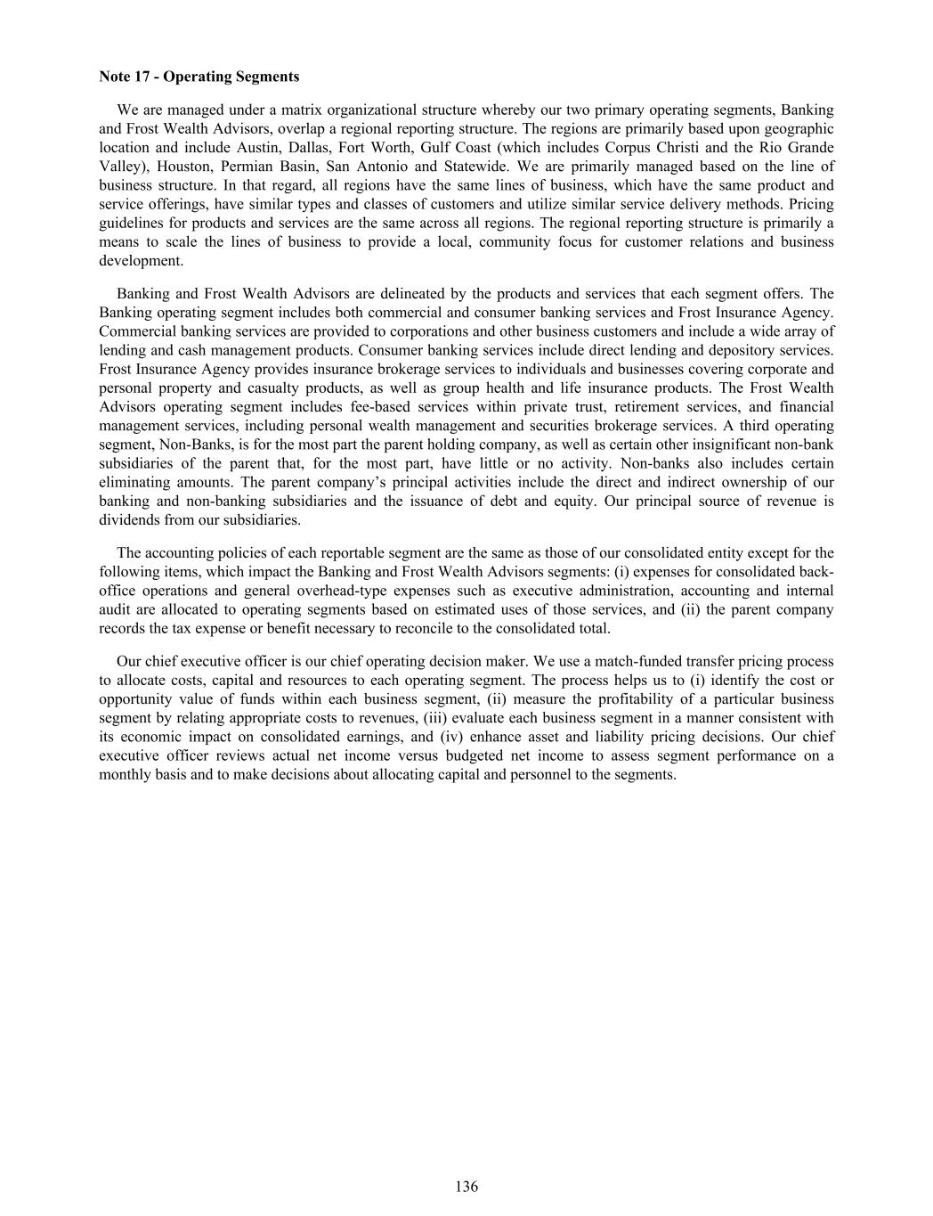 Note 17 - Operating Segments We are managed under a matrix organizational structure whereby our two primary operating segments, Banking and Frost Wealth Advisors, overlap a regional reporting structure. The regions are primarily based upon geographic location and include Austin, Dallas, Fort Worth, Gulf Coast (which includes Corpus Christi and the Rio Grande Valley), Houston, Permian Basin, San Antonio and Statewide. We are primarily managed based on the line of business structure. In that regard, all regions have the same lines of business, which have the same product and service offerings, have similar types and classes of customers and utilize similar service delivery methods. Pricing guidelines for products and services are the same across all regions. The regional reporting structure is primarily a means to scale the lines of business to provide a local, community focus for customer relations and business development. Banking and Frost Wealth Advisors are delineated by the products and services that each segment offers. The Banking operating segment includes both commercial and consumer banking services and Frost Insurance Agency. Commercial banking services are provided to corporations and other business customers and include a wide array of lending and cash management products. Consumer banking services include direct lending and depository services. Frost Insurance Agency provides insurance brokerage services to individuals and businesses covering corporate and personal property and casualty products, as well as group health and life insurance products. The Frost Wealth Advisors operating segment includes fee-based services within private trust, retirement services, and financial management services, including personal wealth management and securities brokerage services. A third operating segment, Non-Banks, is for the most part the parent holding company, as well as certain other insignificant non-bank subsidiaries of the parent that, for the most part, have little or no activity. Non-banks also includes certain eliminating amounts. The parent company’s principal activities include the direct and indirect ownership of our banking and non-banking subsidiaries and the issuance of debt and equity. Our principal source of revenue is dividends from our subsidiaries. The accounting policies of each reportable segment are the same as those of our consolidated entity except for the following items, which impact the Banking and Frost Wealth Advisors segments: (i) expenses for consolidated back- office operations and general overhead-type expenses such as executive administration, accounting and internal audit are allocated to operating segments based on estimated uses of those services, and (ii) the parent company records the tax expense or benefit necessary to reconcile to the consolidated total. Our chief executive officer is our chief operating decision maker. We use a match-funded transfer pricing process to allocate costs, capital and resources to each operating segment. The process helps us to (i) identify the cost or opportunity value of funds within each business segment, (ii) measure the profitability of a particular business segment by relating appropriate costs to revenues, (iii) evaluate each business segment in a manner consistent with its economic impact on consolidated earnings, and (iv) enhance asset and liability pricing decisions. Our chief executive officer reviews actual net income versus budgeted net income to assess segment performance on a monthly basis and to make decisions about allocating capital and personnel to the segments. 136