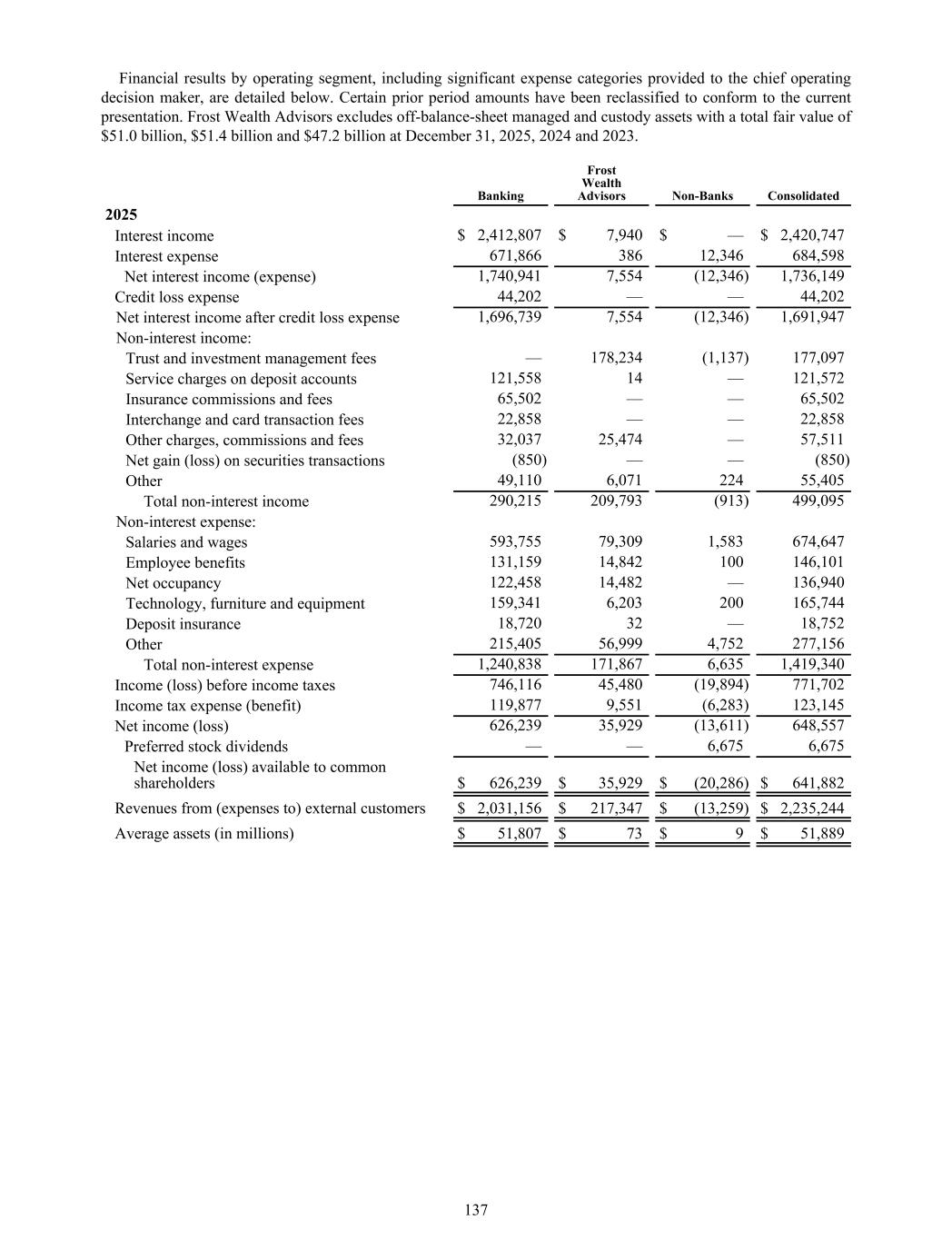 Financial results by operating segment, including significant expense categories provided to the chief operating decision maker, are detailed below. Certain prior period amounts have been reclassified to conform to the current presentation. Frost Wealth Advisors excludes off-balance-sheet managed and custody assets with a total fair value of $51.0 billion, $51.4 billion and $47.2 billion at December 31, 2025, 2024 and 2023. Banking Frost Wealth Advisors Non-Banks Consolidated 2025 Interest income $ 2,412,807 $ 7,940 $ — $ 2,420,747 Interest expense 671,866 386 12,346 684,598 Net interest income (expense) 1,740,941 7,554 (12,346) 1,736,149 Credit loss expense 44,202 — — 44,202 Net interest income after credit loss expense 1,696,739 7,554 (12,346) 1,691,947 Non-interest income: Trust and investment management fees — 178,234 (1,137) 177,097 Service charges on deposit accounts 121,558 14 — 121,572 Insurance commissions and fees 65,502 — — 65,502 Interchange and card transaction fees 22,858 — — 22,858 Other charges, commissions and fees 32,037 25,474 — 57,511 Net gain (loss) on securities transactions (850) — — (850) Other 49,110 6,071 224 55,405 Total non-interest income 290,215 209,793 (913) 499,095 Non-interest expense: Salaries and wages 593,755 79,309 1,583 674,647 Employee benefits 131,159 14,842 100 146,101 Net occupancy 122,458 14,482 — 136,940 Technology, furniture and equipment 159,341 6,203 200 165,744 Deposit insurance 18,720 32 — 18,752 Other 215,405 56,999 4,752 277,156 Total non-interest expense 1,240,838 171,867 6,635 1,419,340 Income (loss) before income taxes 746,116 45,480 (19,894) 771,702 Income tax expense (benefit) 119,877 9,551 (6,283) 123,145 Net income (loss) 626,239 35,929 (13,611) 648,557 Preferred stock dividends — — 6,675 6,675 Net income (loss) available to common shareholders $ 626,239 $ 35,929 $ (20,286) $ 641,882 Revenues from (expenses to) external customers $ 2,031,156 $ 217,347 $ (13,259) $ 2,235,244 Average assets (in millions) $ 51,807 $ 73 $ 9 $ 51,889 137