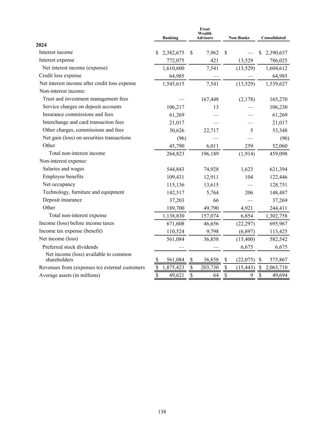 Banking Frost Wealth Advisors Non-Banks Consolidated 2024 Interest income $ 2,382,675 $ 7,962 $ — $ 2,390,637 Interest expense 772,075 421 13,529 786,025 Net interest income (expense) 1,610,600 7,541 (13,529) 1,604,612 Credit loss expense 64,985 — — 64,985 Net interest income after credit loss expense 1,545,615 7,541 (13,529) 1,539,627 Non-interest income: Trust and investment management fees — 167,448 (2,178) 165,270 Service charges on deposit accounts 106,217 13 — 106,230 Insurance commissions and fees 61,269 — — 61,269 Interchange and card transaction fees 21,017 — — 21,017 Other charges, commissions and fees 30,626 22,717 5 53,348 Net gain (loss) on securities transactions (96) — — (96) Other 45,790 6,011 259 52,060 Total non-interest income 264,823 196,189 (1,914) 459,098 Non-interest expense: Salaries and wages 544,843 74,928 1,623 621,394 Employee benefits 109,431 12,911 104 122,446 Net occupancy 115,136 13,615 — 128,751 Technology, furniture and equipment 142,517 5,764 206 148,487 Deposit insurance 37,203 66 — 37,269 Other 189,700 49,790 4,921 244,411 Total non-interest expense 1,138,830 157,074 6,854 1,302,758 Income (loss) before income taxes 671,608 46,656 (22,297) 695,967 Income tax expense (benefit) 110,524 9,798 (6,897) 113,425 Net income (loss) 561,084 36,858 (15,400) 582,542 Preferred stock dividends — — 6,675 6,675 Net income (loss) available to common shareholders $ 561,084 $ 36,858 $ (22,075) $ 575,867 Revenues from (expenses to) external customers $ 1,875,423 $ 203,730 $ (15,443) $ 2,063,710 Average assets (in millions) $ 49,621 $ 64 $ 9 $ 49,694 138