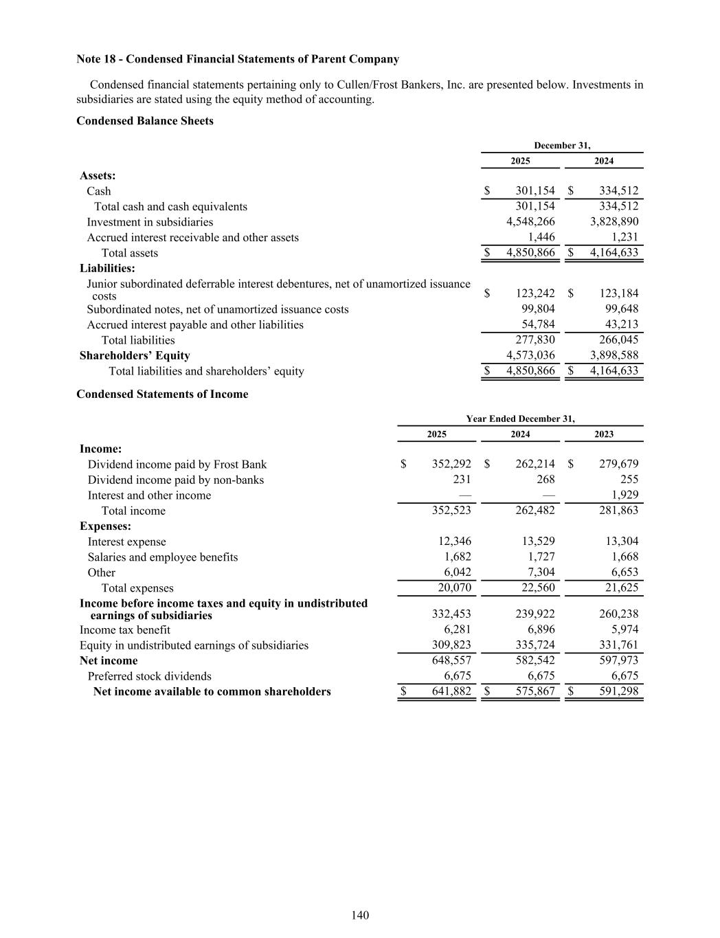Note 18 - Condensed Financial Statements of Parent Company Condensed financial statements pertaining only to Cullen/Frost Bankers, Inc. are presented below. Investments in subsidiaries are stated using the equity method of accounting. Condensed Balance Sheets December 31, 2025 2024 Assets: Cash $ 301,154 $ 334,512 Total cash and cash equivalents 301,154 334,512 Investment in subsidiaries 4,548,266 3,828,890 Accrued interest receivable and other assets 1,446 1,231 Total assets $ 4,850,866 $ 4,164,633 Liabilities: Junior subordinated deferrable interest debentures, net of unamortized issuance costs $ 123,242 $ 123,184 Subordinated notes, net of unamortized issuance costs 99,804 99,648 Accrued interest payable and other liabilities 54,784 43,213 Total liabilities 277,830 266,045 Shareholders’ Equity 4,573,036 3,898,588 Total liabilities and shareholders’ equity $ 4,850,866 $ 4,164,633 Condensed Statements of Income Year Ended December 31, 2025 2024 2023 Income: Dividend income paid by Frost Bank $ 352,292 $ 262,214 $ 279,679 Dividend income paid by non-banks 231 268 255 Interest and other income — — 1,929 Total income 352,523 262,482 281,863 Expenses: Interest expense 12,346 13,529 13,304 Salaries and employee benefits 1,682 1,727 1,668 Other 6,042 7,304 6,653 Total expenses 20,070 22,560 21,625 Income before income taxes and equity in undistributed earnings of subsidiaries 332,453 239,922 260,238 Income tax benefit 6,281 6,896 5,974 Equity in undistributed earnings of subsidiaries 309,823 335,724 331,761 Net income 648,557 582,542 597,973 Preferred stock dividends 6,675 6,675 6,675 Net income available to common shareholders $ 641,882 $ 575,867 $ 591,298 140