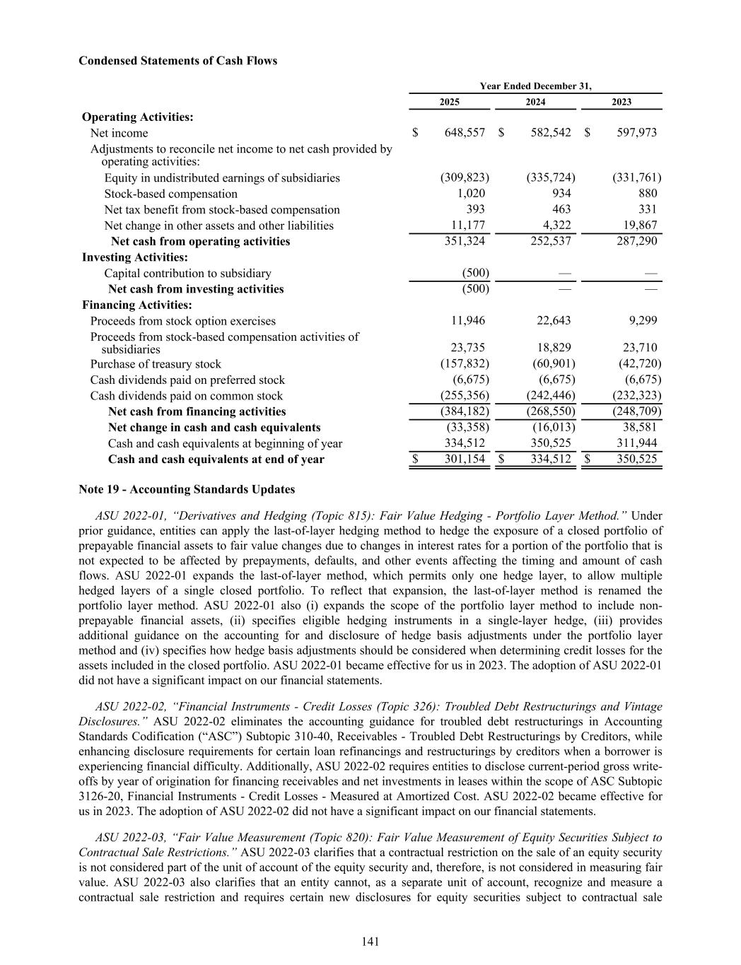 Condensed Statements of Cash Flows Year Ended December 31, 2025 2024 2023 Operating Activities: Net income $ 648,557 $ 582,542 $ 597,973 Adjustments to reconcile net income to net cash provided by operating activities: Equity in undistributed earnings of subsidiaries (309,823) (335,724) (331,761) Stock-based compensation 1,020 934 880 Net tax benefit from stock-based compensation 393 463 331 Net change in other assets and other liabilities 11,177 4,322 19,867 Net cash from operating activities 351,324 252,537 287,290 Investing Activities: Capital contribution to subsidiary (500) — — Net cash from investing activities (500) — — Financing Activities: Proceeds from stock option exercises 11,946 22,643 9,299 Proceeds from stock-based compensation activities of subsidiaries 23,735 18,829 23,710 Purchase of treasury stock (157,832) (60,901) (42,720) Cash dividends paid on preferred stock (6,675) (6,675) (6,675) Cash dividends paid on common stock (255,356) (242,446) (232,323) Net cash from financing activities (384,182) (268,550) (248,709) Net change in cash and cash equivalents (33,358) (16,013) 38,581 Cash and cash equivalents at beginning of year 334,512 350,525 311,944 Cash and cash equivalents at end of year $ 301,154 $ 334,512 $ 350,525 Note 19 - Accounting Standards Updates ASU 2022-01, “Derivatives and Hedging (Topic 815): Fair Value Hedging - Portfolio Layer Method.” Under prior guidance, entities can apply the last-of-layer hedging method to hedge the exposure of a closed portfolio of prepayable financial assets to fair value changes due to changes in interest rates for a portion of the portfolio that is not expected to be affected by prepayments, defaults, and other events affecting the timing and amount of cash flows. ASU 2022-01 expands the last-of-layer method, which permits only one hedge layer, to allow multiple hedged layers of a single closed portfolio. To reflect that expansion, the last-of-layer method is renamed the portfolio layer method. ASU 2022-01 also (i) expands the scope of the portfolio layer method to include non- prepayable financial assets, (ii) specifies eligible hedging instruments in a single-layer hedge, (iii) provides additional guidance on the accounting for and disclosure of hedge basis adjustments under the portfolio layer method and (iv) specifies how hedge basis adjustments should be considered when determining credit losses for the assets included in the closed portfolio. ASU 2022-01 became effective for us in 2023. The adoption of ASU 2022-01 did not have a significant impact on our financial statements. ASU 2022-02, “Financial Instruments - Credit Losses (Topic 326): Troubled Debt Restructurings and Vintage Disclosures.” ASU 2022-02 eliminates the accounting guidance for troubled debt restructurings in Accounting Standards Codification (“ASC”) Subtopic 310-40, Receivables - Troubled Debt Restructurings by Creditors, while enhancing disclosure requirements for certain loan refinancings and restructurings by creditors when a borrower is experiencing financial difficulty. Additionally, ASU 2022-02 requires entities to disclose current-period gross write- offs by year of origination for financing receivables and net investments in leases within the scope of ASC Subtopic 3126-20, Financial Instruments - Credit Losses - Measured at Amortized Cost. ASU 2022-02 became effective for us in 2023. The adoption of ASU 2022-02 did not have a significant impact on our financial statements. ASU 2022-03, “Fair Value Measurement (Topic 820): Fair Value Measurement of Equity Securities Subject to Contractual Sale Restrictions.” ASU 2022-03 clarifies that a contractual restriction on the sale of an equity security is not considered part of the unit of account of the equity security and, therefore, is not considered in measuring fair value. ASU 2022-03 also clarifies that an entity cannot, as a separate unit of account, recognize and measure a contractual sale restriction and requires certain new disclosures for equity securities subject to contractual sale 141