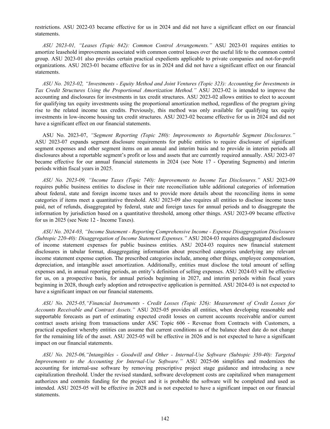 restrictions. ASU 2022-03 became effective for us in 2024 and did not have a significant effect on our financial statements. ASU 2023-01, “Leases (Topic 842): Common Control Arrangements.” ASU 2023-01 requires entities to amortize leasehold improvements associated with common control leases over the useful life to the common control group. ASU 2023-01 also provides certain practical expedients applicable to private companies and not-for-profit organizations. ASU 2023-01 became effective for us in 2024 and did not have a significant effect on our financial statements. ASU No. 2023-02, “Investments - Equity Method and Joint Ventures (Topic 323): Accounting for Investments in Tax Credit Structures Using the Proportional Amortization Method.” ASU 2023-02 is intended to improve the accounting and disclosures for investments in tax credit structures. ASU 2023-02 allows entities to elect to account for qualifying tax equity investments using the proportional amortization method, regardless of the program giving rise to the related income tax credits. Previously, this method was only available for qualifying tax equity investments in low-income housing tax credit structures. ASU 2023-02 became effective for us in 2024 and did not have a significant effect on our financial statements. ASU No. 2023-07, “Segment Reporting (Topic 280): Improvements to Reportable Segment Disclosures.” ASU 2023-07 expands segment disclosure requirements for public entities to require disclosure of significant segment expenses and other segment items on an annual and interim basis and to provide in interim periods all disclosures about a reportable segment’s profit or loss and assets that are currently required annually. ASU 2023-07 became effective for our annual financial statements in 2024 (see Note 17 - Operating Segments) and interim periods within fiscal years in 2025. ASU No. 2023-09, “Income Taxes (Topic 740): Improvements to Income Tax Disclosures.” ASU 2023-09 requires public business entities to disclose in their rate reconciliation table additional categories of information about federal, state and foreign income taxes and to provide more details about the reconciling items in some categories if items meet a quantitative threshold. ASU 2023-09 also requires all entities to disclose income taxes paid, net of refunds, disaggregated by federal, state and foreign taxes for annual periods and to disaggregate the information by jurisdiction based on a quantitative threshold, among other things. ASU 2023-09 became effective for us in 2025 (see Note 12 - Income Taxes). ASU No. 2024-03, “Income Statement - Reporting Comprehensive Income - Expense Disaggregation Disclosures (Subtopic 220-40): Disaggregation of Income Statement Expenses.” ASU 2024-03 requires disaggregated disclosure of income statement expenses for public business entities. ASU 2024-03 requires new financial statement disclosures in tabular format, disaggregating information about prescribed categories underlying any relevant income statement expense caption. The prescribed categories include, among other things, employee compensation, depreciation, and intangible asset amortization. Additionally, entities must disclose the total amount of selling expenses and, in annual reporting periods, an entity’s definition of selling expenses. ASU 2024-03 will be effective for us, on a prospective basis, for annual periods beginning in 2027, and interim periods within fiscal years beginning in 2028, though early adoption and retrospective application is permitted. ASU 2024-03 is not expected to have a significant impact on our financial statements. ASU No. 2025-05,“Financial Instruments - Credit Losses (Topic 326): Measurement of Credit Losses for Accounts Receivable and Contract Assets.” ASU 2025-05 provides all entities, when developing reasonable and supportable forecasts as part of estimating expected credit losses on current accounts receivable and/or current contract assets arising from transactions under ASC Topic 606 - Revenue from Contracts with Customers, a practical expedient whereby entities can assume that current conditions as of the balance sheet date do not change for the remaining life of the asset. ASU 2025-05 will be effective in 2026 and is not expected to have a significant impact on our financial statements. ASU No. 2025-06,“Intangibles - Goodwill and Other - Internal-Use Software (Subtopic 350-40): Targeted Improvements to the Accounting for Internal-Use Software.” ASU 2025-06 simplifies and modernizes the accounting for internal-use software by removing prescriptive project stage guidance and introducing a new capitalization threshold. Under the revised standard, software development costs are capitalized when management authorizes and commits funding for the project and it is probable the software will be completed and used as intended. ASU 2025-05 will be effective in 2028 and is not expected to have a significant impact on our financial statements. 142